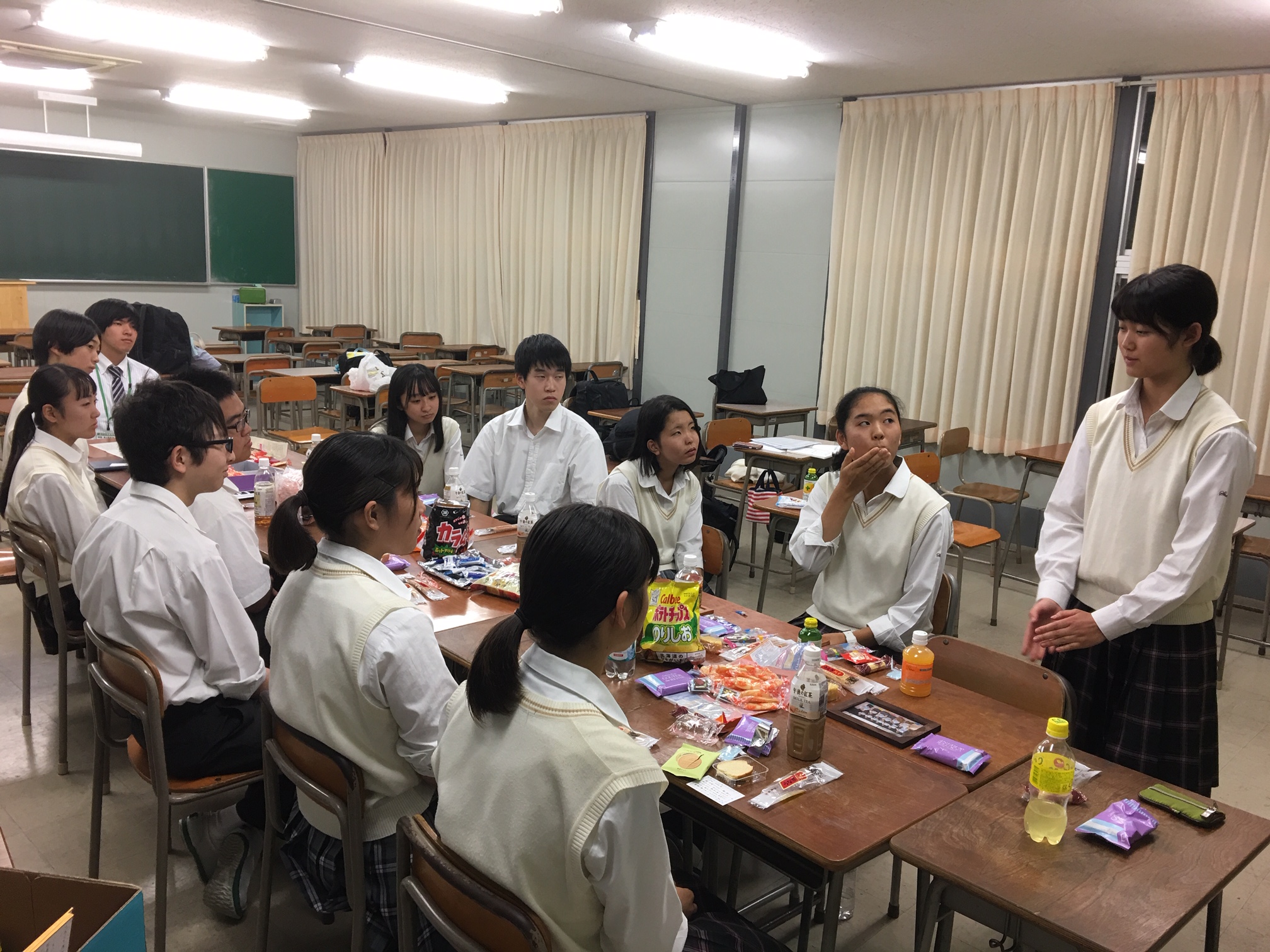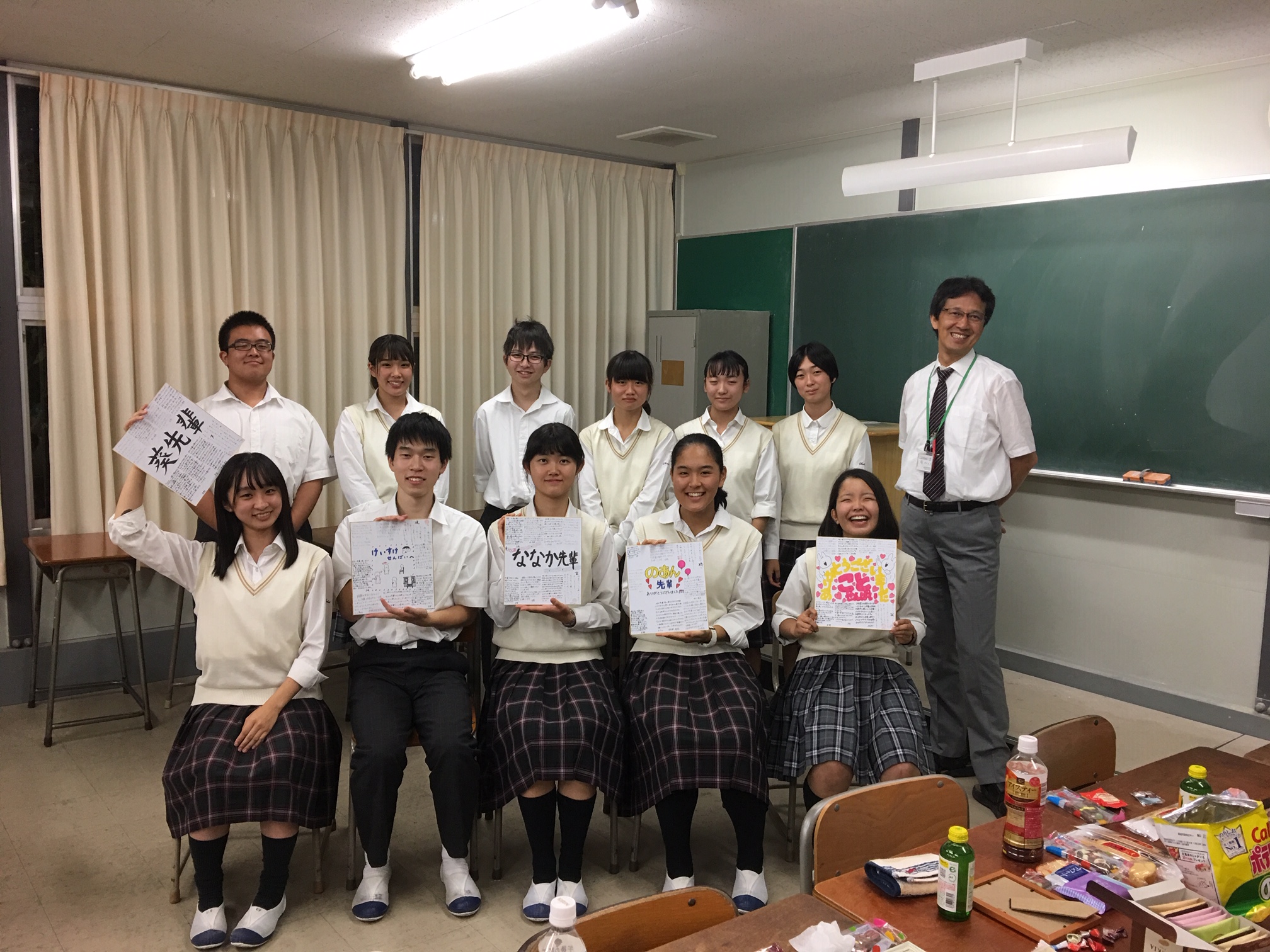 4号館で3年生引退式を行いました。卒業生や後援者の方からの山のような差し入れを前に、笑い声の絶えない茶話会です。