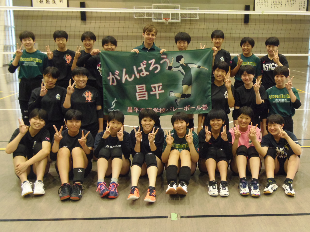 夏休みに何度かサブアリーナの練習見学にベンジャミン先生が来られました。スポーツを見るのが大好きという先生がサプライズで女子バレーボール部の応援旗を作ってプレゼントしてくれました。本当にありがとうございました。これからも頑張ります!