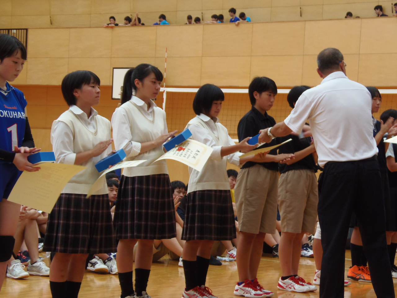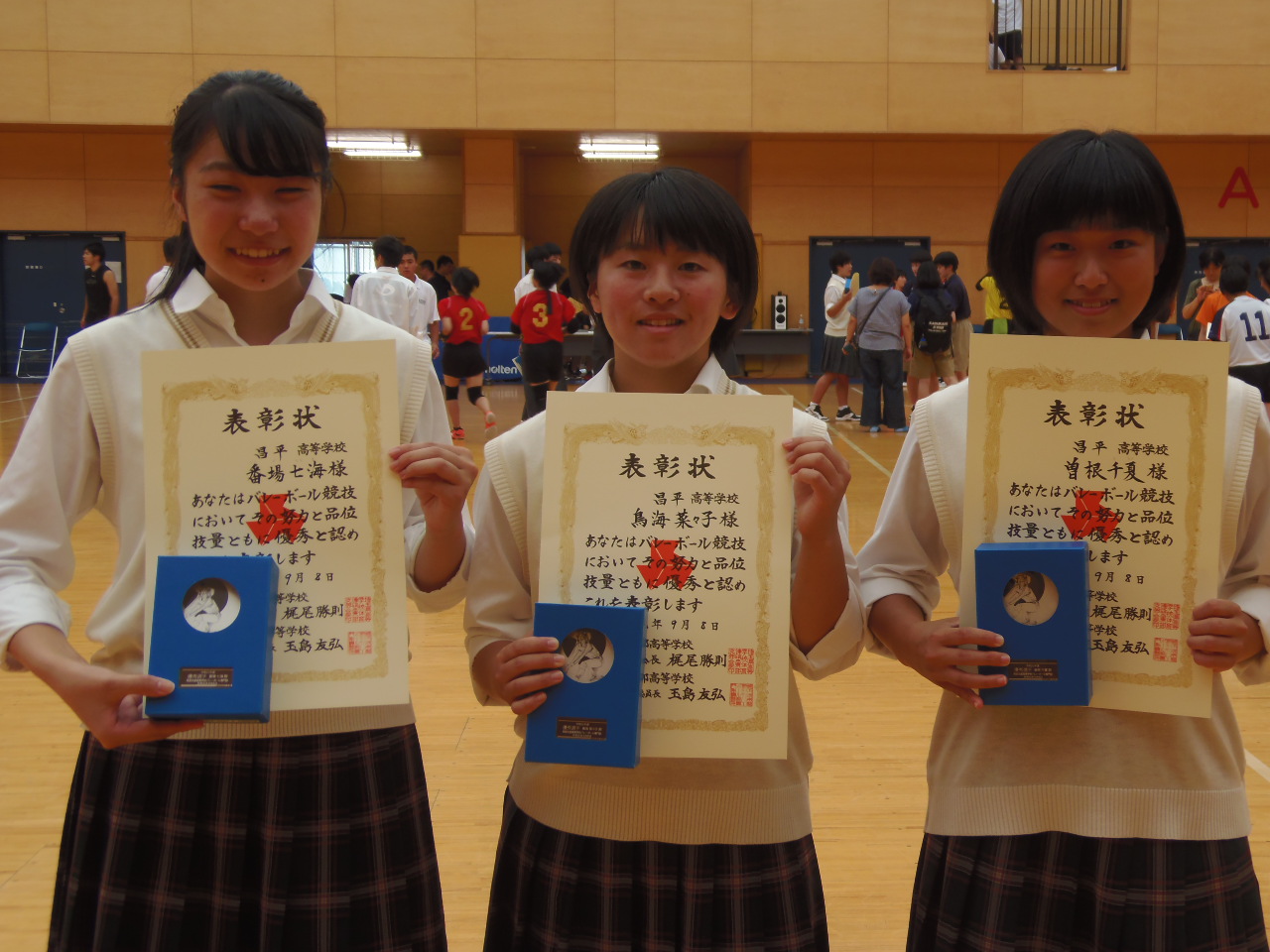 9月8日(日)に獨協埼玉高校において東部支部技術講習会が実施されました。各校より選抜された選手がそれぞれのユニフォームを着用し、午前中は実技講習会、午後はゲームを実施し東部選抜の選考会となりました。本校からは、サイドプレーヤー(OH)の林 優稀(2年167㎝・黒浜西中学出身)が選考されました。また、午前の実技終了後東部支部優秀選手表彰式が行われ、3年生の鳥海 菜々子(リベロ・春日部東中学出身)・曽根 千夏(セッター・淑徳SC中学出身)・番場 七海(センター・栗橋西中学出身)、三名がそれぞれ表彰されました。チーム一丸となって取り組んだ結果の表彰でした。チームメイトに感謝するととも、にここまで応援してくださった保護者・卒業生の皆様にも感謝いたします。ありがとうございました。
