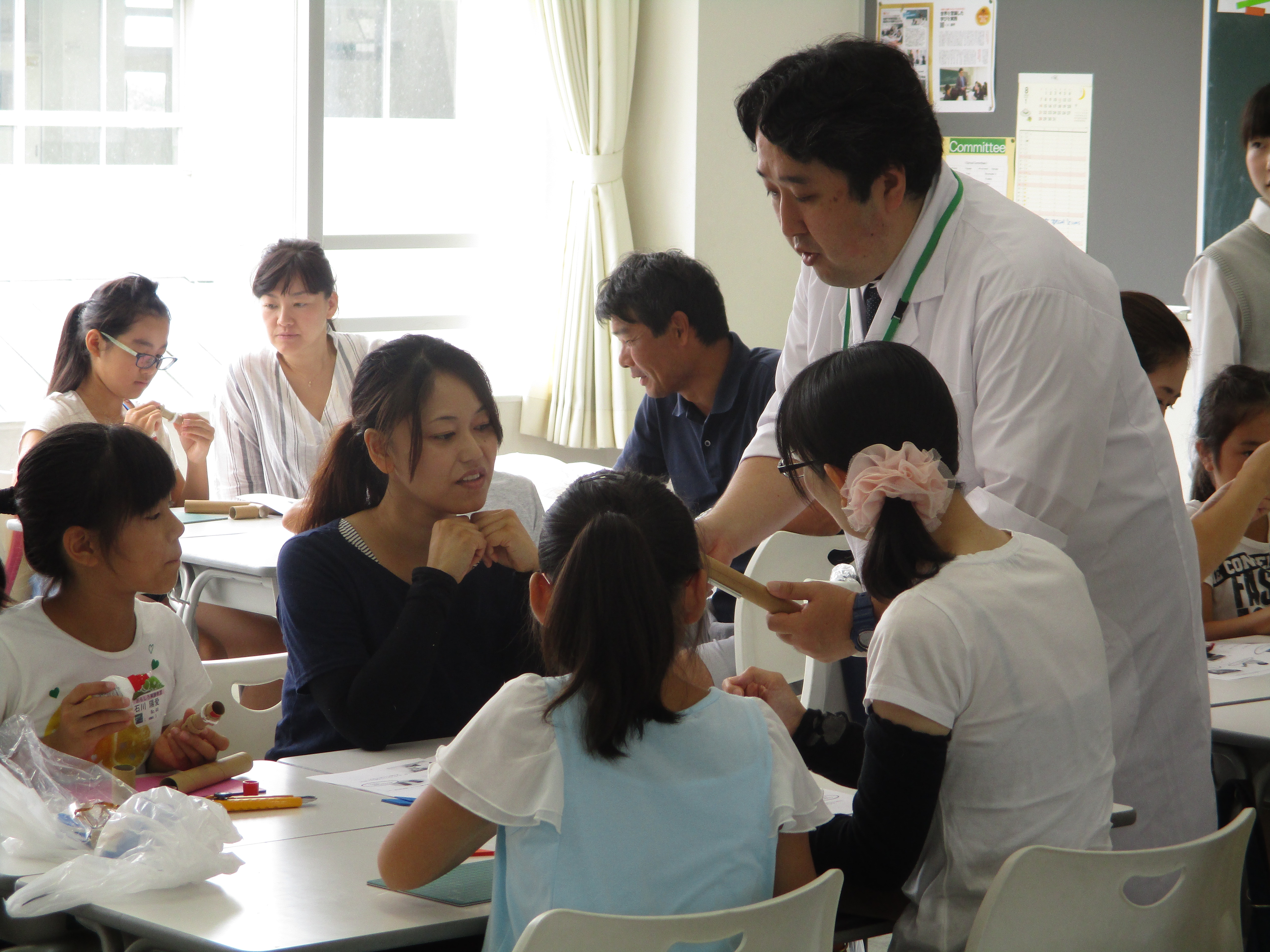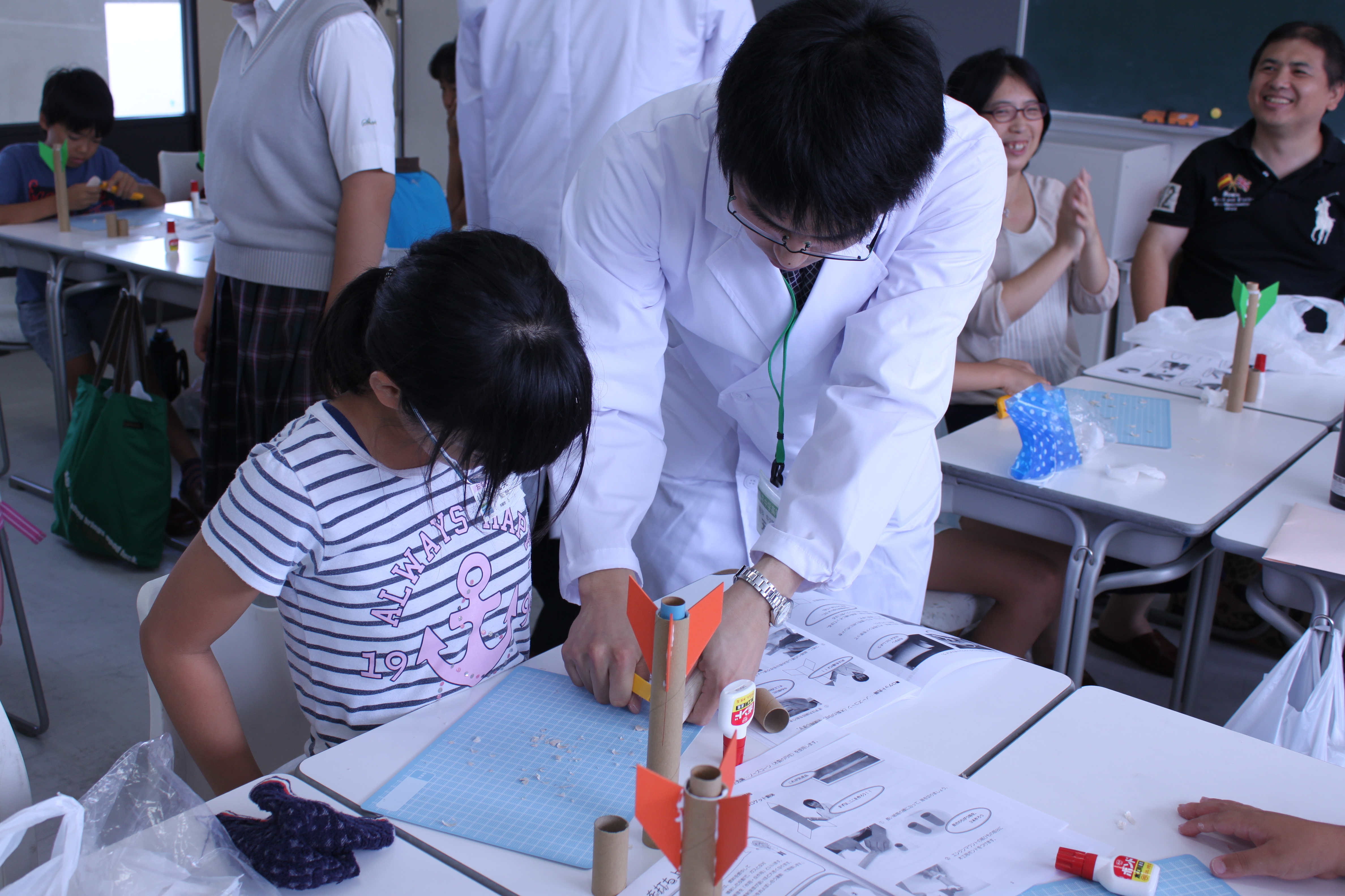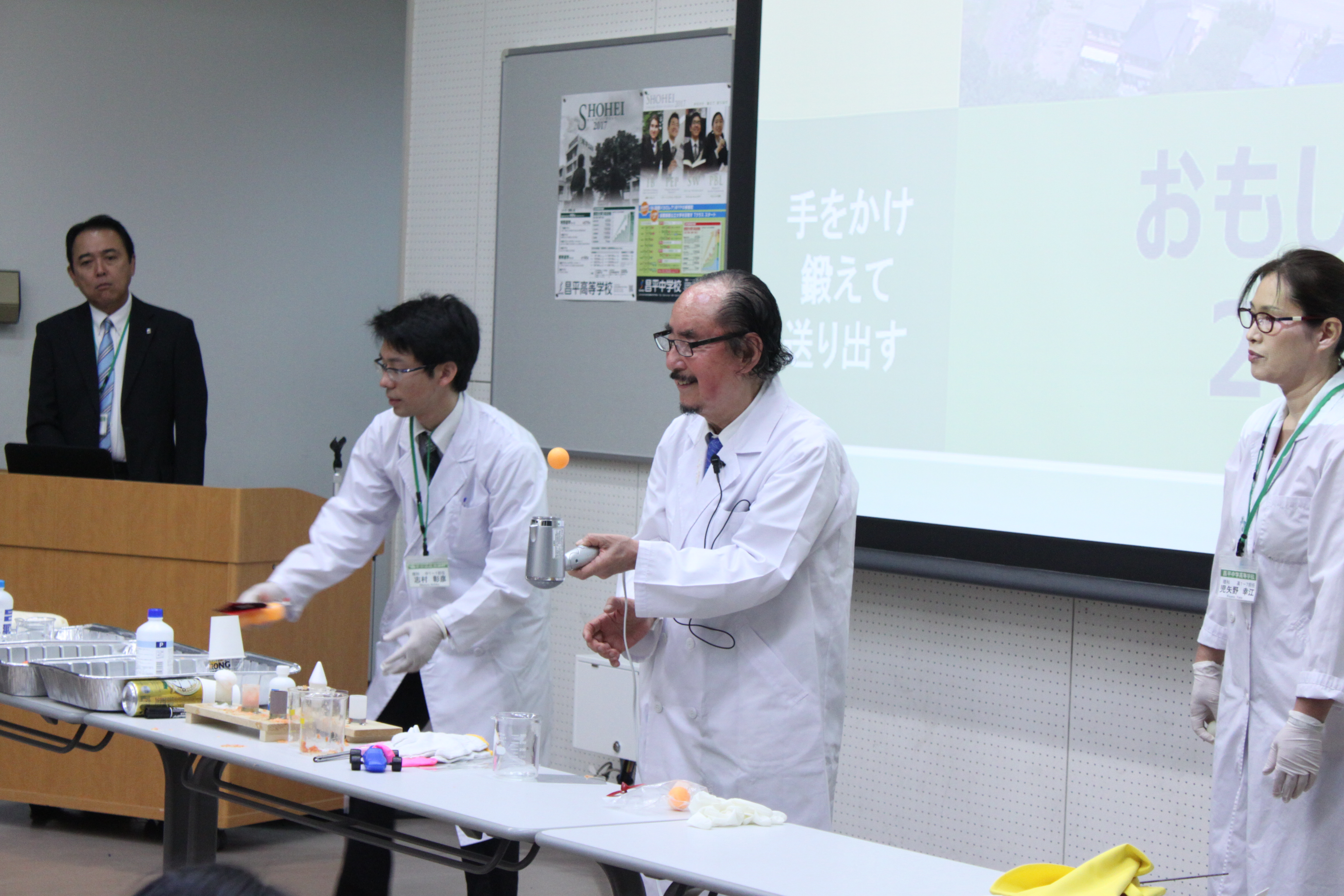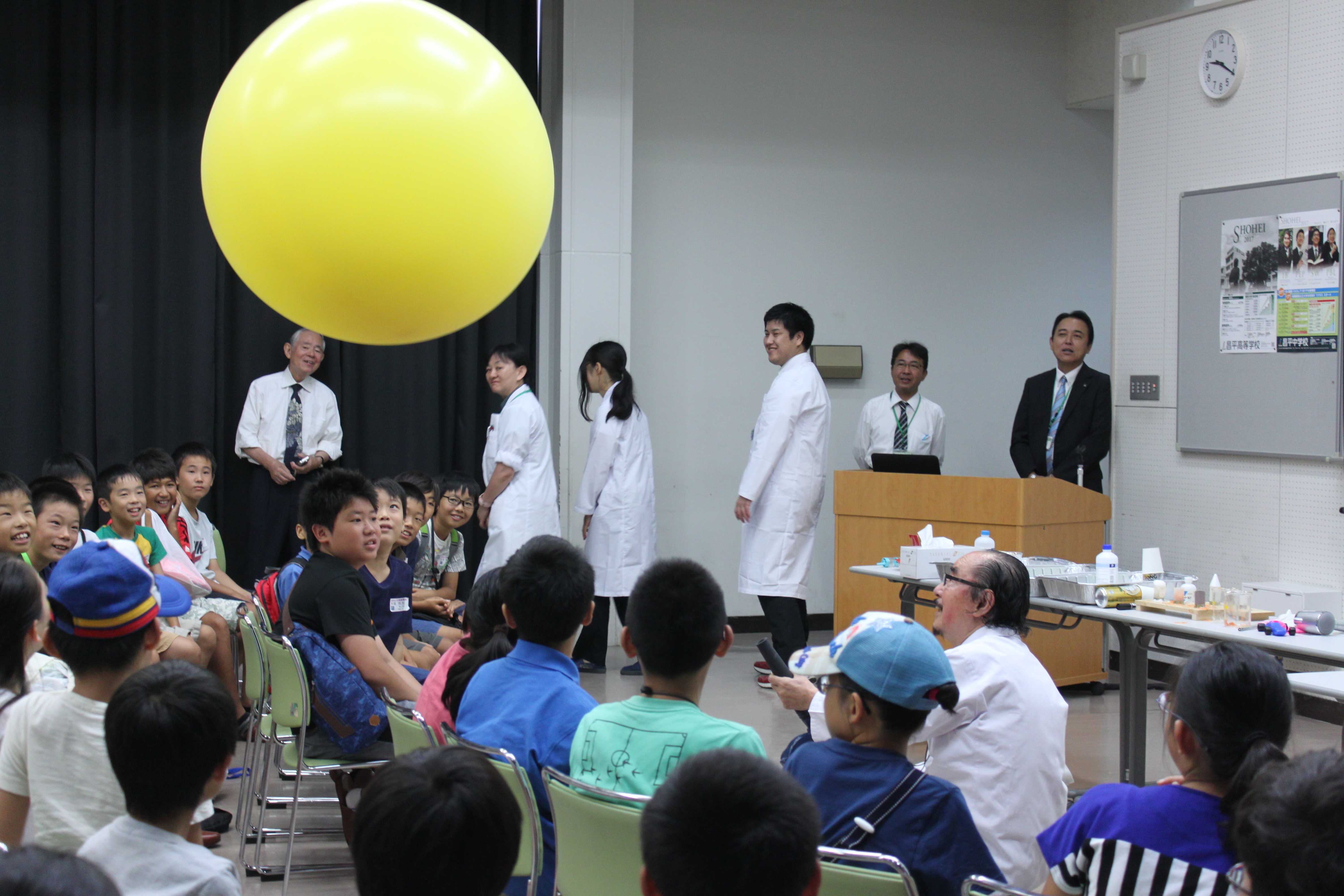 8月21日(日)東京電機大学教授高橋 宏先生を講師に招いて「おもしろ実験教室」が本校にて行われました。当日は多くの小学生、保護者の皆様が来校し、巨大バルーンが浮く仕組みや、野菜ロケットがアルコールで飛ぶ実験などを高橋先生が行い、参加した児童たちは驚きの表情をしたり、大きな歓声を上げたりして理科の実験の楽しさを味わっていました。その後、実際にロケットを親子で作成し、NASAの火薬を詰め、グラウンドにて発射しました。校舎の4階まで届くロケットに歓声が上がったり、うまくパラシュートが開いたときには大喜びの様子でした。理科の面白さを体験し、夏休みのいい思い出になったのではないでしょうか。またのご来校をお待ちしております。