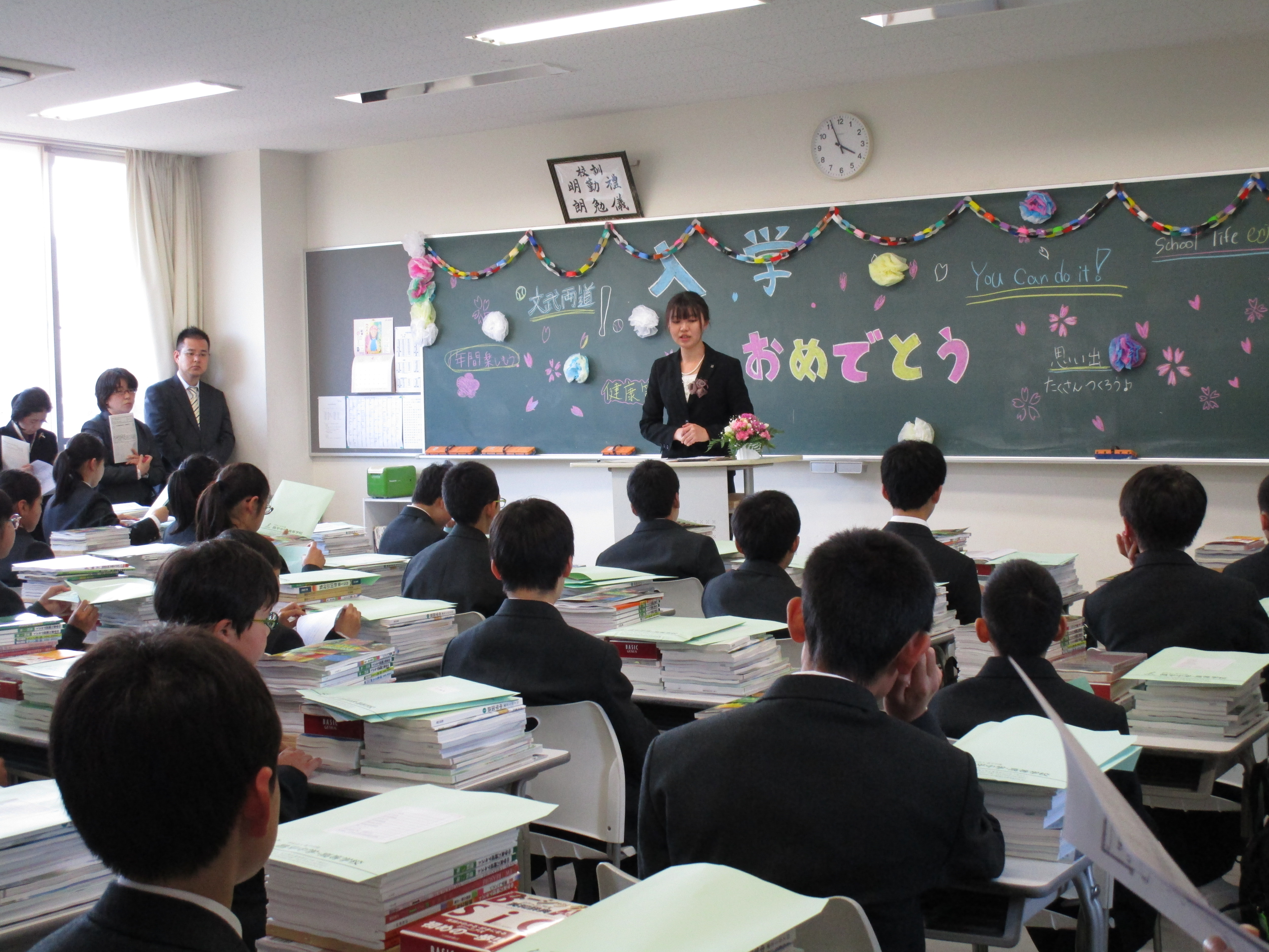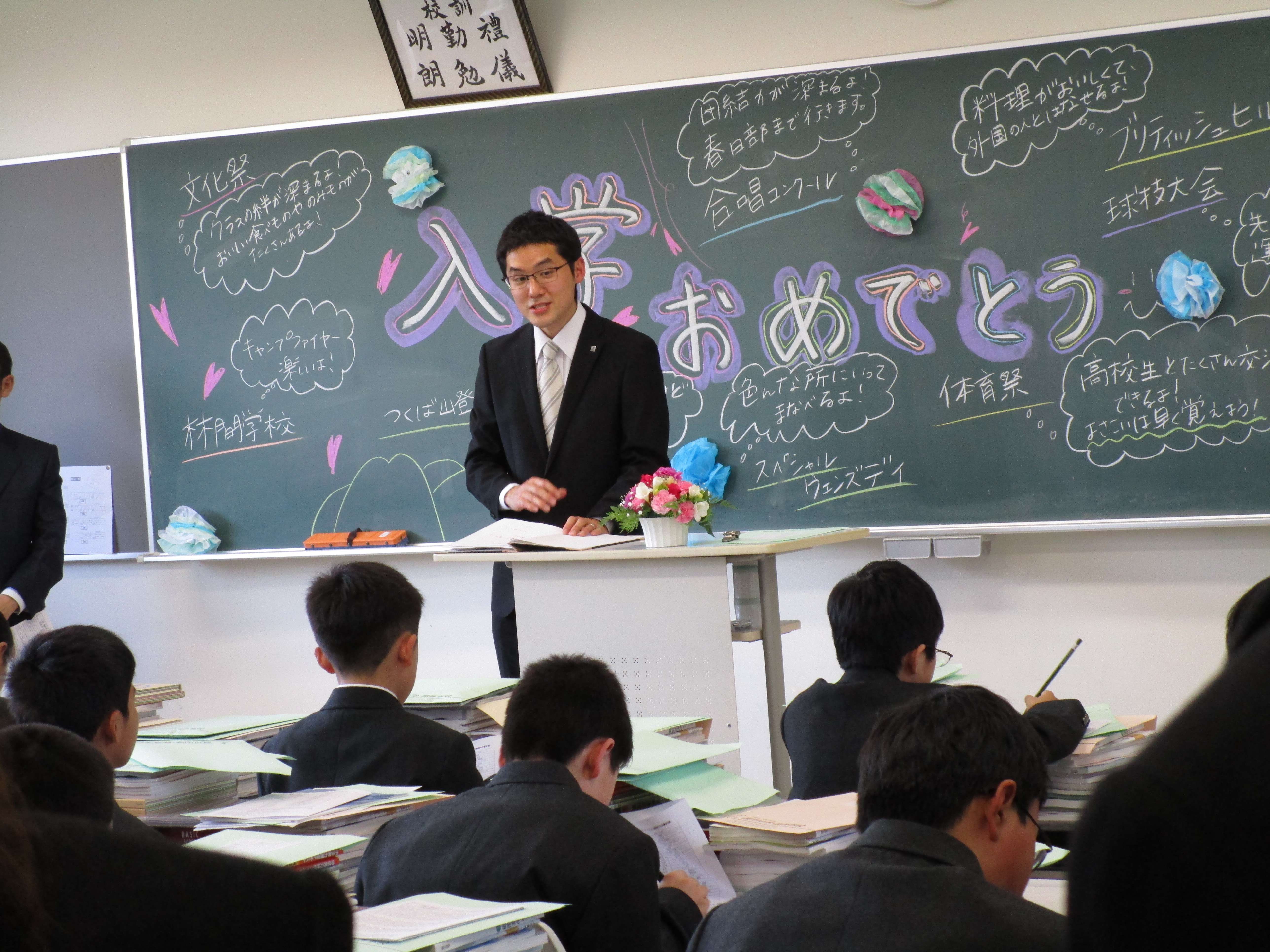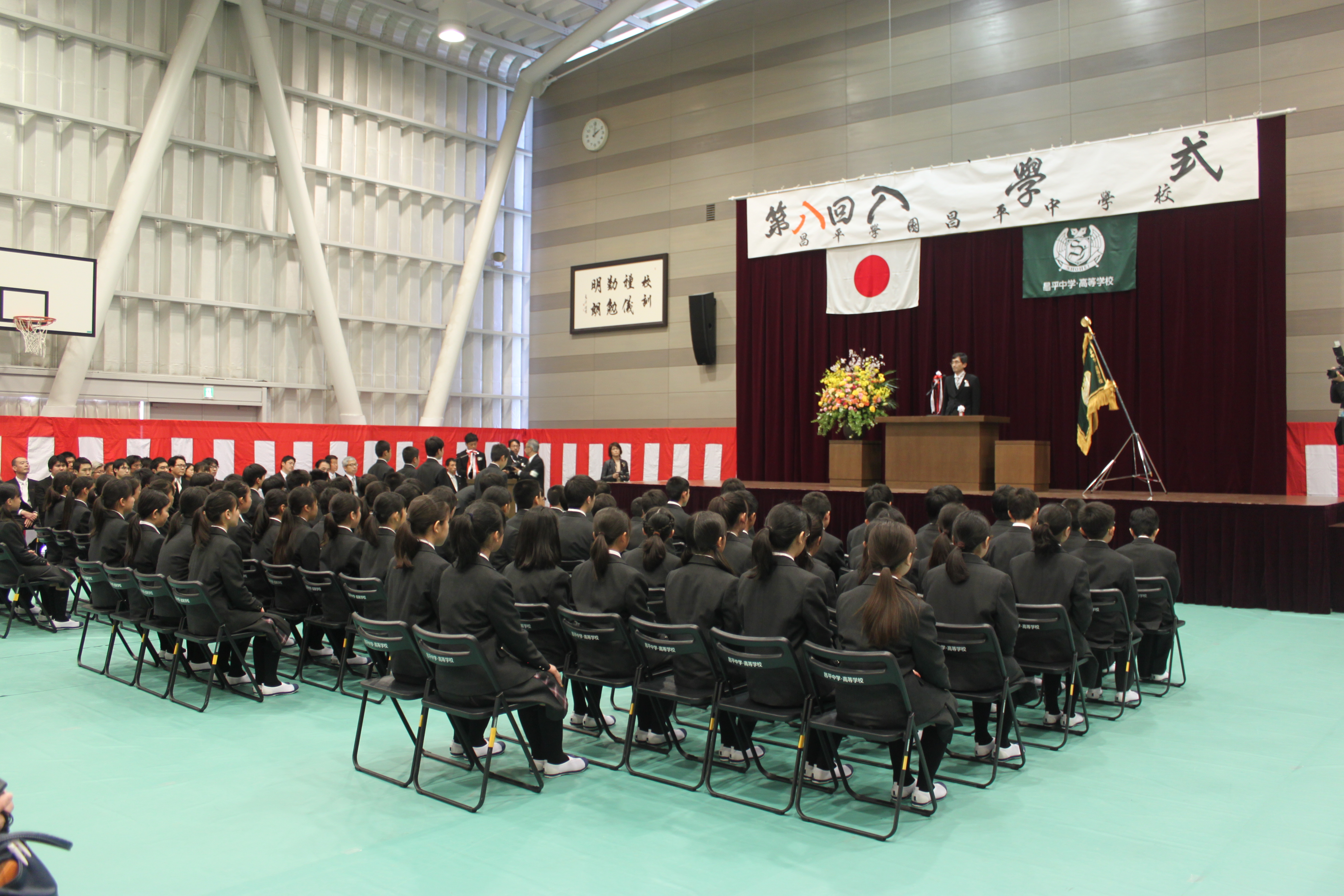 八期生の入学式が行われ、まだ少し大きな制服に身を包んだ一年生85名が昌平中学校の仲間入りをしました。昨夜からの雨がうそのように入学式前にきれいな青空に変わり、桜も満開、というこれ以上ないほどの素晴らしい出発の日となりました。入学式では緊張した表情の中にも受験を乗り越えてきた誇りが感じられ、入学者呼名での返事にも意欲が満ちあふれていて立派でした。入学式後のLHR(ホームルーム)では、各担任からの話があり、これからの学校生活へ気を引き締めていました。各生徒の机上には多くの教材が乗せられていました。来週から少しずつ授業も始まります。先輩達のように学習、行事、部活等すべてに全力を出していきましょう。