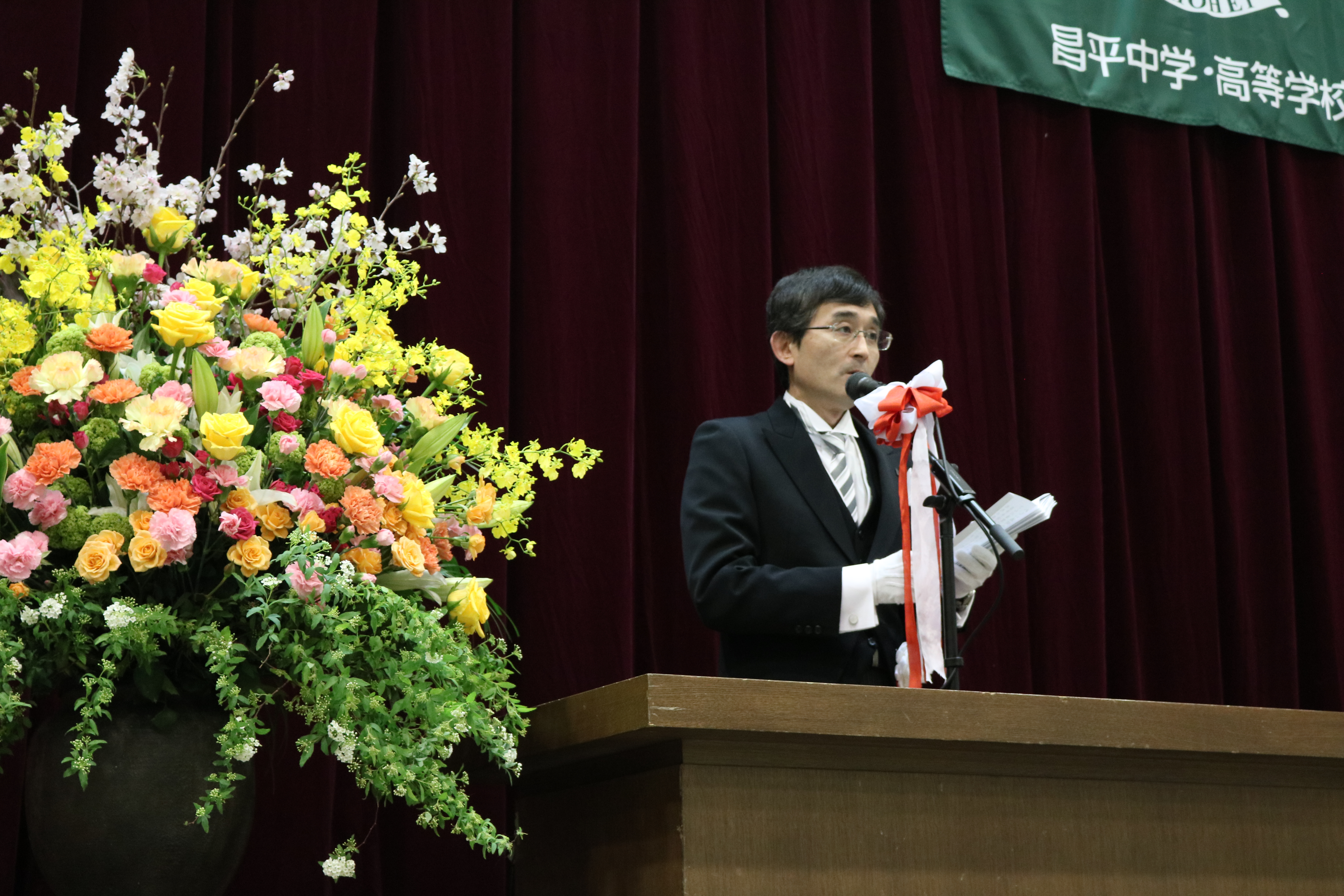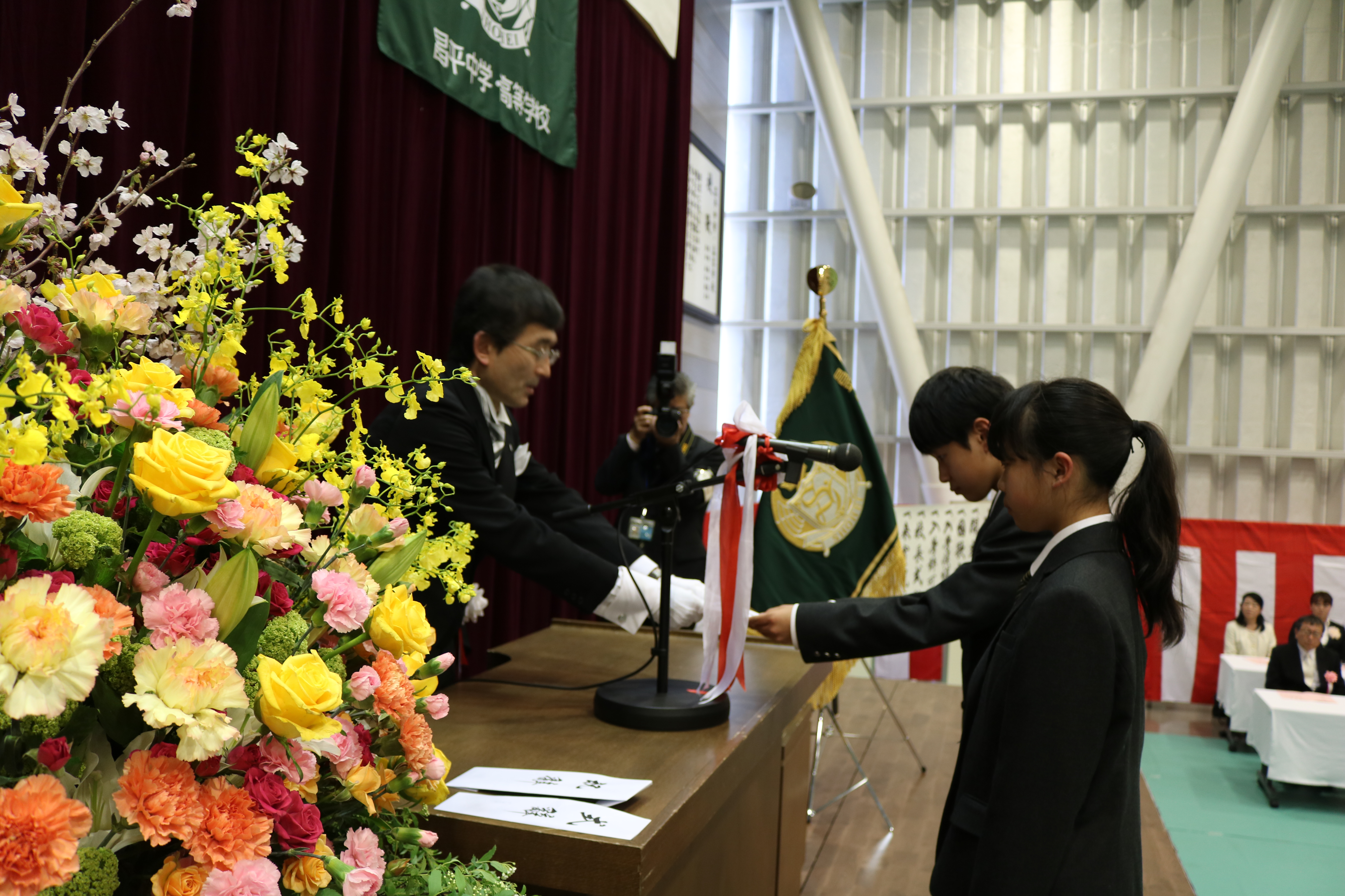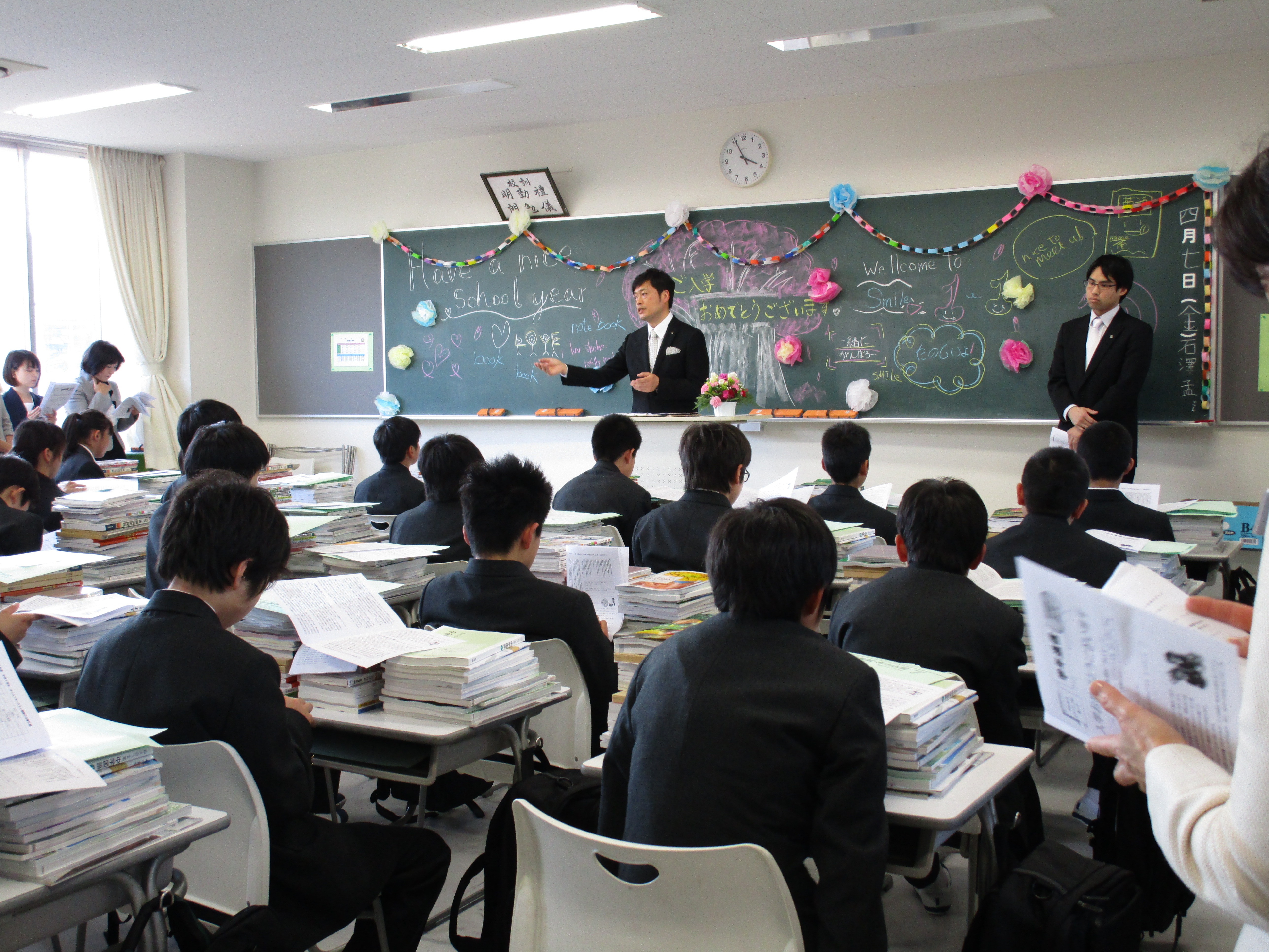 八期生の入学式が行われ、まだ少し大きな制服に身を包んだ一年生85名が昌平中学校の仲間入りをしました。昨夜からの雨がうそのように入学式前にきれいな青空に変わり、桜も満開、というこれ以上ないほどの素晴らしい出発の日となりました。入学式では緊張した表情の中にも受験を乗り越えてきた誇りが感じられ、入学者呼名での返事にも意欲が満ちあふれていて立派でした。入学式後のLHR(ホームルーム)では、各担任からの話があり、これからの学校生活へ気を引き締めていました。各生徒の机上には多くの教材が乗せられていました。来週から少しずつ授業も始まります。先輩達のように学習、行事、部活等すべてに全力を出していきましょう。