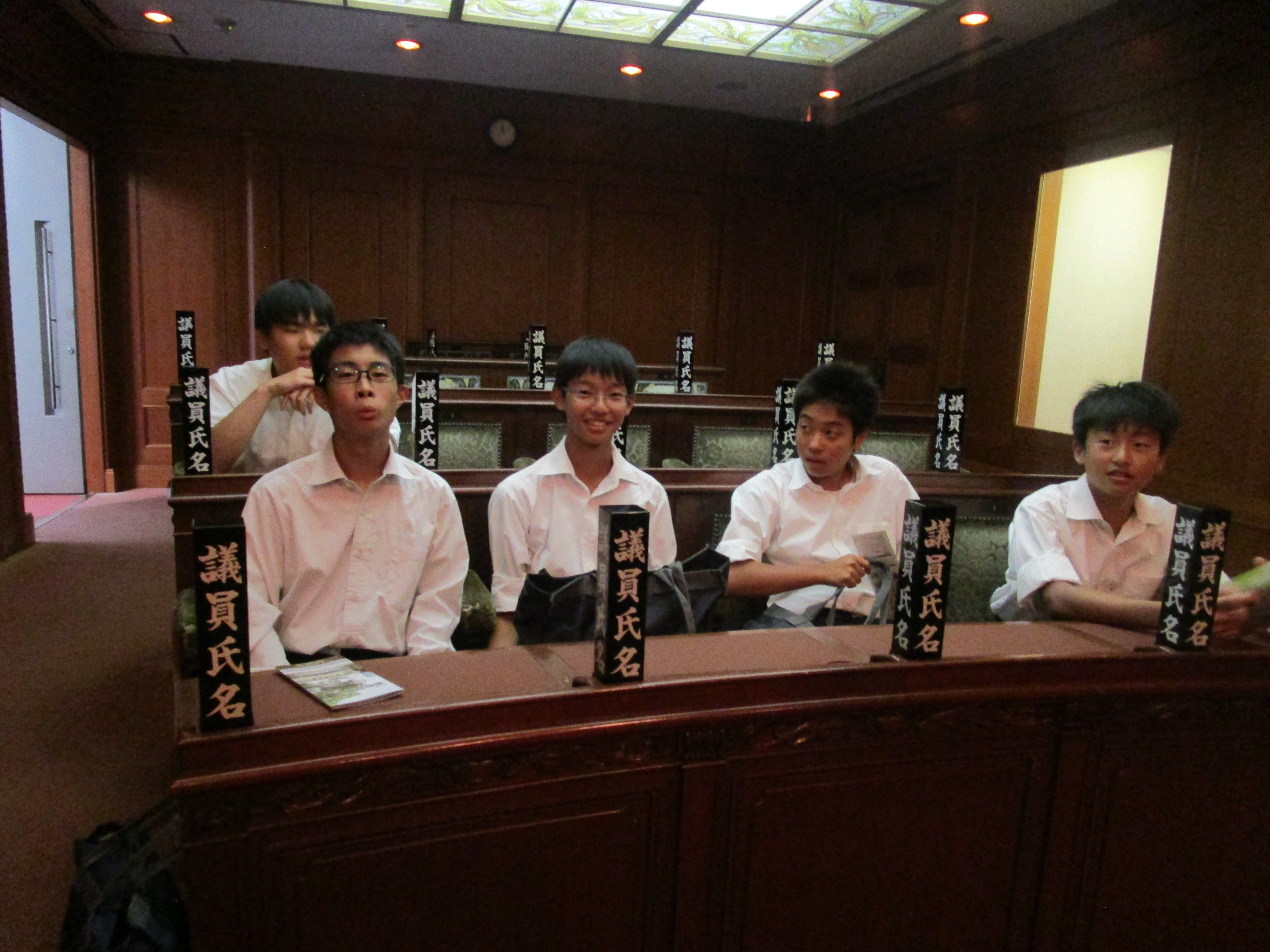 3年生は日本の中心で国を動かす機能を学ぶために、3つの施設を見学しました。裁判所では窃盗や詐欺等の刑事事件で立件された裁判を実際に見るということで、生徒達の表情もだいぶ緊張しているように見えました。被告人や証人の立場に立って様々なことを感じ、学んだようでした。次に見学したのは憲政記念館で、実際に演台を模したセットで演説を真似てみたり、パソコンで立法の仕組みを学んだりしました。参議院では議場を見学したり、実際に少年法改正案の審議を代表者14名が大臣や委員長などになり体験しました。最後には見ている生徒達で「賛成」「反対」のボタンを自分の考えで押し、少年法改正案は体験版の委員会では可決されました。普段はあまり知ることのできない国を動かす中心部で一日過ごし、多くのことを感じ、学んだ校外学習となりました。