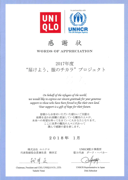 中学2年生はプロジェクト学習の一環として、ユニクロ”届けよう、服のチカラ”プロジェクトに参加し、服を回収して途上国の子どもたちに服を届ける活動を行いました。先日はユニクロ、国連難民高等弁務官事務所より感謝状が届きました。校内だけでなく、近隣の小学校や幼稚園、保育園の方々、学校説明会に来て下さった方々にも協力をしていただきました。みなさまありがとうございました。この活動を踏まえ、生徒たちは3年生では自分で奉仕活動を企画し、実施します。