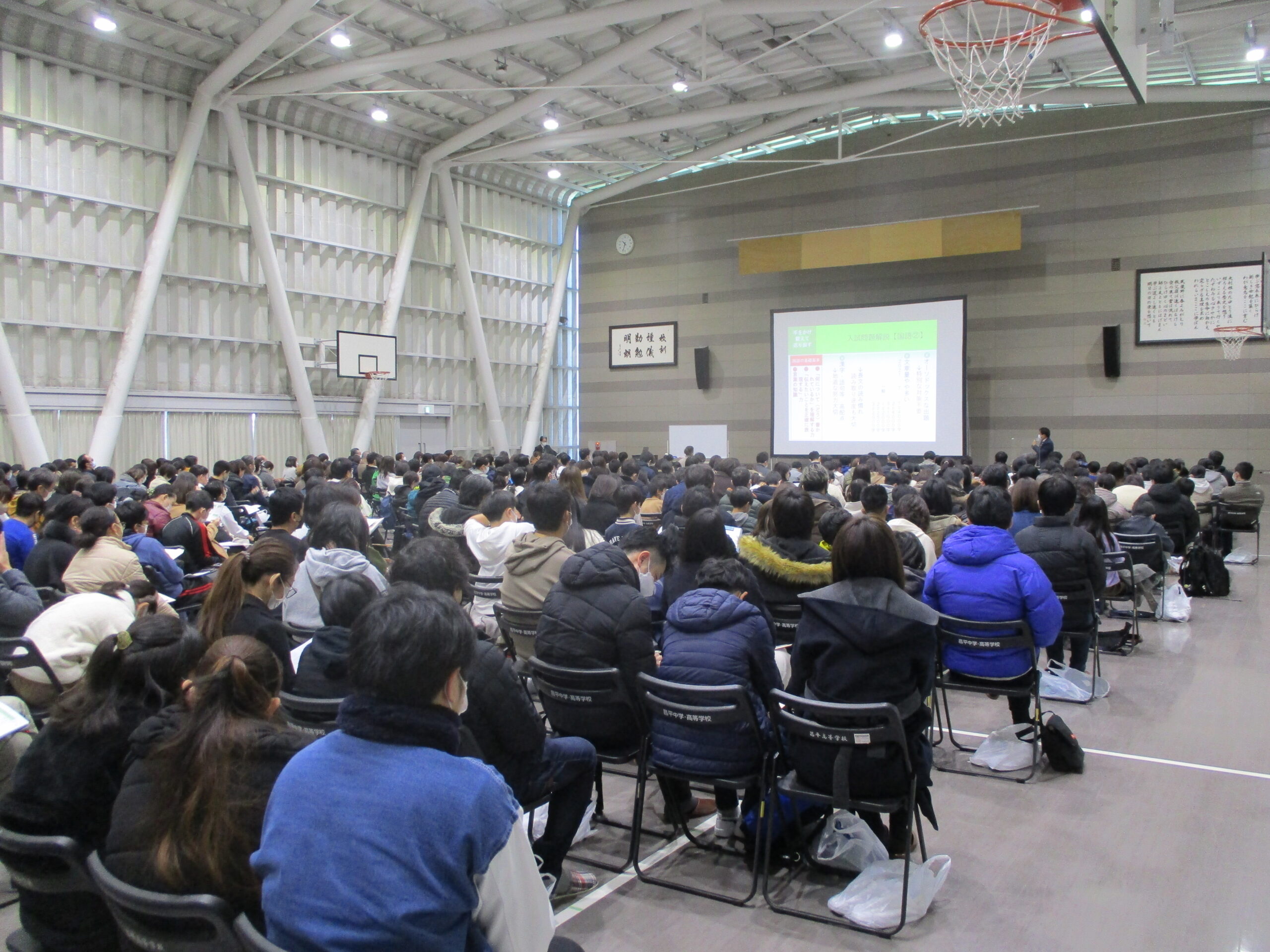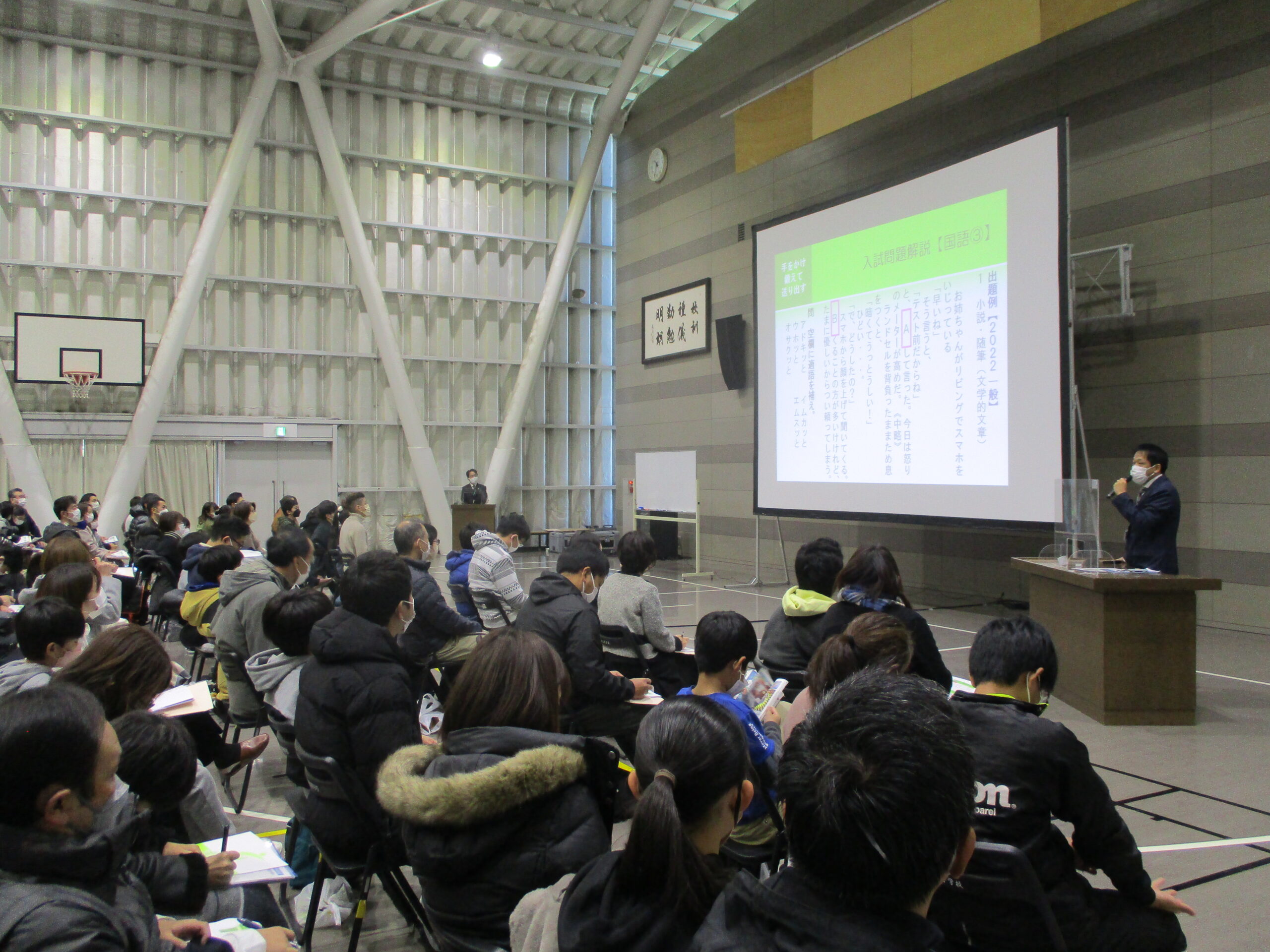 今年度最後の説明会の様子です。最初に学校長から挨拶と概要説明がありました。その後、入試直前対策講座として、国語、算数、社会、理科の各担当者が、入試に役立つ具体的なアドバイスを行いました。会場のサブアリーナが一杯になるほどの来場者を迎え、盛況のうちに終了することができました。