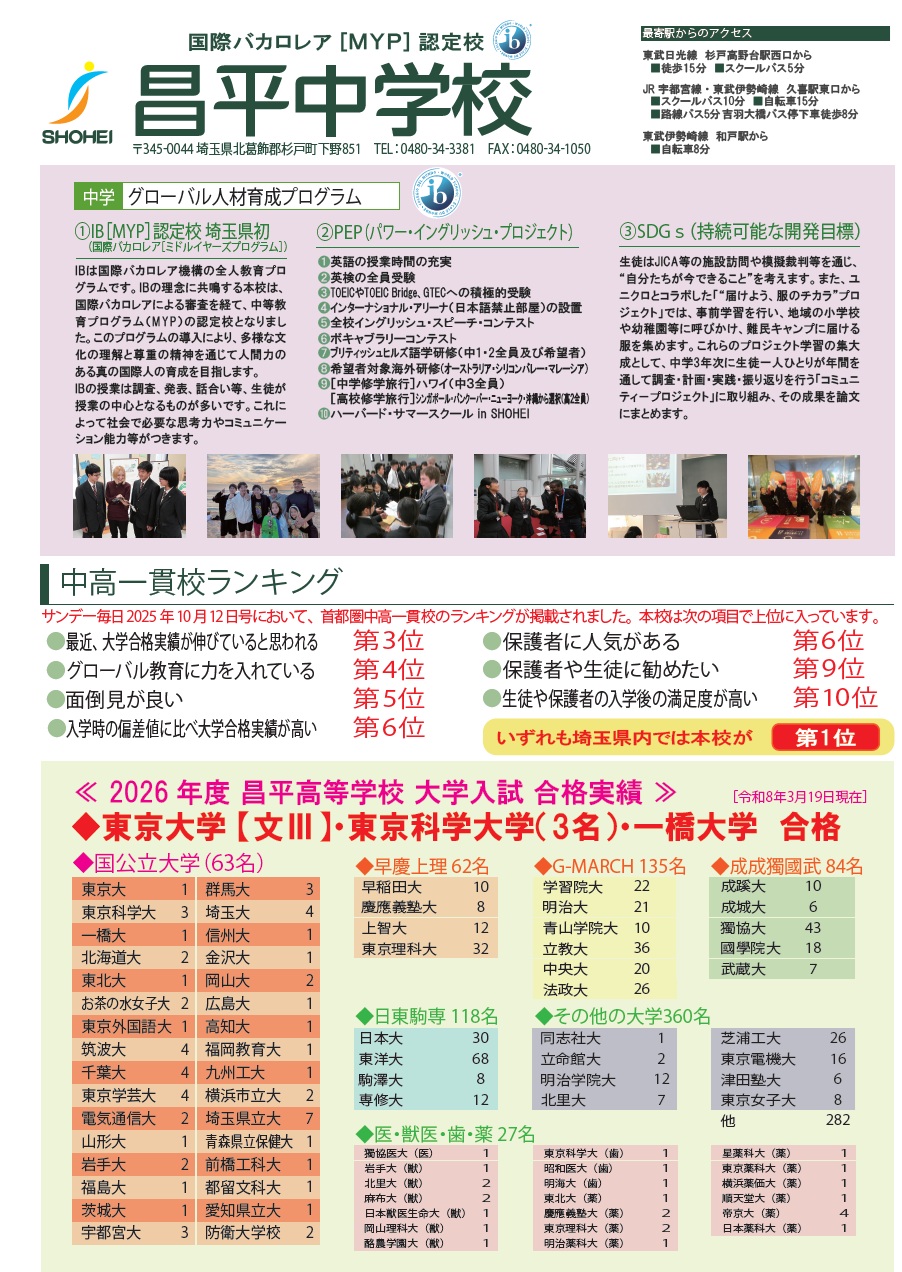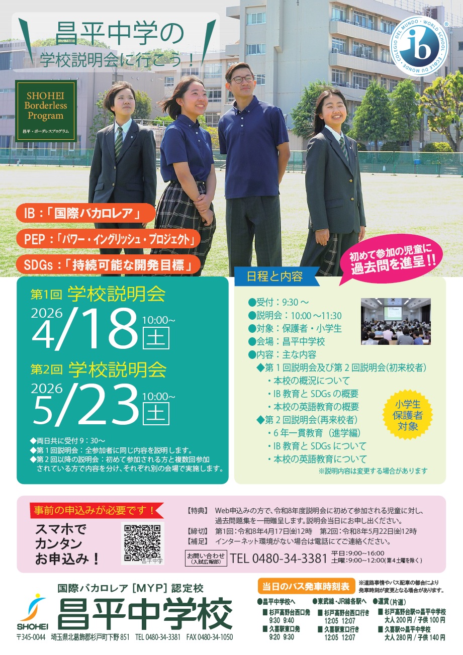 来る4/18(土)、5/23(土)10:00~11:30第1回および第2回昌平中学校学校説明会を実施いたします。