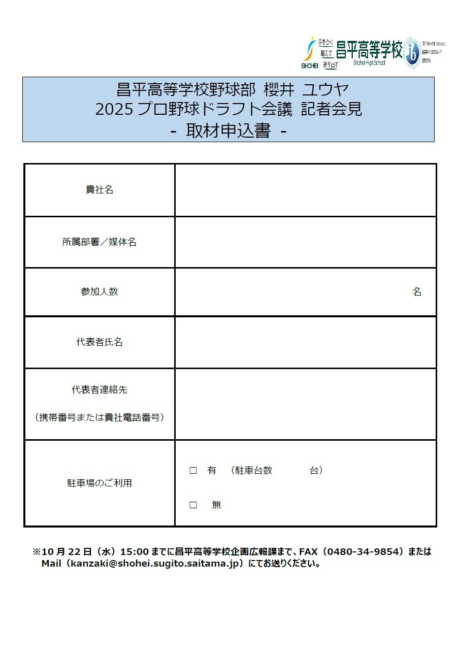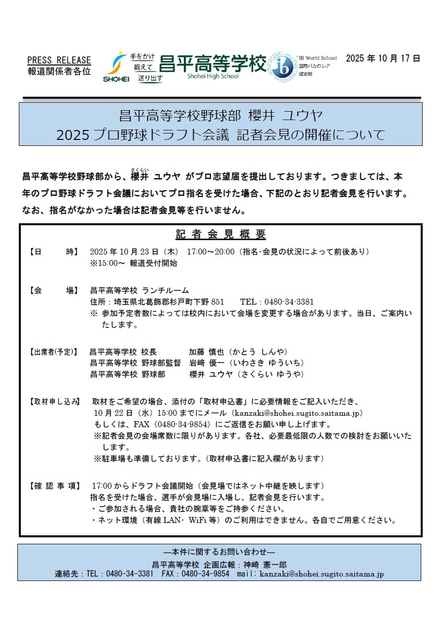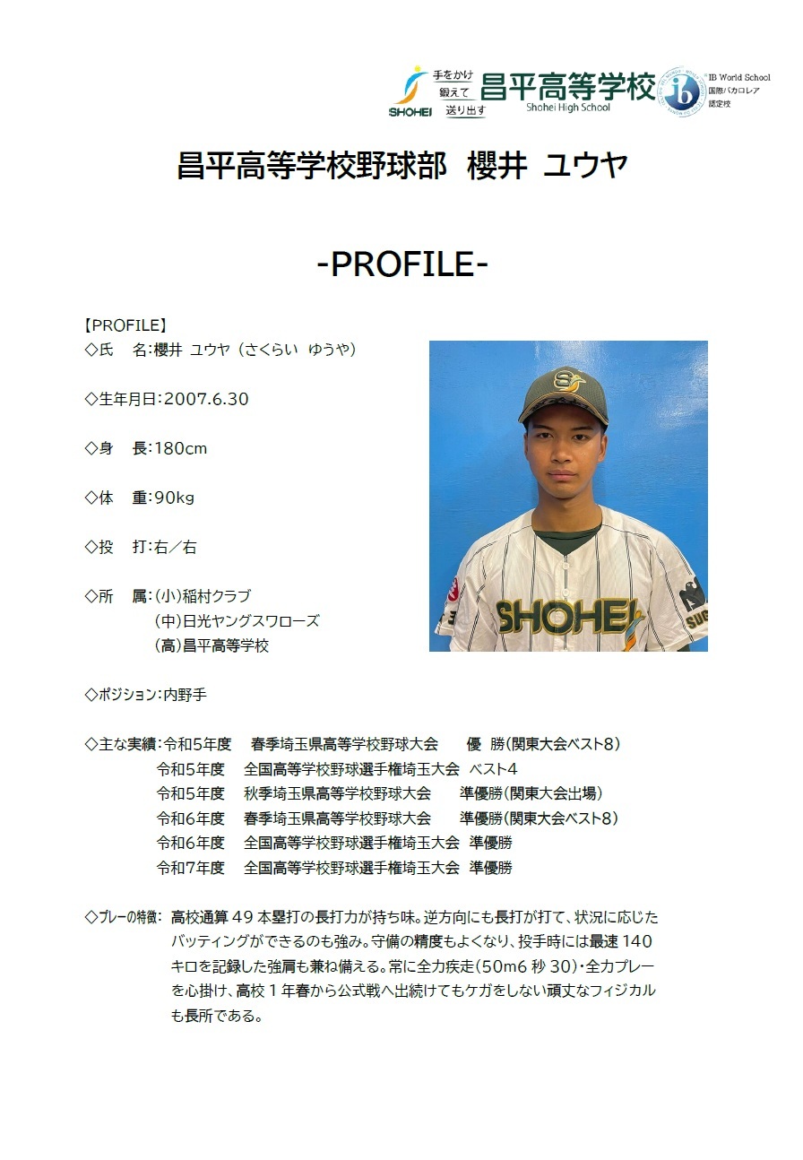 昌平高等学校野球部から、櫻井ユウヤがプロ志望届を提出しております。つきましては、本年のプロ野球ドラフト会議においてプロ指名を受けた場合、添付内容のとおり記者会見を行います。なお、指名がなかった場合は記者会見を行いません。予めご了承ください。