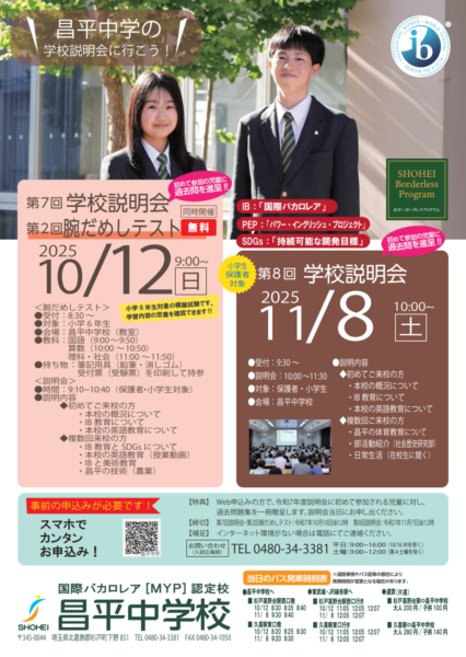 第7回 10月12日(日) 時間:9時10分~ ※腕だめしテスト同時開催 第8回 11月8日(土) 時間:10時00分~ 会場:昌平中学校 対象:小学生・保護者 ※本年度説明会に複数回参加され ている方へは、毎回説明内容を 変えて実施します。 【再来校の方への説明内容[予定]】 10/12→卒業生インタビュー IB教育と美術 昌平の技術 (農業)について 11/8 →部活動紹介 (社会歴史研究部) 昌平の体育教育について 昌平の日常生活 (在校生インタビュー)