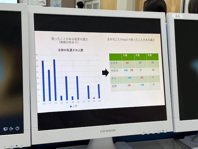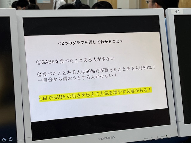 今回のCM動画は、宣伝する対象は問わないというものでした。各班が自由に商品・サービスなどを選び、それらを宣伝するCM動画を制作するという課題です。各班のCM動画はそれぞれのコンセプトに基づいて制作されていて、CM動画を流す前に、コンセプトについてのプレゼンテーションを行わなければなりません。各班のプレゼンを聞いていて何よりも驚いたのが、アンケート結果などのデータに基づいて構成されていることでした。そのデータをどう活用し、どのように表現するのか、ここが各班の腕の見せどころです。