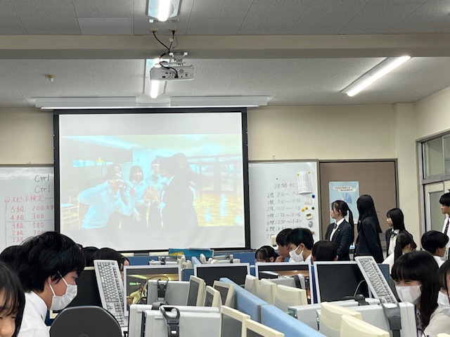 今日は1年12組の情報Ⅰの授業を見学に行ってきました。と言うのも…情報の授業でCM動画を制作するという課題が出ていて、その制作に私も少しだけ協力させてもらったからです。そして、私が制作にかかわった班の2名の生徒から、今日のCM発表会の案内をもらったので早速見学に行ってきました。