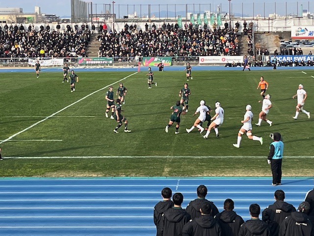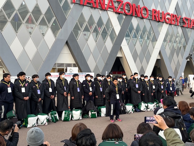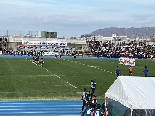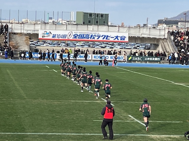今年もあと2日。今日は1回戦を快勝したラグビー部が、2回戦の闘いに挑みました。対戦相手はBシード校の天理高校(奈良県)、3大会連続66回目の出場となる全国大会優勝経験もある伝統校です。平均身長で5cm、平均体重で5kg上回る強豪チームですが、フィジカルでスピードでは本校も負けていません。特に激しいタックルとスクラムの強さは、強豪相手にも一歩もひけをとらないはずです。試合前から緊張感を高めながらも、リラックス下表情の選手たちからは、勝負に挑む強い気持ちが伝わってきました。ウォーミングアップからテンションも高まり、万全の状態で試合開始を迎えました。今日の会場となった第3グランドは、選手の息づかいも聞こえるほど、近くで声援を送ることができました。前評判通りの力強いアタックにも激しいタックルで応戦しました。鍛えてきたスクラムは天理を圧倒し、チーム一丸となったモールは相手を押し込んでいきました。ペナルティーゴールで先制されながらも、堅いディフェンスで得点を押さえていましたが一瞬をつかれて防御網を突破され、前半7分に最初のトライを奪われてしまいました。すぐに追いつきたい本校は、敵陣ゴール前のモールからボールを回して、トライを奪い返し、前半を8対17で折り返しました。後半の巻き返しが期待されましたが、本校のミスも重なり、立て続けにトライを献上してしまいました。スクラムを起点として得点チャンスも何度火ありましたが、なかなか追いつくことができません。最終的には8対36というスコアで試合終了となり、本校の闘いはここまでとなってしまいました。点差は開いてしまいましたが、内容は得点差ほどの開きはなかったように感じました。スクラムやモールをはじめ、全国で通用した部分はたくさんありました。ここからが本当のスタートです。このリベンジを後輩たちに託し、さらに進化したチームへと成長していって欲しいと思います。最後の最後まであきらめずに闘う姿勢を見せてくれた選手たちを本当に誇りに思います。選手の皆さん、熱い闘いをありがとうございました!花園まで駆けつけてくれた多くの保護者の皆様、応援ありがとうございました!Go EAGLES!