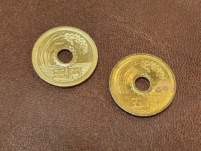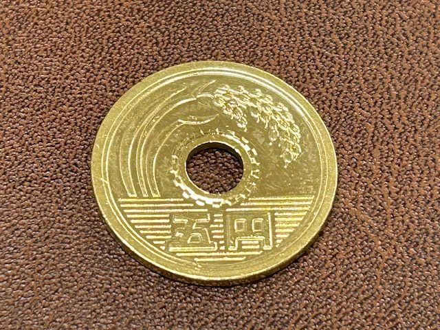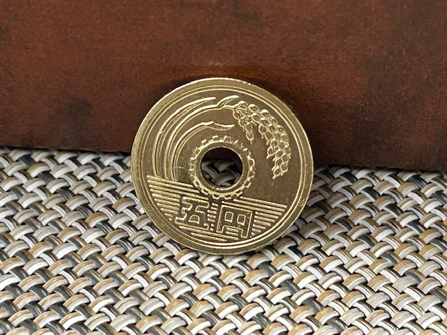 先日、ある先生とお話をしていた時に、生徒たちを勇気づけるために「あるもの」を贈ることがある、という話になりました。その「あるもの」とは……、ピカピカに磨いた5円玉だというのです。くすんでしまった5円玉も丁寧に丁寧に磨いていくと、見事に金色の輝きを取り戻すというのです。5円玉でさえも磨き続けていれば輝きを取り戻すのと同様に、自分自身を磨き続ける努力を続けていけば、必ず自分が輝くことができるようになる。たとえ上手くいかないことや辛いことがあった時でも、自らを磨かせることを継続していれば、必ず輝くことができるようになるとのメッセージを込めて手渡すのだそうです。そこには、努力を怠れば、次第に輝きを失ってくすんでいってしまう5円玉と同じように、人間も努力を止めてしまえば、あっという間に輝きを失い、くすんでいってしまうとの思いを込めているそうです。どうしてもその5円玉を見てみたくなって、その先生にお願いしてみました。それがこの5円玉です。