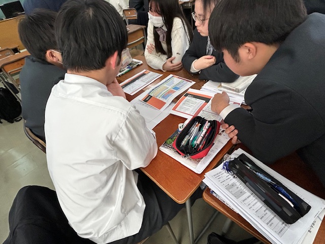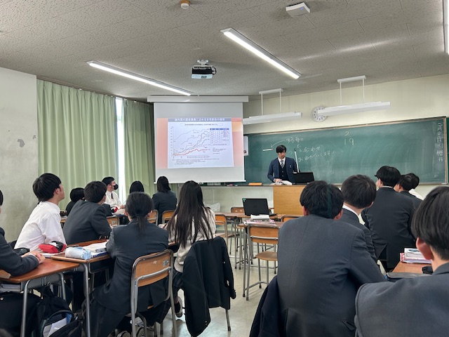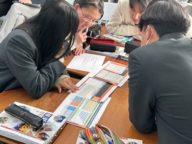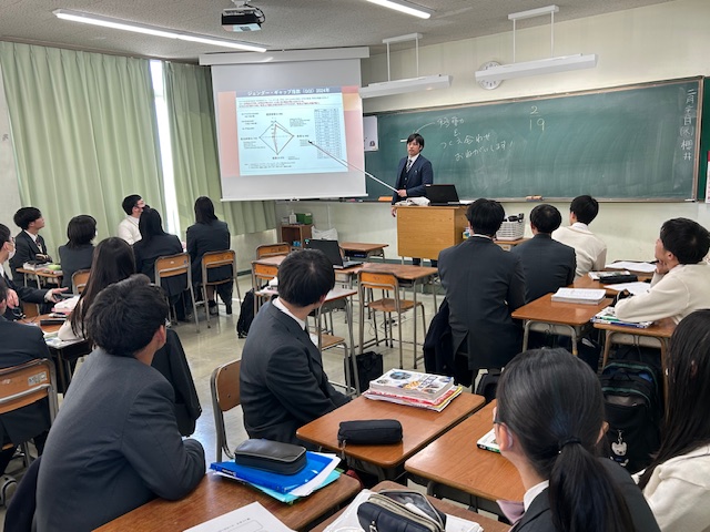 今日は社会科の公開授業が行われました。対象クラスとなった2年生の教室で、K先生の公民の授業を見学しました。学年末試験に向けて学んできた内容について、グループワークでさらに深めることが今日の授業の目的だとのことです。授業の導入ではトランプ政権(アメリカ)と石破内閣(日本)を比較し、日本の女性閣僚がどれほど少ないかが数字として示されました。写真も同時に映し出されましたがその差は歴然としていました。「ジェンダーギャップ」はSDGsの項目にも挙げられていますが、今日のテーマは「日本の男女共同参画の現状」についてです。選択的夫婦別姓制度や女性議員比率の国際比較など、グラフやデータを活用しながら他国と比較した日本の現状について説明が続きました。その後、「日本で女性議員が少ない理由」について意見を交換し、「どうしたら日本で女性議員を増やす方法」について、各班から発表がありました。知識としては身についていることでも、具体的なアクションとして取り組んでいくこととなると、少しだけ事情が変わってくるはずです。固定観念に縛られてしまうとアイデア自体も狭まってしまいます。なかなか斬新なアイデアは出てきませんでしたが、個人個人の意見を出し合い、それを集約して最適解を見出すことがとても重要なはずです。唯一絶対の正解がない現代社会においては、このような授業を通じてスキルを磨いていくしかありません。身につけた知識と技術をベースにして、協働して最適解を見出す能力を高めていって欲しいと思います。一時間の授業には収まりきらない授業でしたが、とても濃密な時間となりました。今後も各教科において、積極的に公開授業を行っていって欲しいと思います。