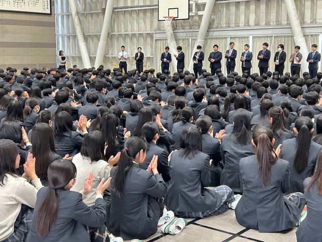 昨日で入学式も終わり、全校生徒がそろっての学校生活が始まりました。新年度が始まって間もないということもあり、今週は新入生オリエンテーションなどキックオフ系の行事が続きます。今日は午前中に新入生歓迎会、学年集会が続き、午後には部活動紹介が行われました。親友性歓迎会では中高合わせて1,833名の生徒が体育館に一同に会しました。中高が一緒に行う行事はそれほど多くないため、この人数が集まるとさすがに圧迫感があります。それでもこの距離の近さが歓迎会にピッタリな空気感を作っていました。新入生、在校生それぞれの代表あいさつの後、お互いに握手を交わし、「よろしくお願いします!」の言葉が続きました。
