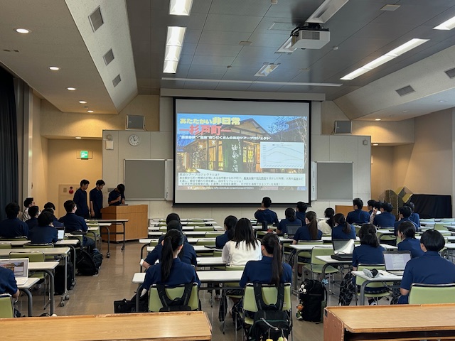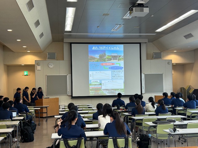 学校のある地元「杉戸町の活性化」を課題として、各グループごとにそれぞれの視点に立った提案が発表されました。データサイエンスの実践を目指している授業であることから、数字を明示したり、課題を可視化するなどビジュアル的にも分かりやすいプレゼンテーションが続きました。各グループのテーマ(タイトル)は以下のとおりです。