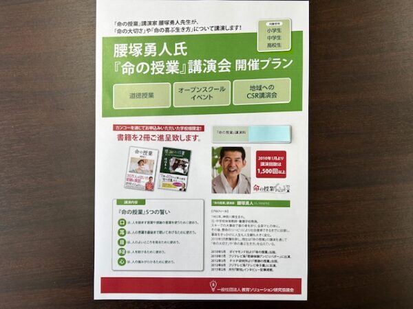 7月11日のブログ『「できる」「できない」』では、ある中学校のトイレで目にした文章をご紹介しました。その文章を書かれた方は元中学校教師の越塚勇人先生です。体育の教師だった越塚先生はスキーの大事故で首の骨を折り、全身マヒの身体になってしまいました。それでも大変なご苦労の末に社会復帰を果たし、現在は『命の授業』の講演会を行っている方です。Cさんの会社では小中高生向け講演会の講師の方もご紹介されているそうです。越塚先生の講演会の開催もお手伝いされているそうで、今回ご紹介をいただいたのです。