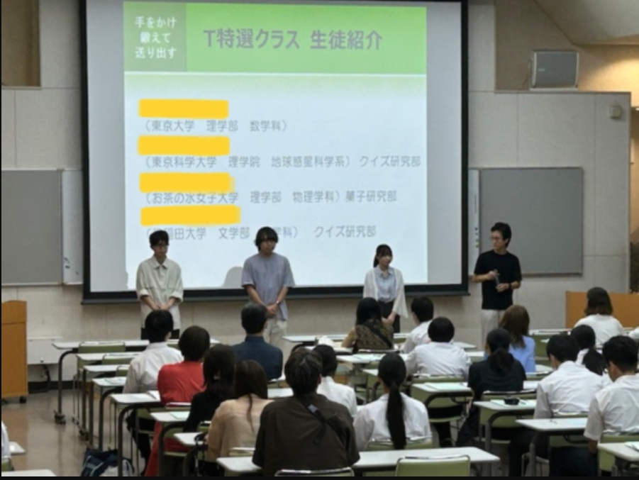 「T特選クラス」は東大・京大を含めた難関国公立大学合格を目標と掲げるクラスです。もちろん部活動や学校行事にも全力で取り組み、高校3年間の充実を図るクラスでもあります。二つのクラスに共通していることは、勉強面での努力は当たり前。さらにその上をめざしてクラス全体で取り組んでいこうとする姿勢です。黙々と勉強を続けることには孤独感が伴いがちですが、どちらのコースも高く掲げる明確な目標があり、その実現に向けてクラス全体で取り組んでいくところです。今回の説明会では、それぞれのクラスを卒業した現役の大学生・大学院生から、現役時代の高校生活について語ってもらいました。彼らの生の声は、我々教員の説明など比較にならないほど説得力があります。クラブとの両立の苦労話やとにかく勉強を楽しもう!など、年令の近い先輩たちの話は、中学生にとってはとても身近に感じたようです。説明会後のアンケートでも「卒業生インタビュー」がとても参考になったとの意見が多数寄せられていました。