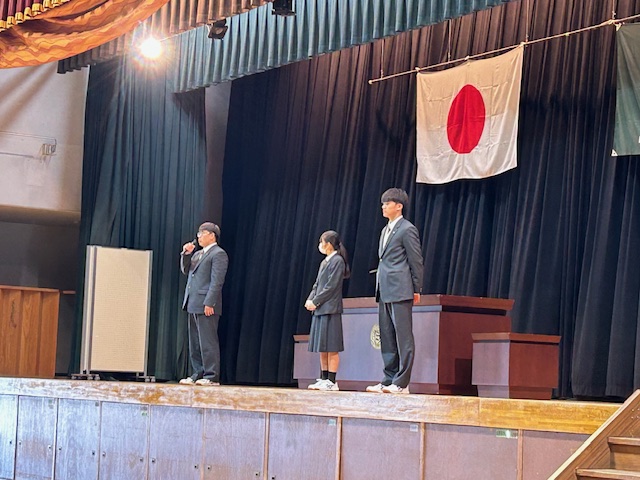 ラグビー部主将の宮本 崇君、サッカー部女子の山田仁菜さん、サッカー部男子の伊藤隆寛君が大会の報告と応援の御礼をしてくれました
