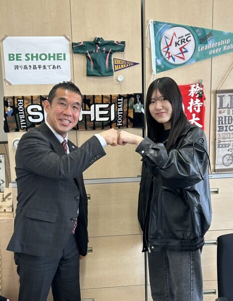 担任の堀越先生と一緒に、満面の笑顔を浮かべながら挨拶に来てくれました。