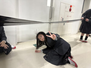 生物・化学部の1年生は、熱気球作りをしています。今は、大きな黒いビニールを紡錘...