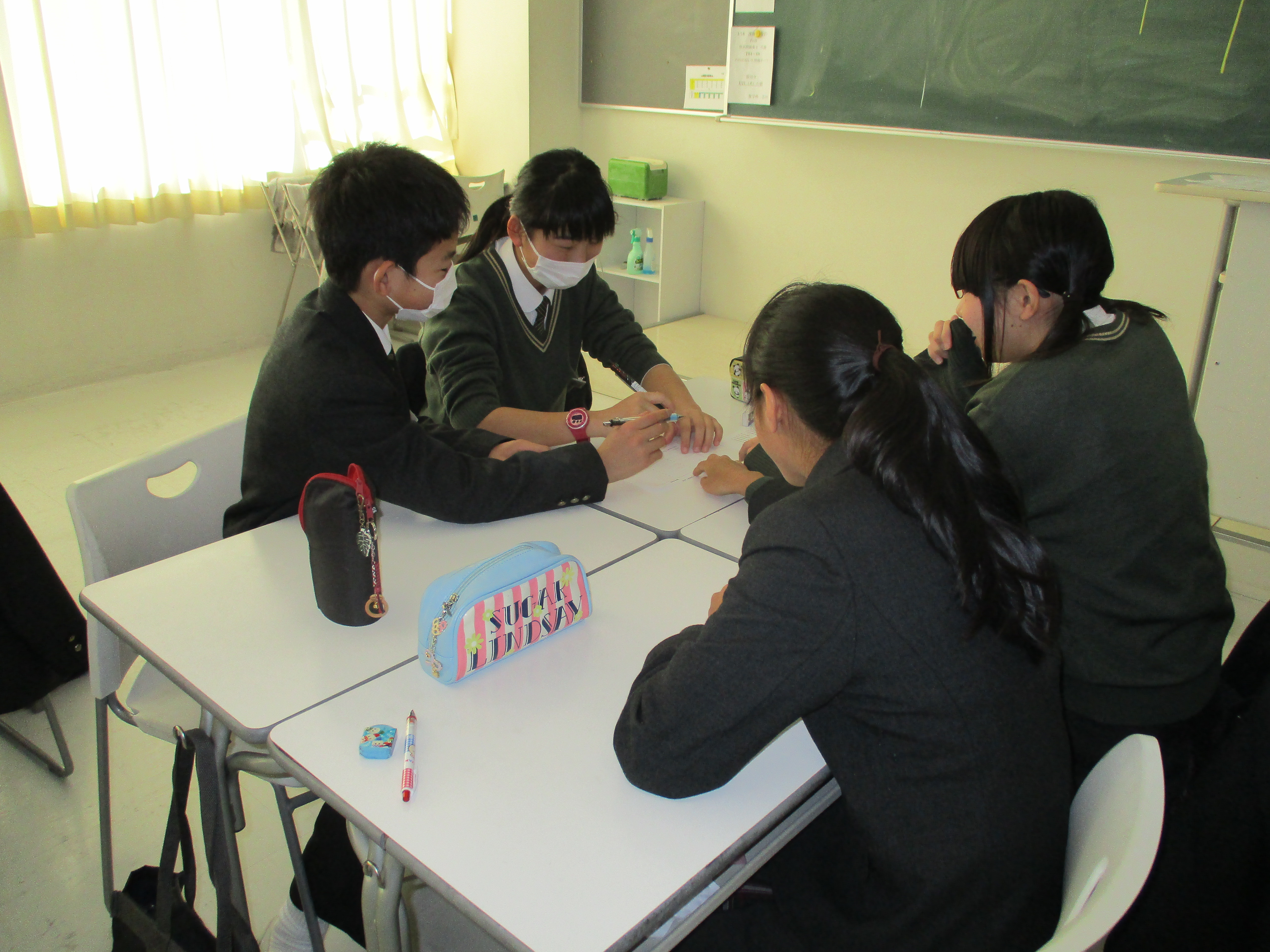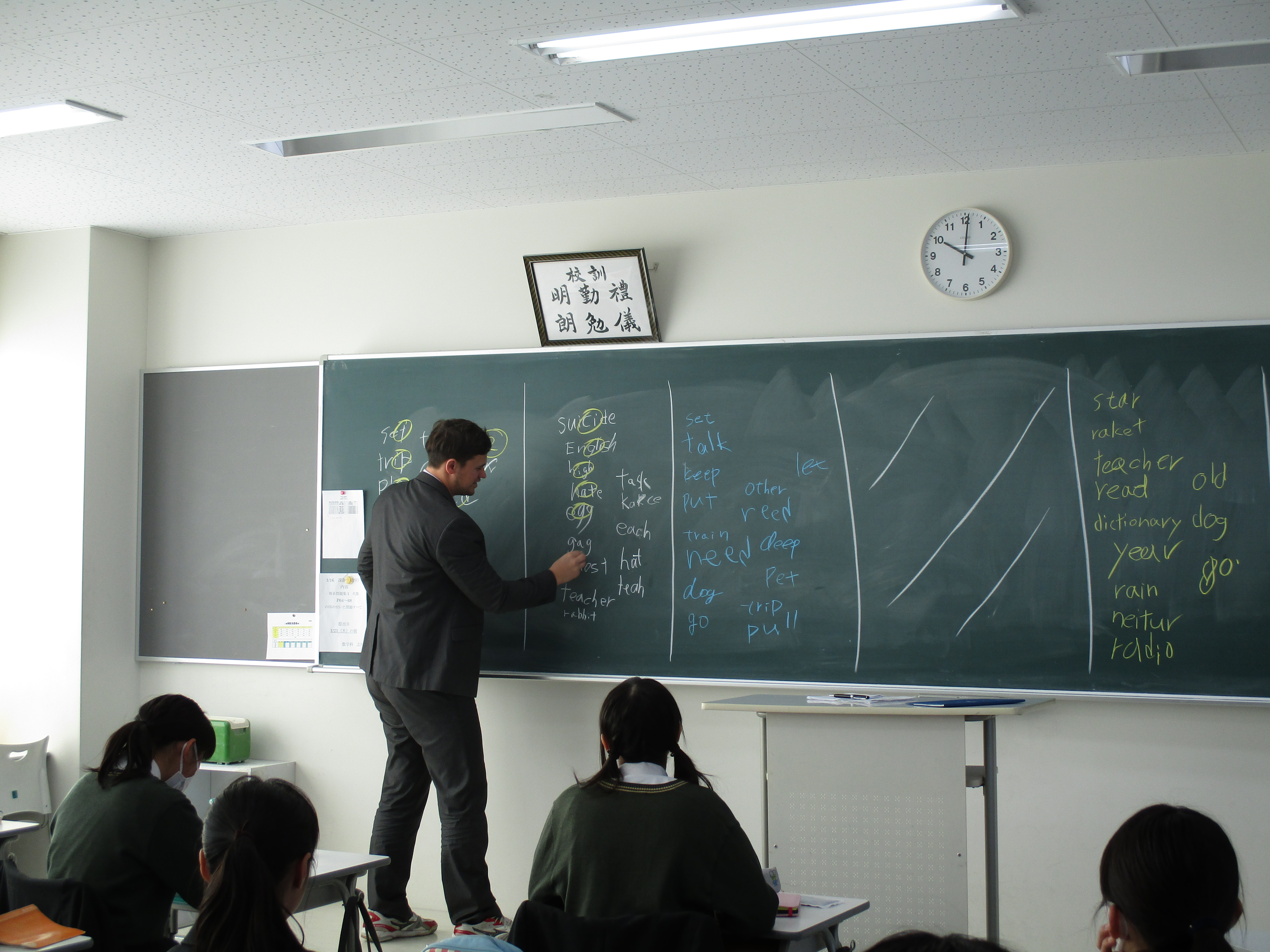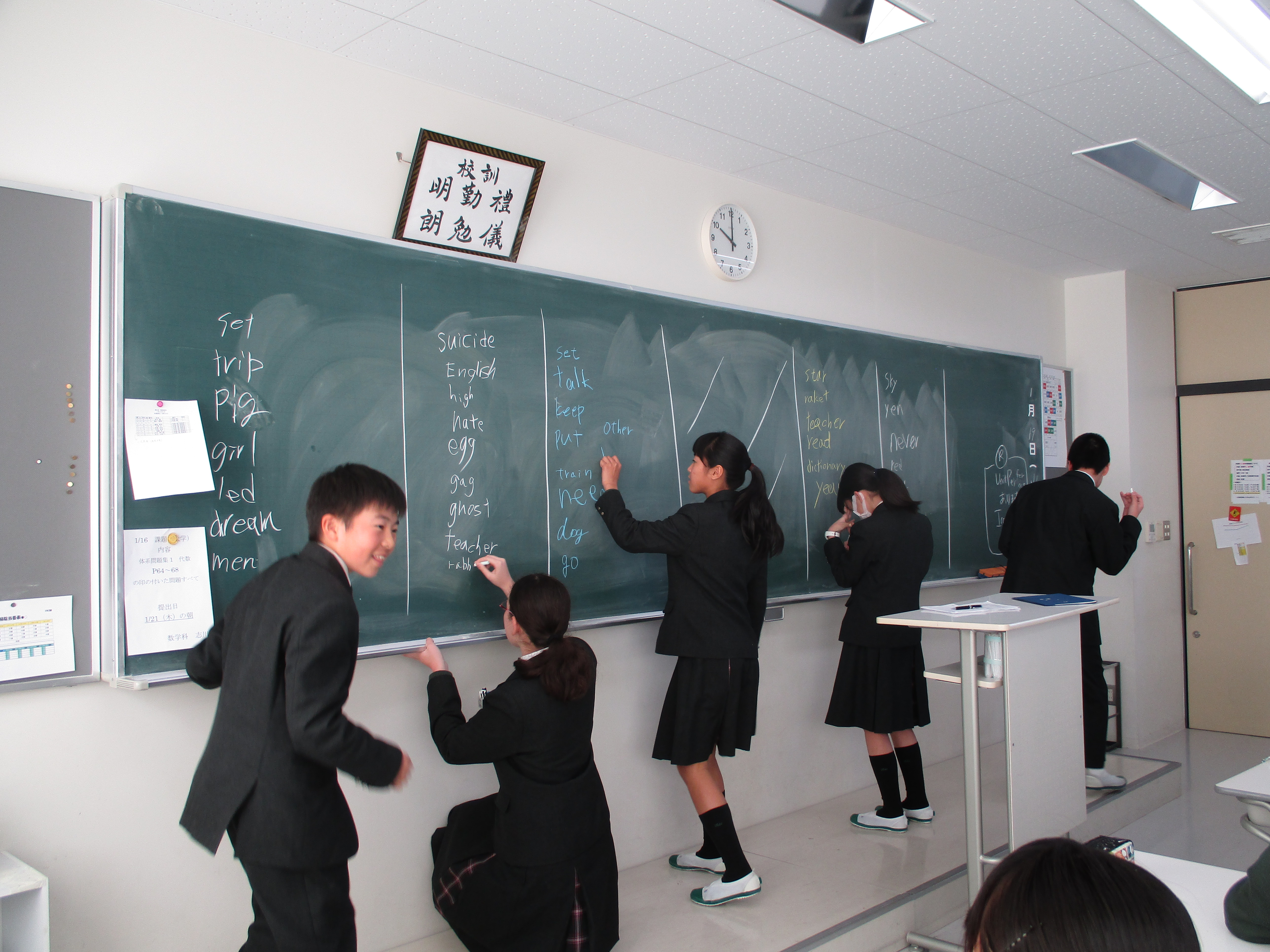 本日、中学1年では第2回目の英会話の授業がありました。まずは、英単語のしりとりから授業がスタートしました。生徒は順番に黒板に英単語を書いていきました。一番多い班は2分間で15個以上の単語を書くことができました。日頃の単語テストの成果が発揮できたようです。その後はそれぞれカテゴリーから連想される単語を他の班と重ならないように出していくというゲームをしました。班で協力して多くの単語を調べることができました。今回の英会話の授業も、生徒一人ひとりが積極的に取り組んでいました。