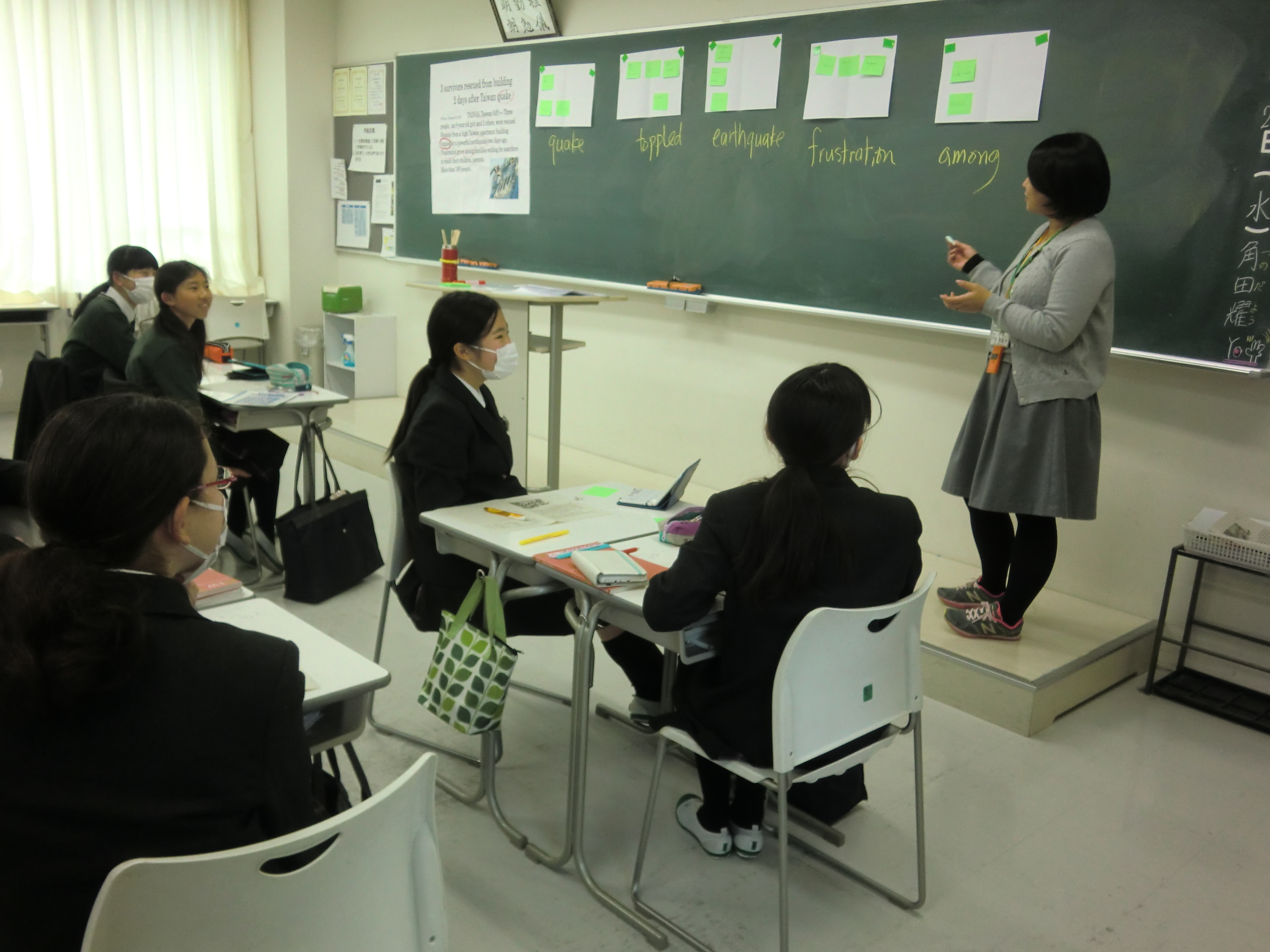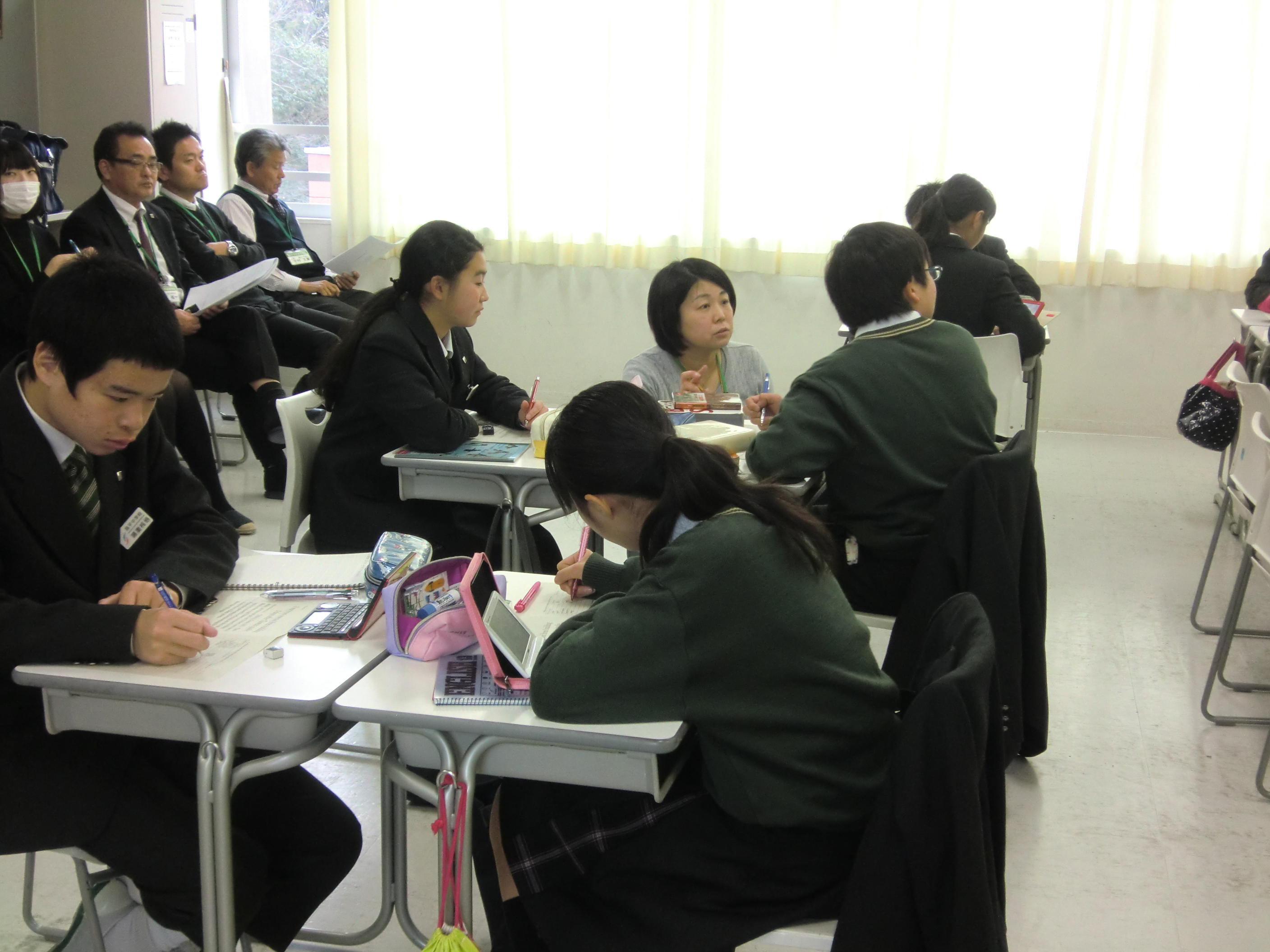 中学1年生の英語の授業で研究授業が行われました。今年度入学した1年生からIB(国際バカロレア)の理念に沿った授業展開をしており、IB理念の理解のため英語科以外の教科担当者も多く授業をみて研究していました。