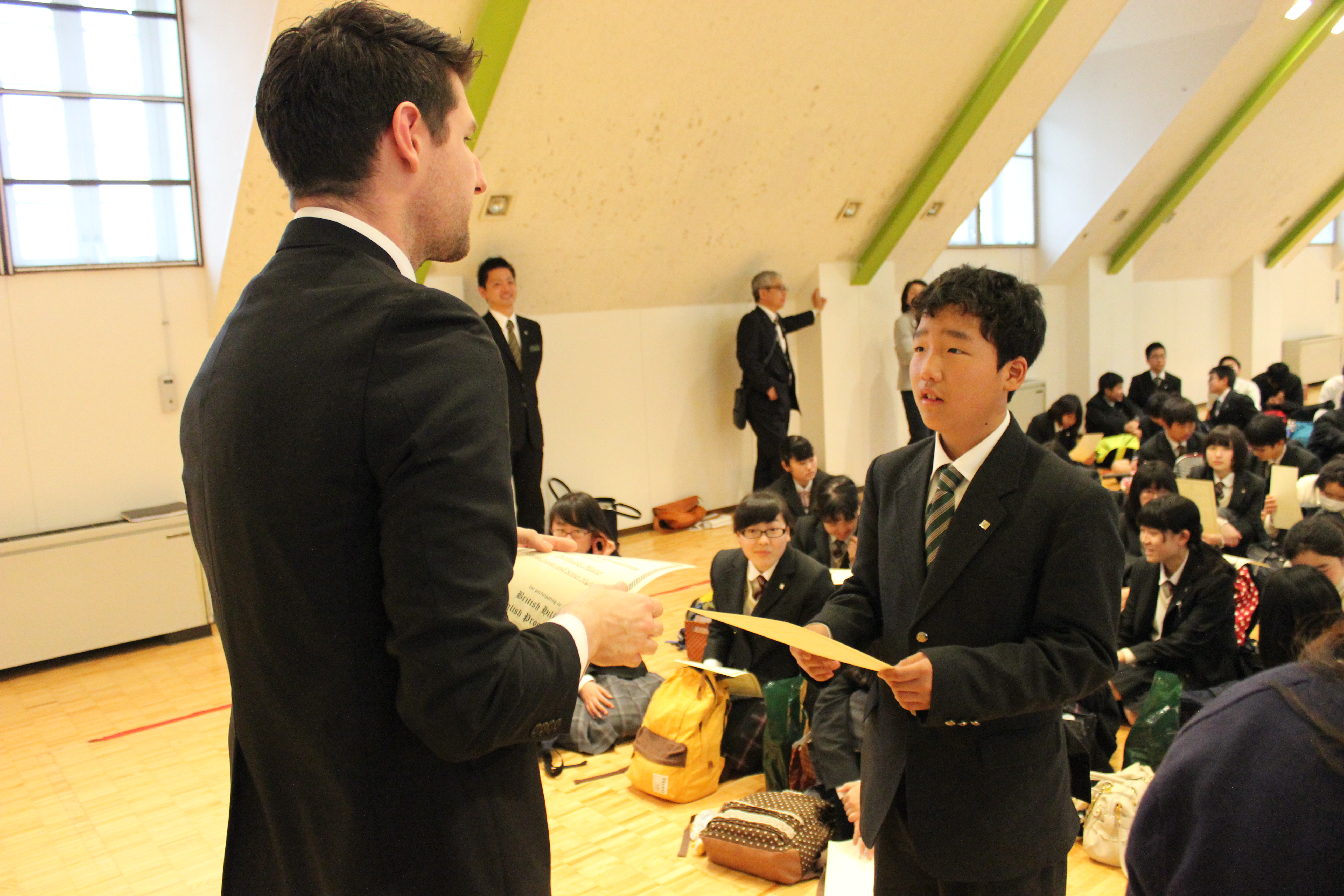 ブリティッシュヒルズ語学研修も3日目(最終日)をむかえました。レッスンにも慣れ、生徒達がブリティッシュヒルズ内の従業員に英語で質問する場面も多く見られました。最後にネイティブの先生から生徒一人ひとりにこの3日間のレッスンの修了書が手渡されました。この経験を活かして、英会話の練習と英語学習を継続して欲しいとネイティブの先生から伝えられました。