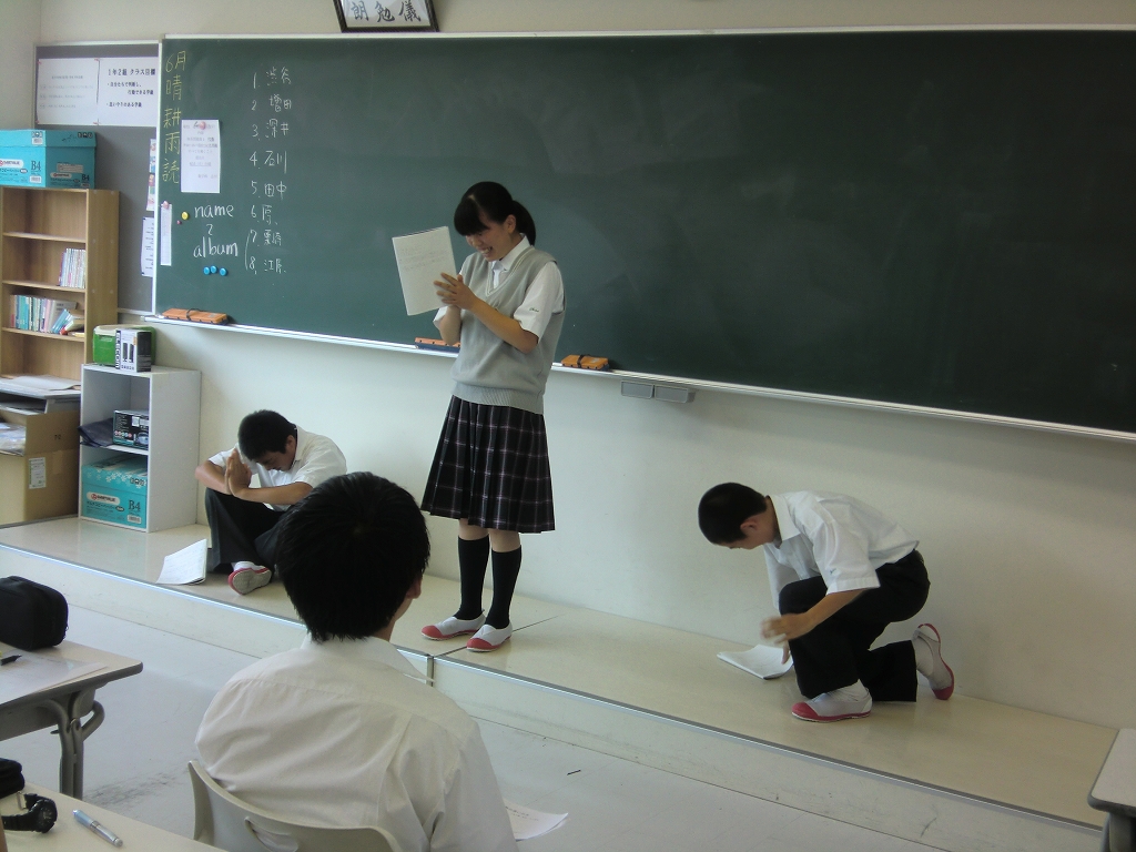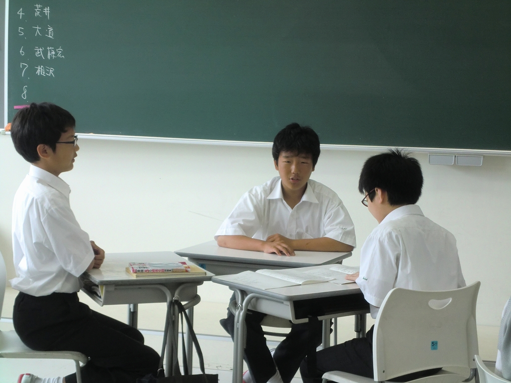 中学1年生の地理では、宗教をテーマにロールプレイを行いました。3人のグループを作り、それぞれがキリスト教徒、イスラム教徒、仏教の役をやり、各宗教の考え方や生活が異なることがわかるような台本を作り、発表しました。一つのことに対しても異なる視点があることを理解しました。