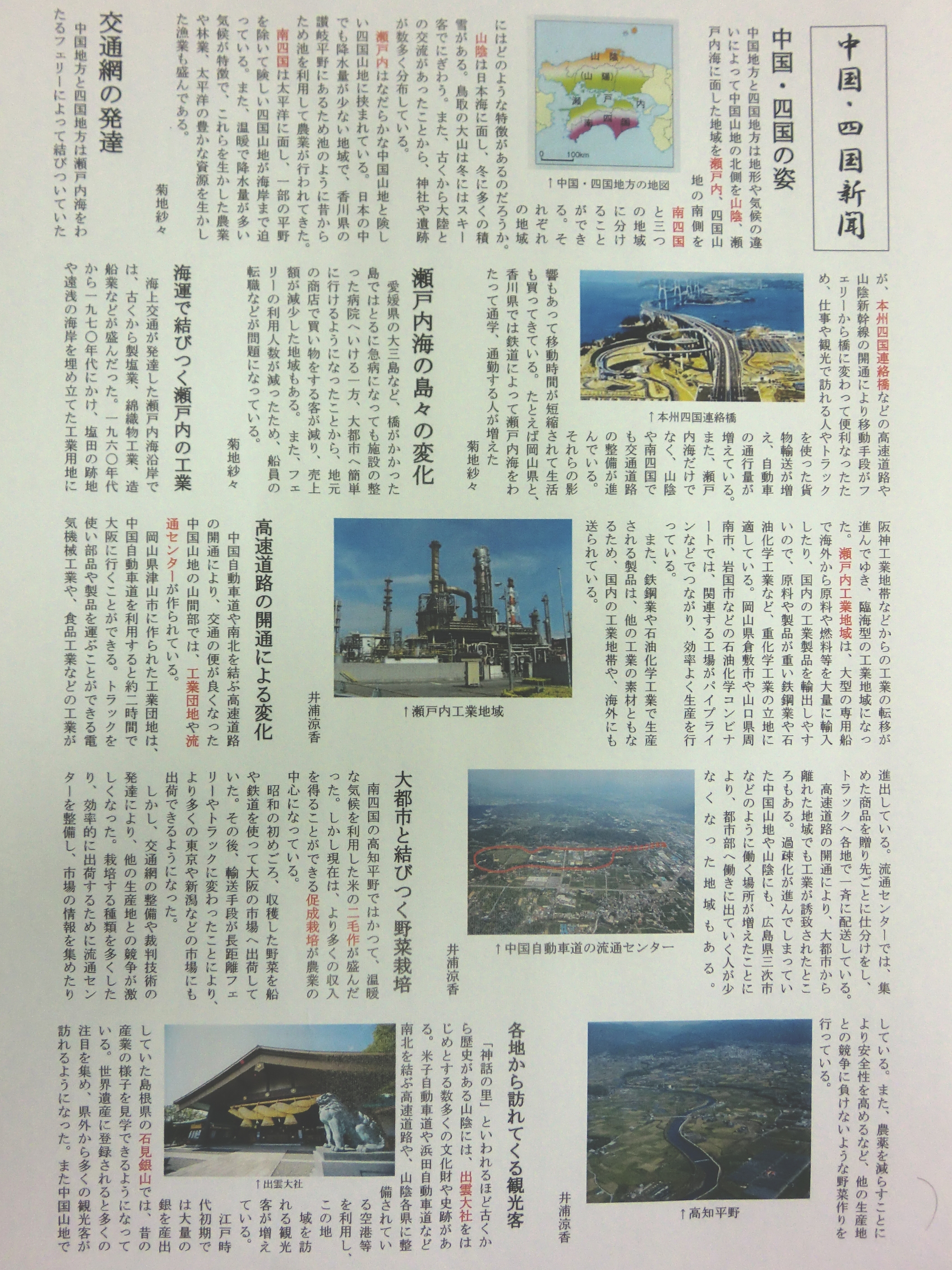 2年生は中国・四国地方について調べ学習を行い、新聞形式でまとめました。自分の作品の出来を自己評価した上で、他の生徒の作品も評価しました。振り返りを重視し、生徒自身が自分に必要なものに気付く機会を作っています。