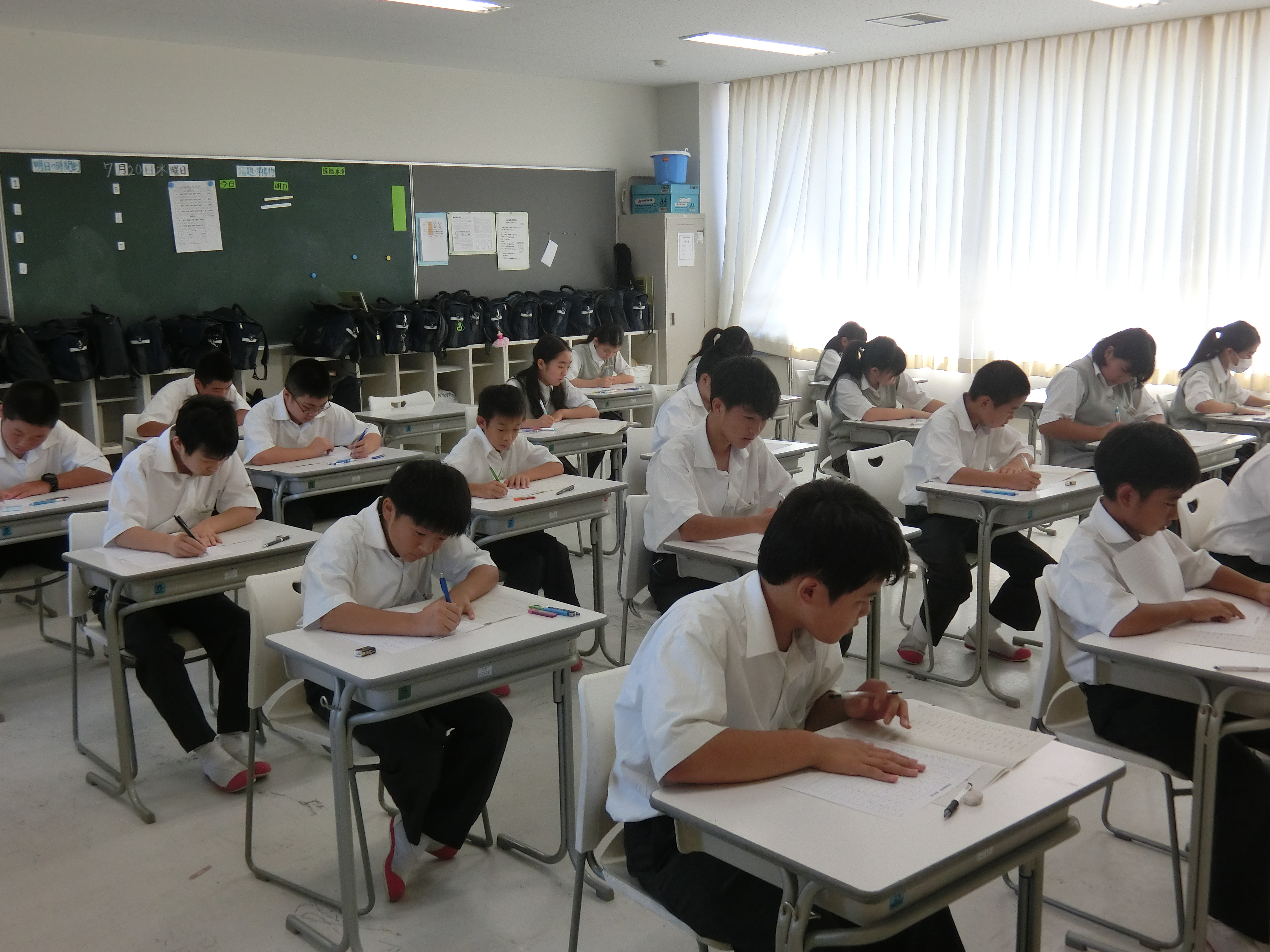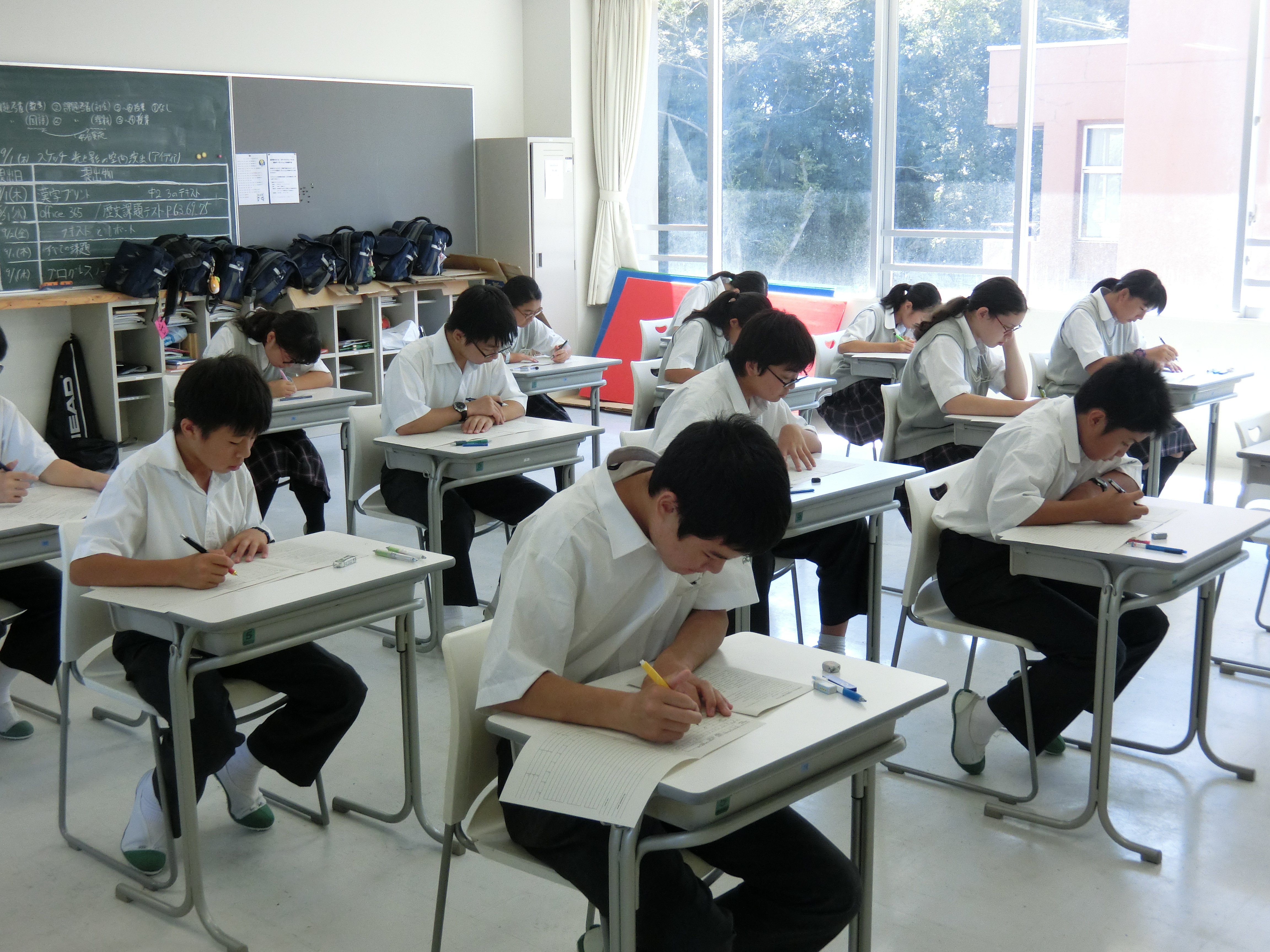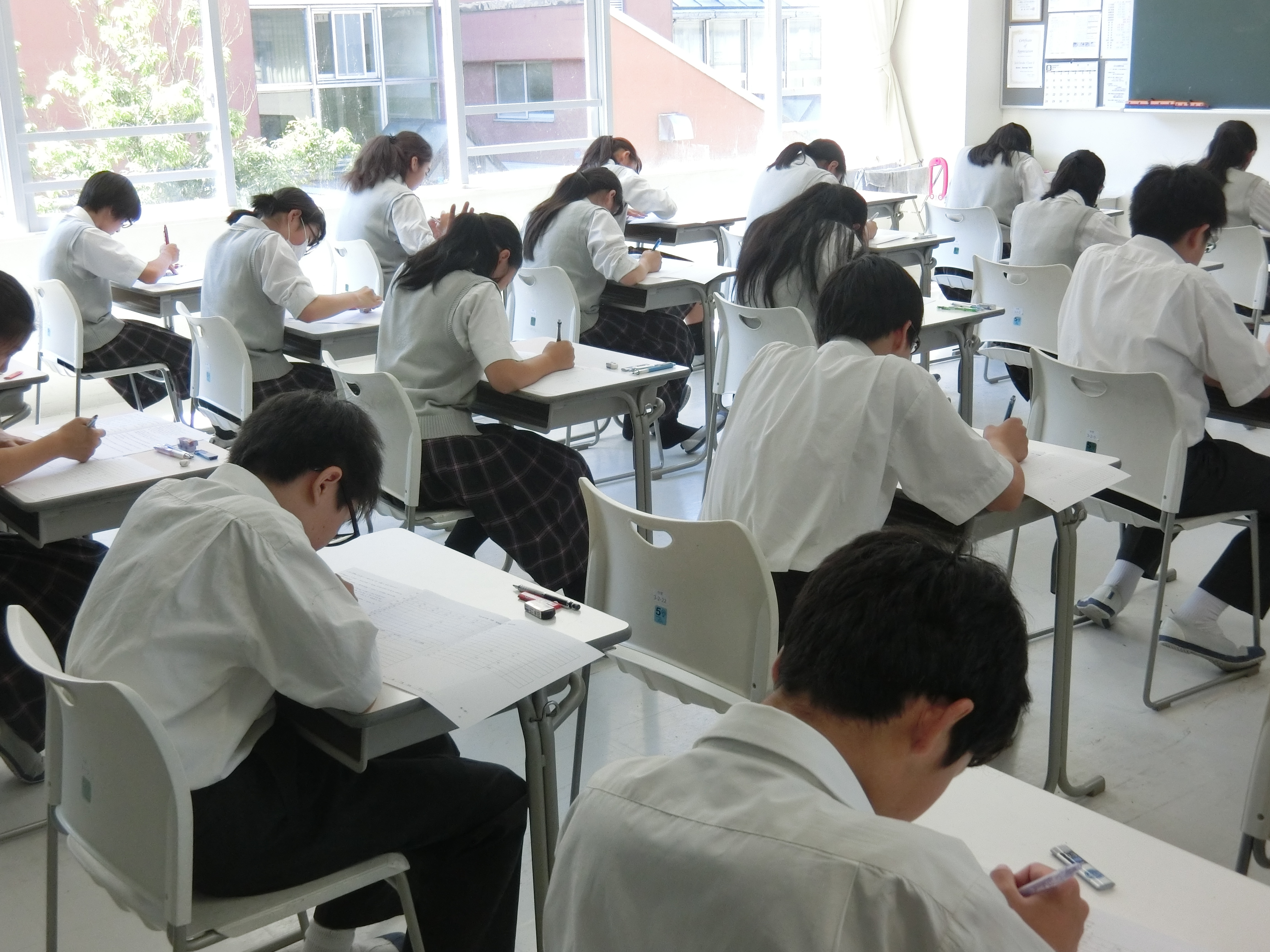 夏休みも終わり本日から2学期がスタートしました。まだまだ暑い日が続きますが、生徒たちは元気に登校してきました。始業式では城川校長から、「協働」というお話がありました。また、賞状伝達式では、インターハイ第3位になったサッカー部をはじめ、各部活動の表彰、また、英検の表彰が行われました。中学からは1年1組寺井君、里永さん、3組の半澤君が2級を取得し表彰されました。また、英語の課題考査が行われ、集中して取り組んでいました。