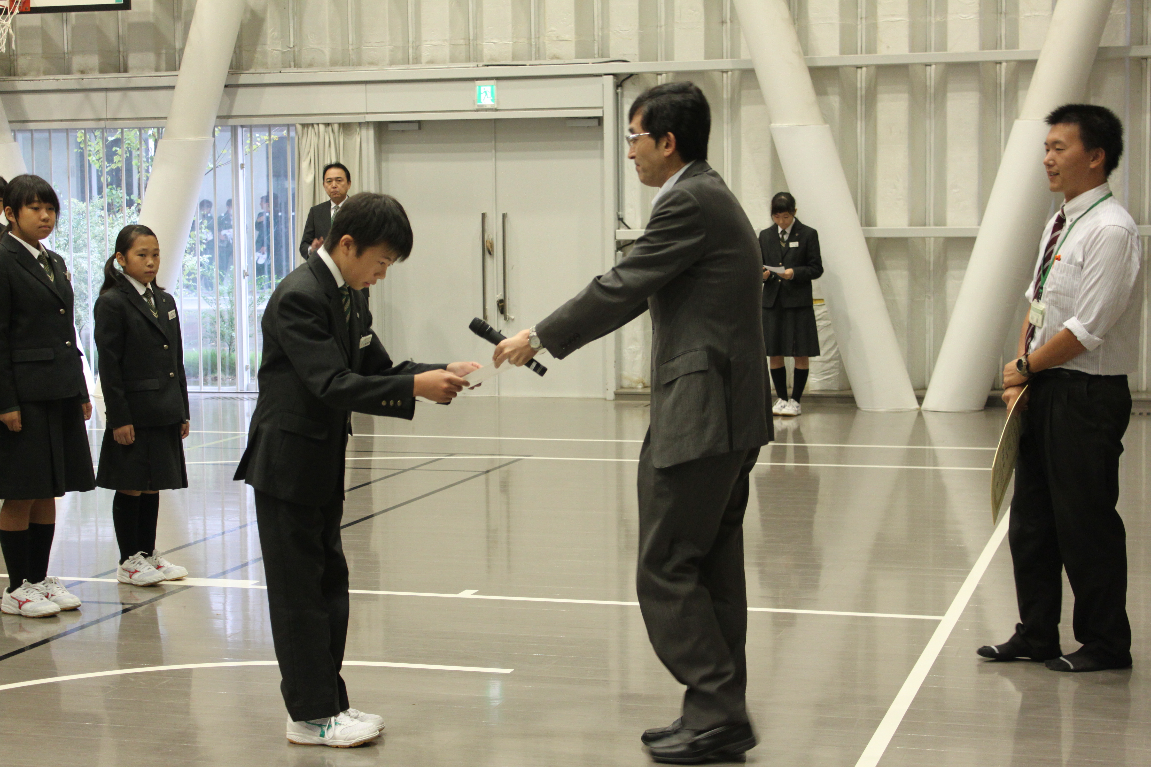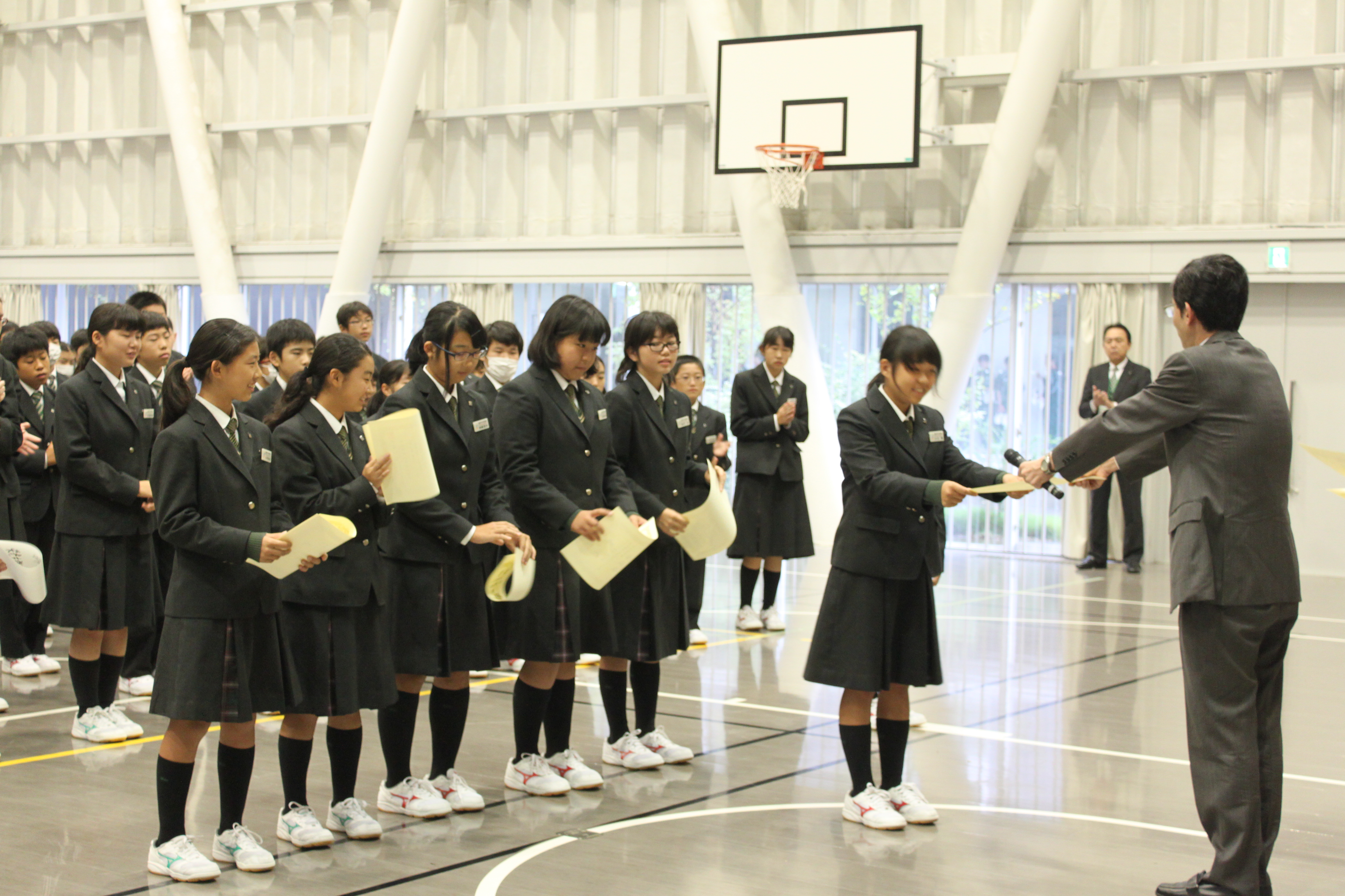 本日朝礼が行われました。まず城川校長先生から、細胞が不要なたんぱく質などを分解して栄養源に再利用する「オートファージ」の仕組みを解明し、ノーベル賞を受賞した、大隅良典先生のお話がありました。ミクロとマクロの両方の視点で物事をみることで、意外な発見があり、両視点で見ていくことがこれからはとても大切とおっしゃっていました。また、テニス部の生徒へ、新人大会地区予選と私学大会の表彰がありました。県大会に出場する生徒は練習の成果を発揮できるよう頑張ってください。