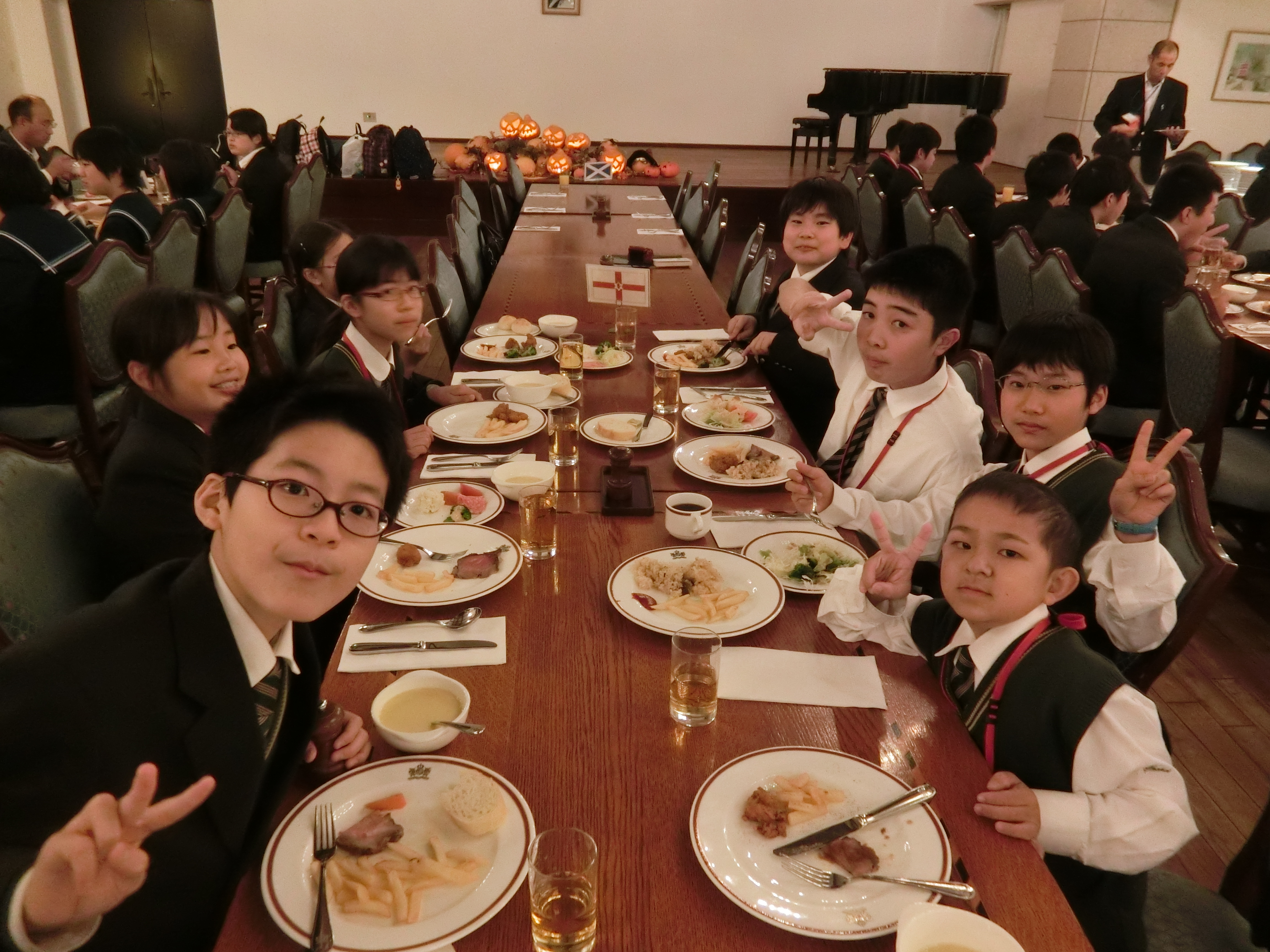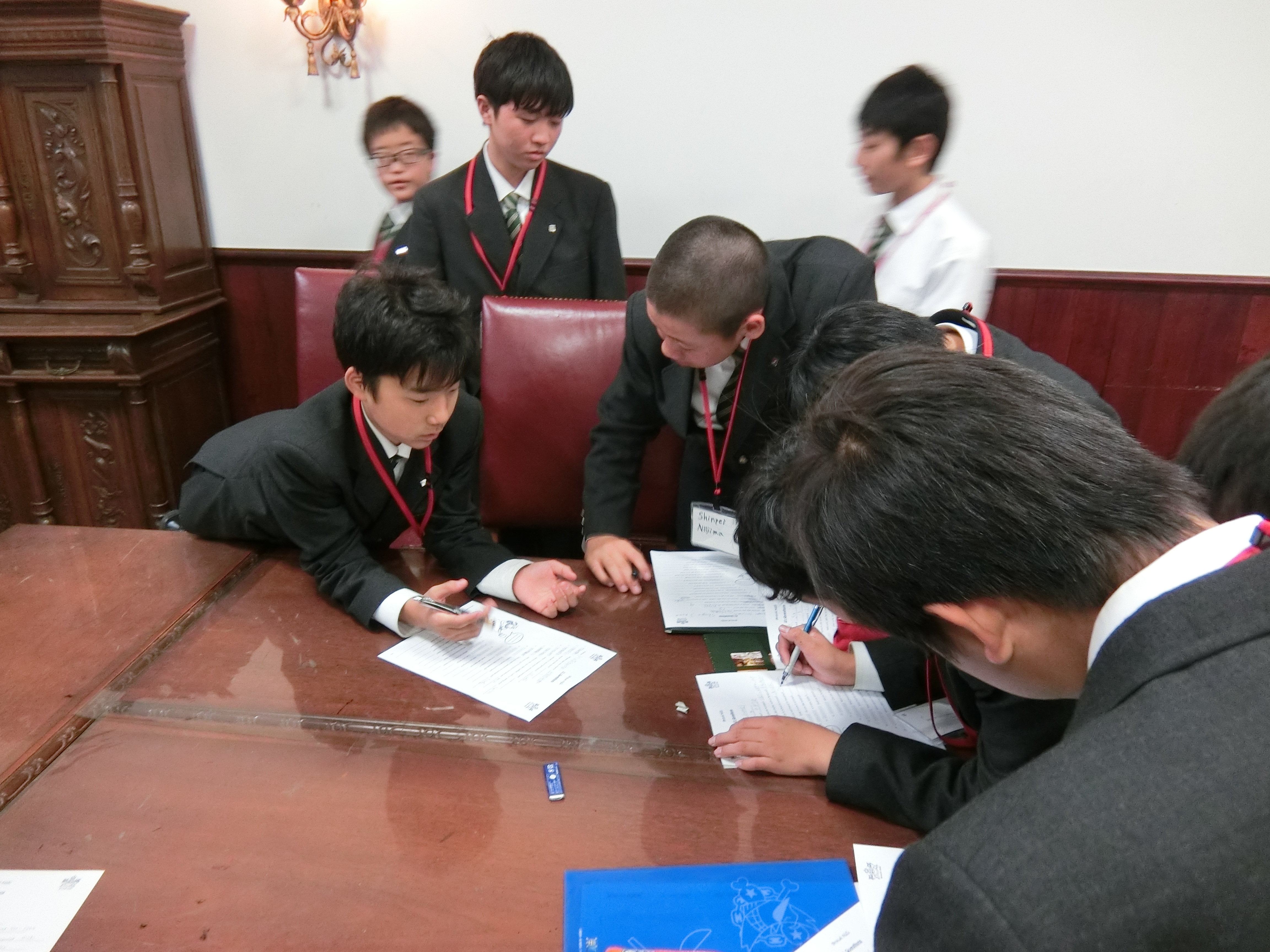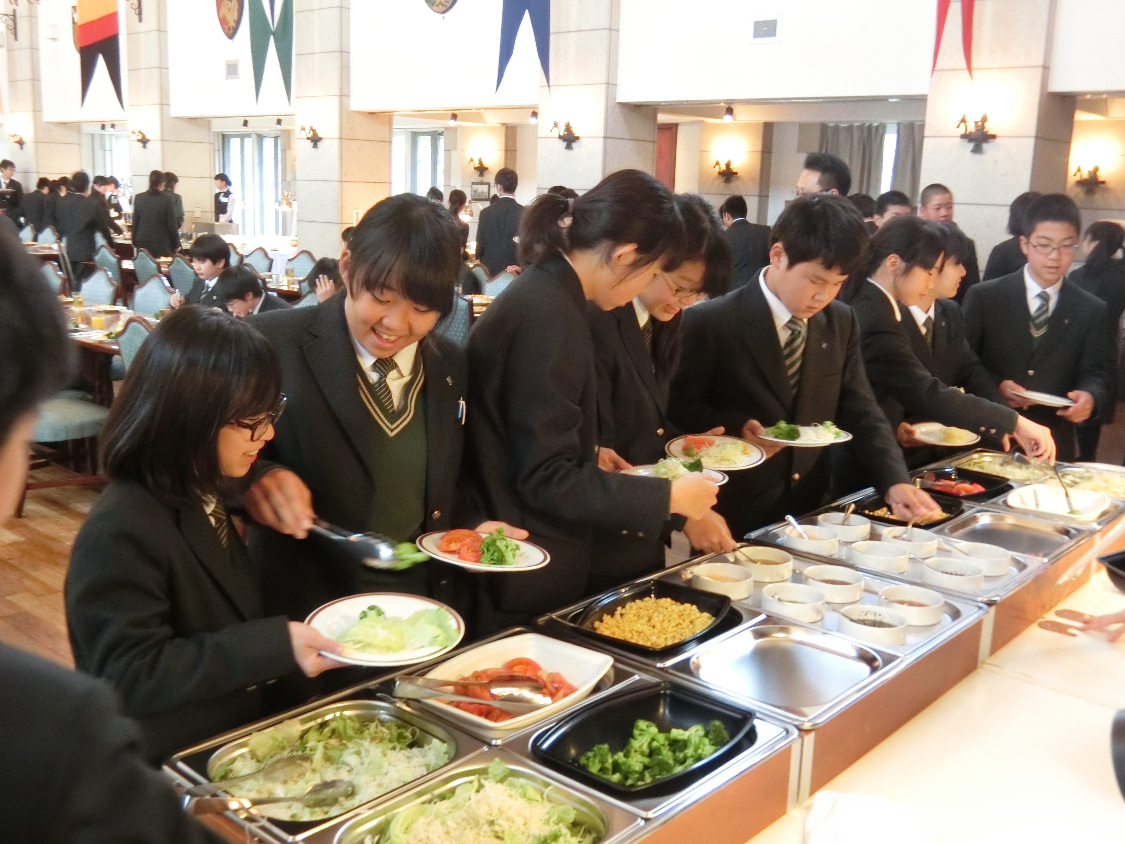 本日から中学1年生のブリティッシュヒルズ語学研修が始まりました。施設内に入れば全てのスタッフとの会話が全て英語です。5月の希望者対象研修に参加した生徒も一部いましたが、ほとんどの生徒にとって初めての参加です。到着後はビュッフェのランチをおいしくいただき、その後、外国人スタッフによるチェックイン、オリエンテーションを受けました。午後のレッスンは、多少戸惑いながらも徐々に慣れ、一人ひとりが積極的に英語を使って外国人講師そして仲間と楽しく会話をしていました。