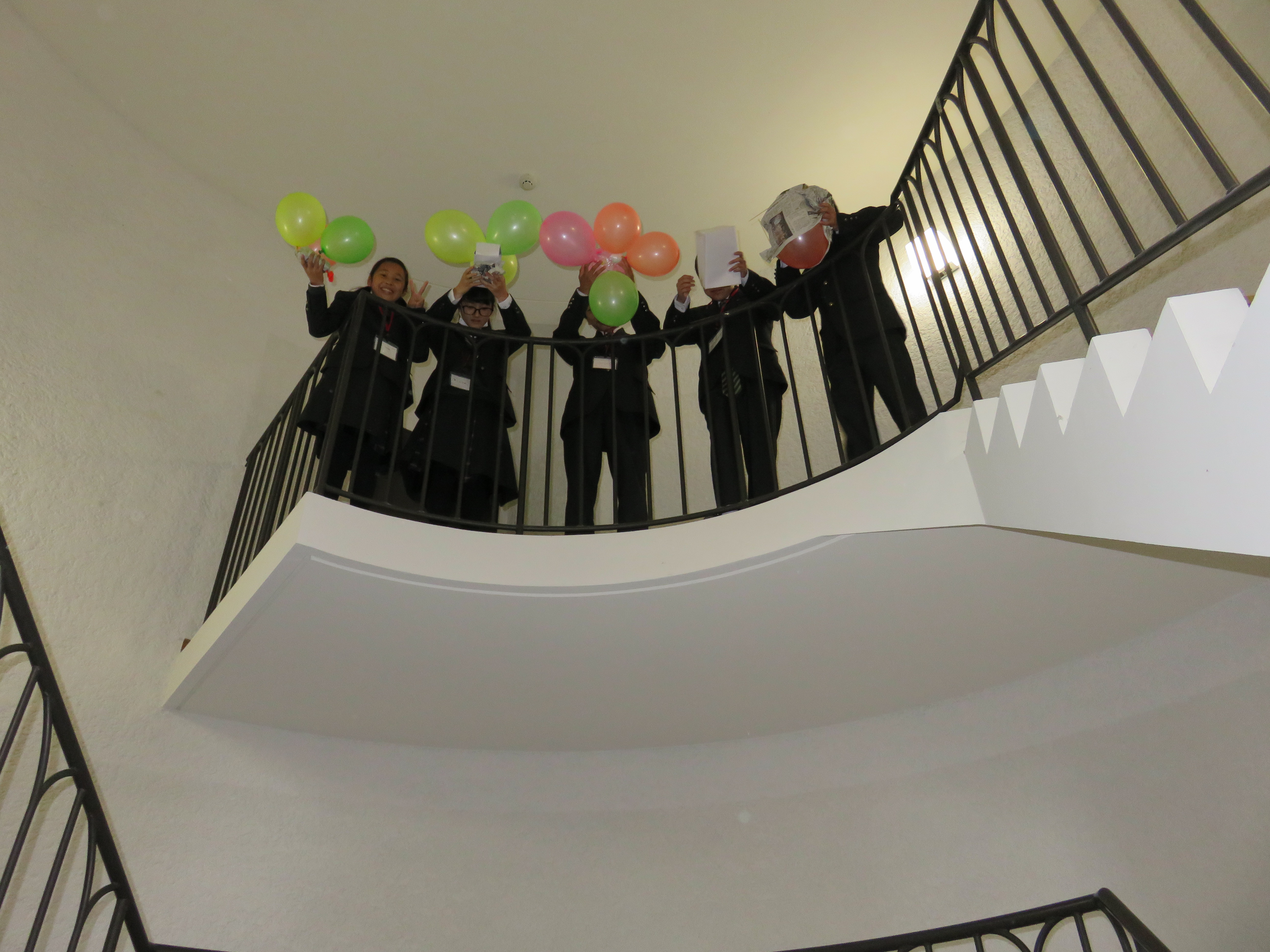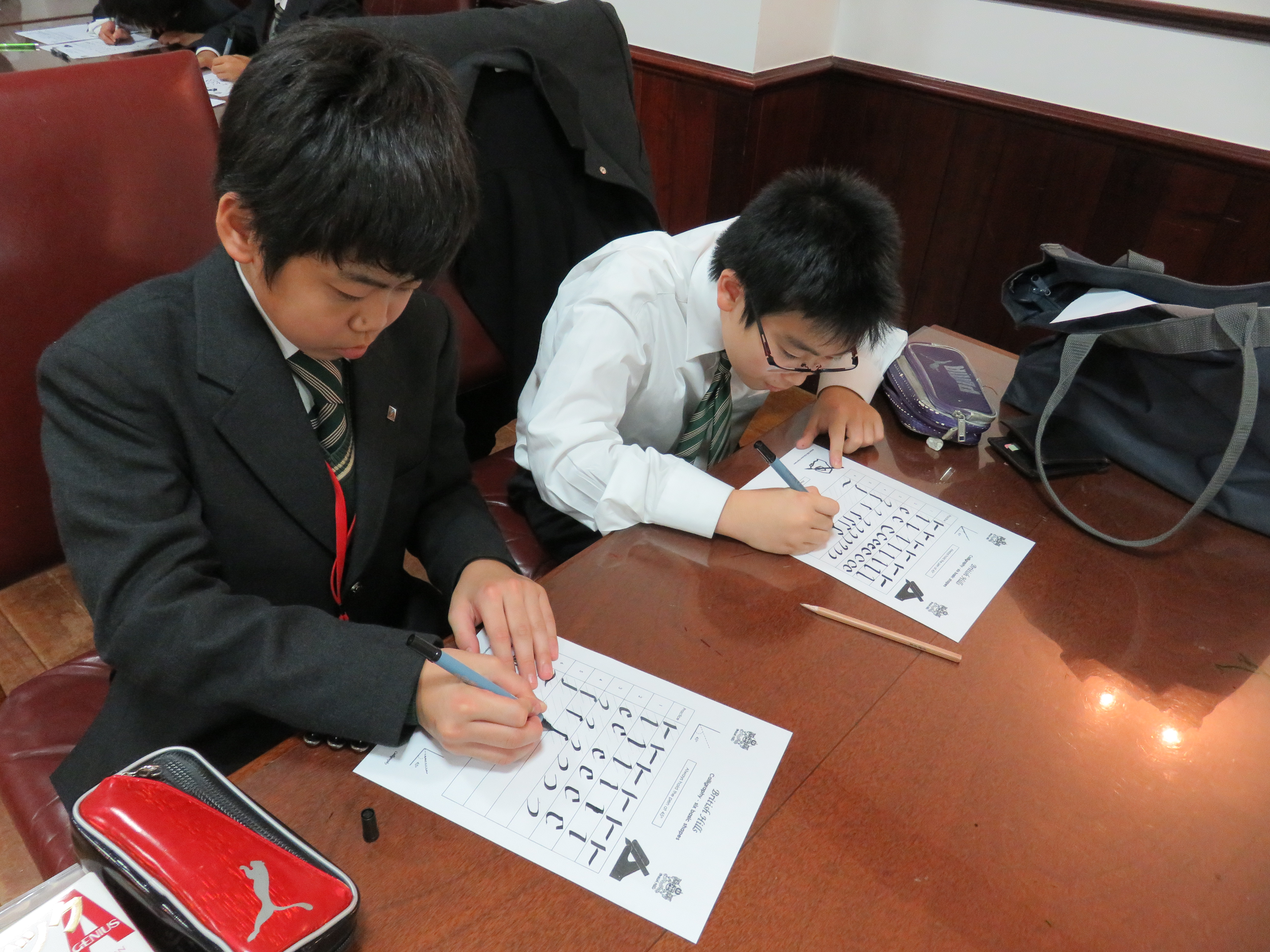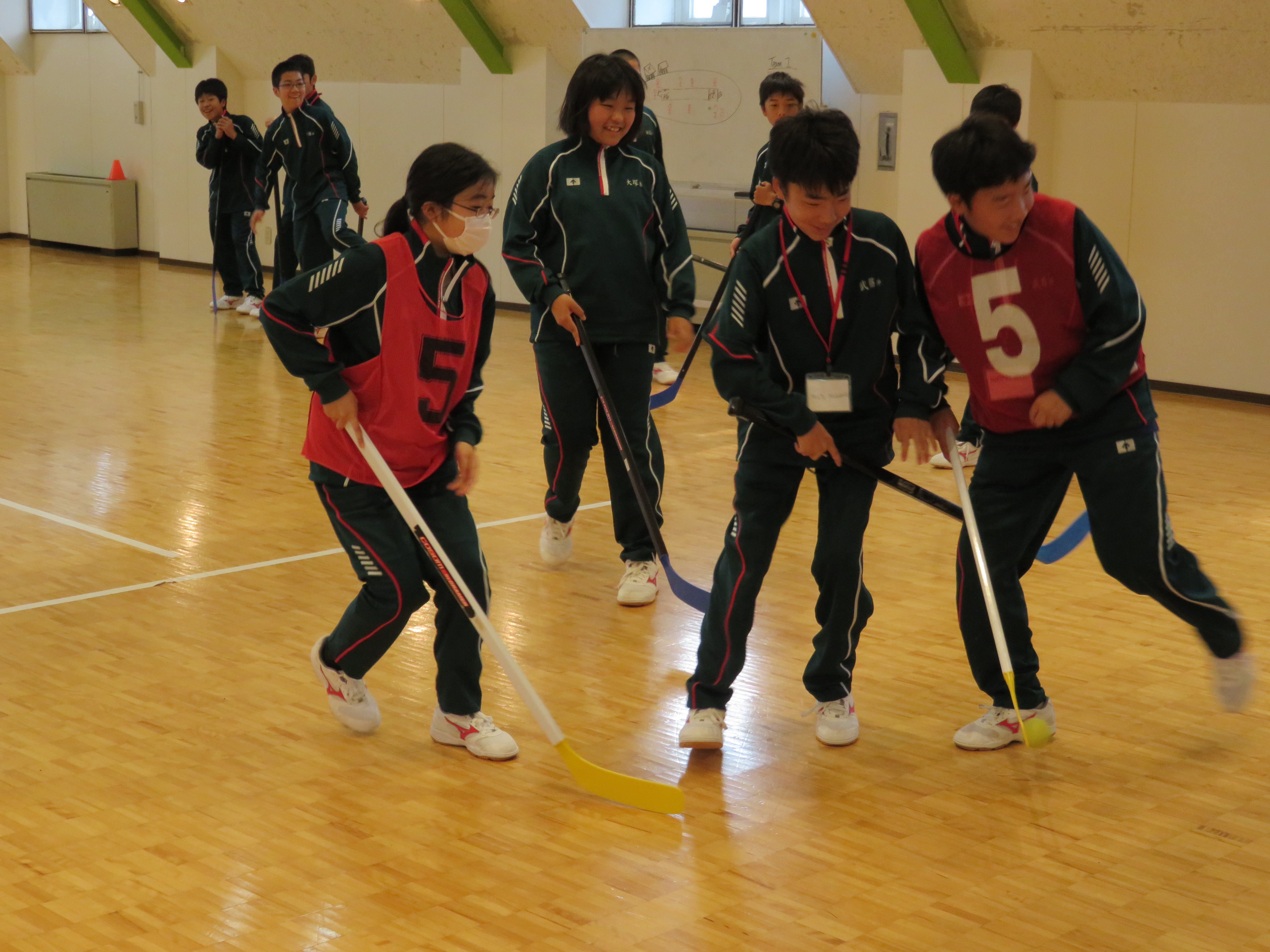 午前中は外国人講師のもと、生卵を割らずに落下させるという「サイエンス・チャレンジ」、英国の伝統的なスポーツである「ホッケー」を体験しました。また、海外に行った時に困らないために、方角や方向を伝える「正確な表現」を学びました。