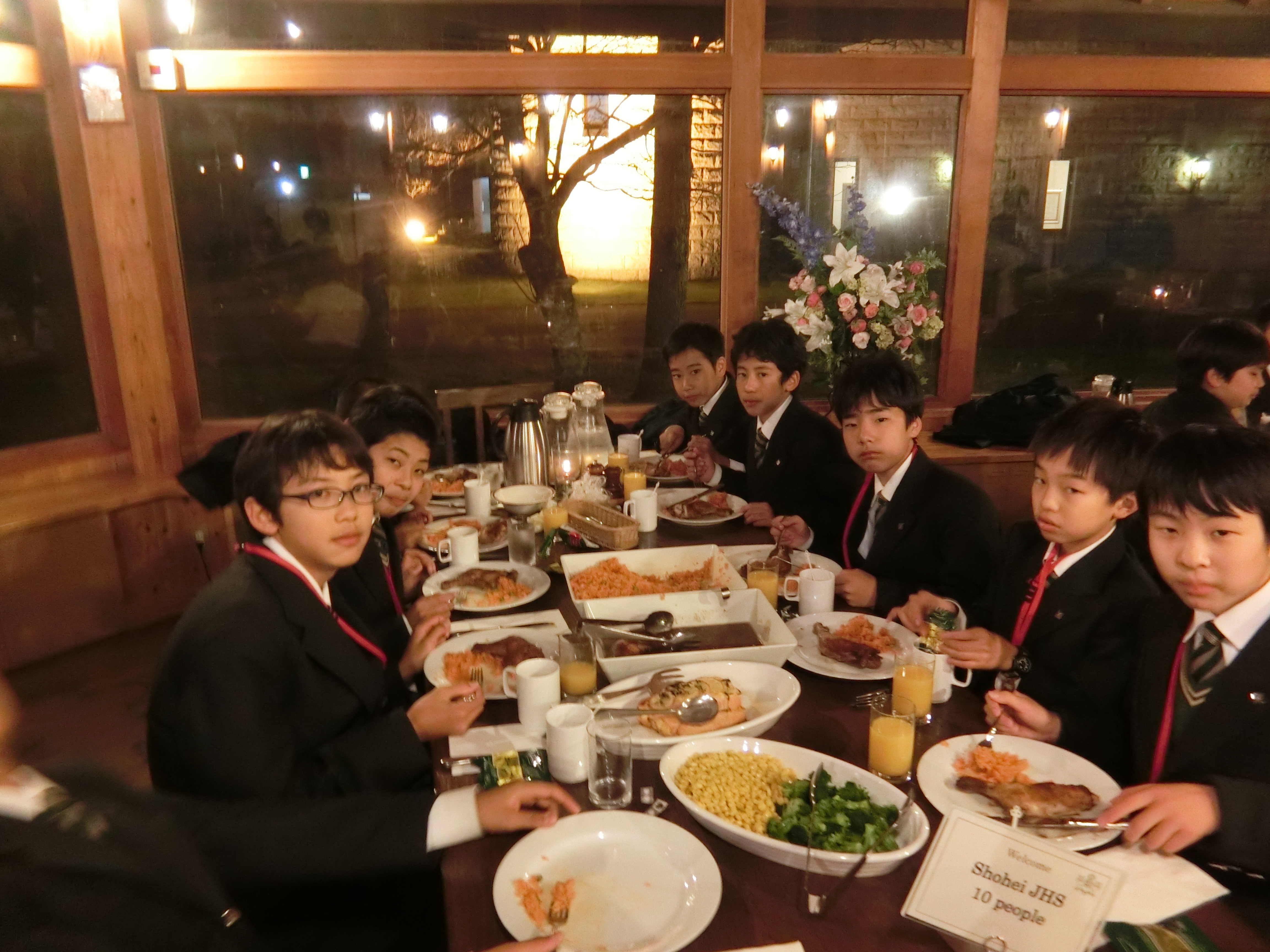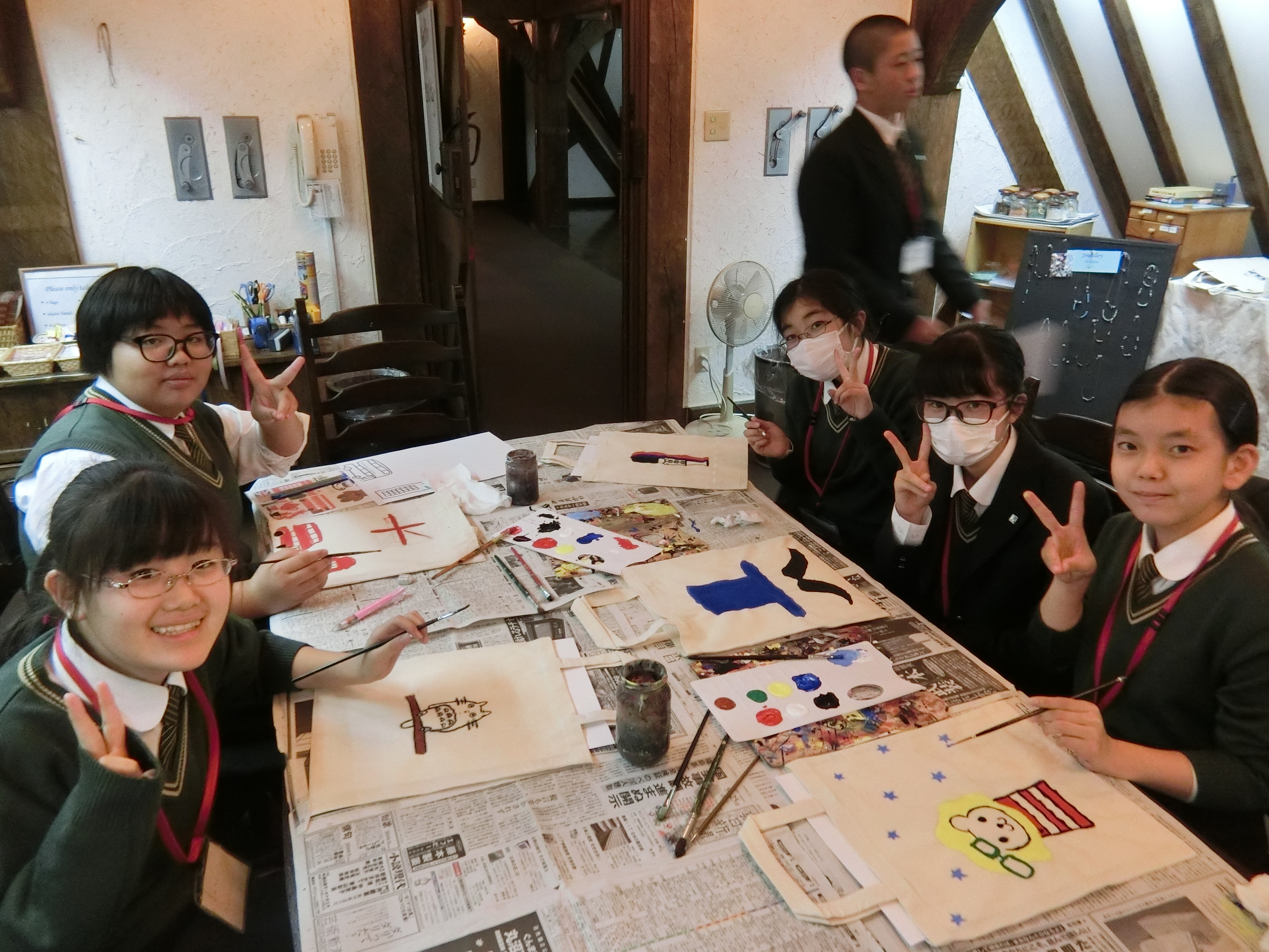 午後からは、「Cooking Scones」、「Gel-Candle Making」、「Calligraphy」、「Fabric Painting」 のプログラム中から、生徒それぞれが選び、みんなが熱心に作品を作り上げていました。この作品は大切なお土産となります。夕食はこれまでと会場を変え、英国の家庭的な料理をおいしくいただきました。