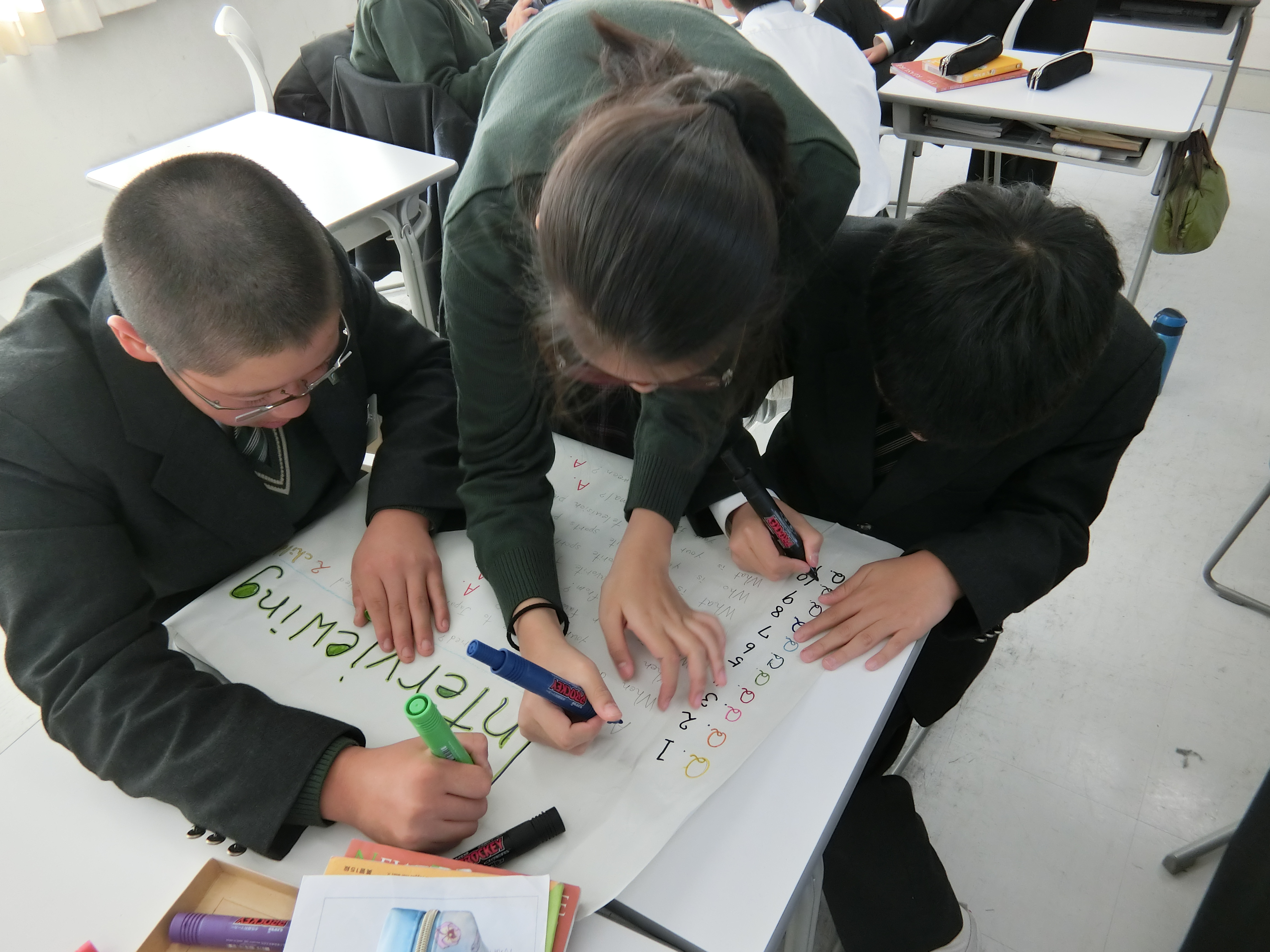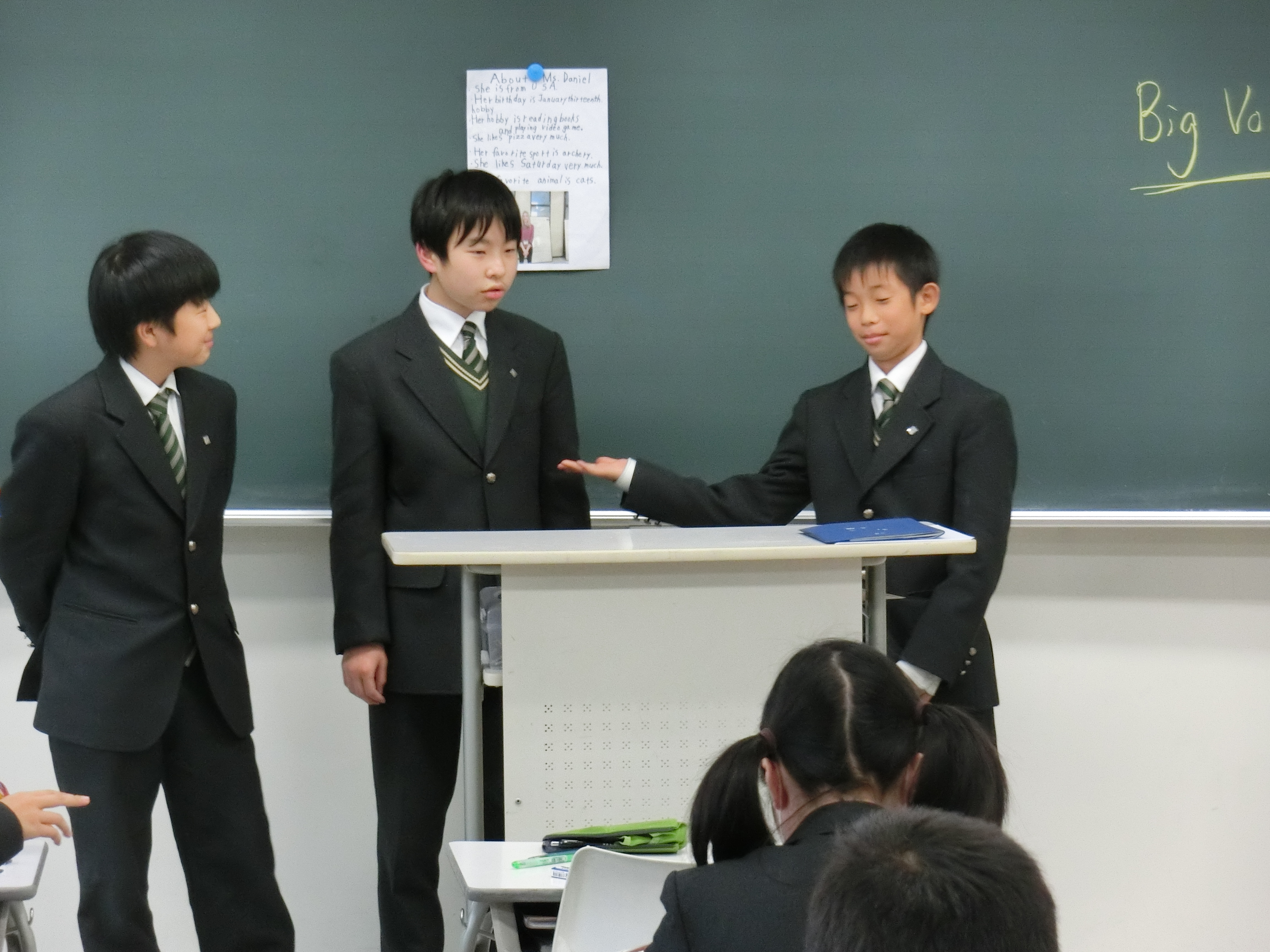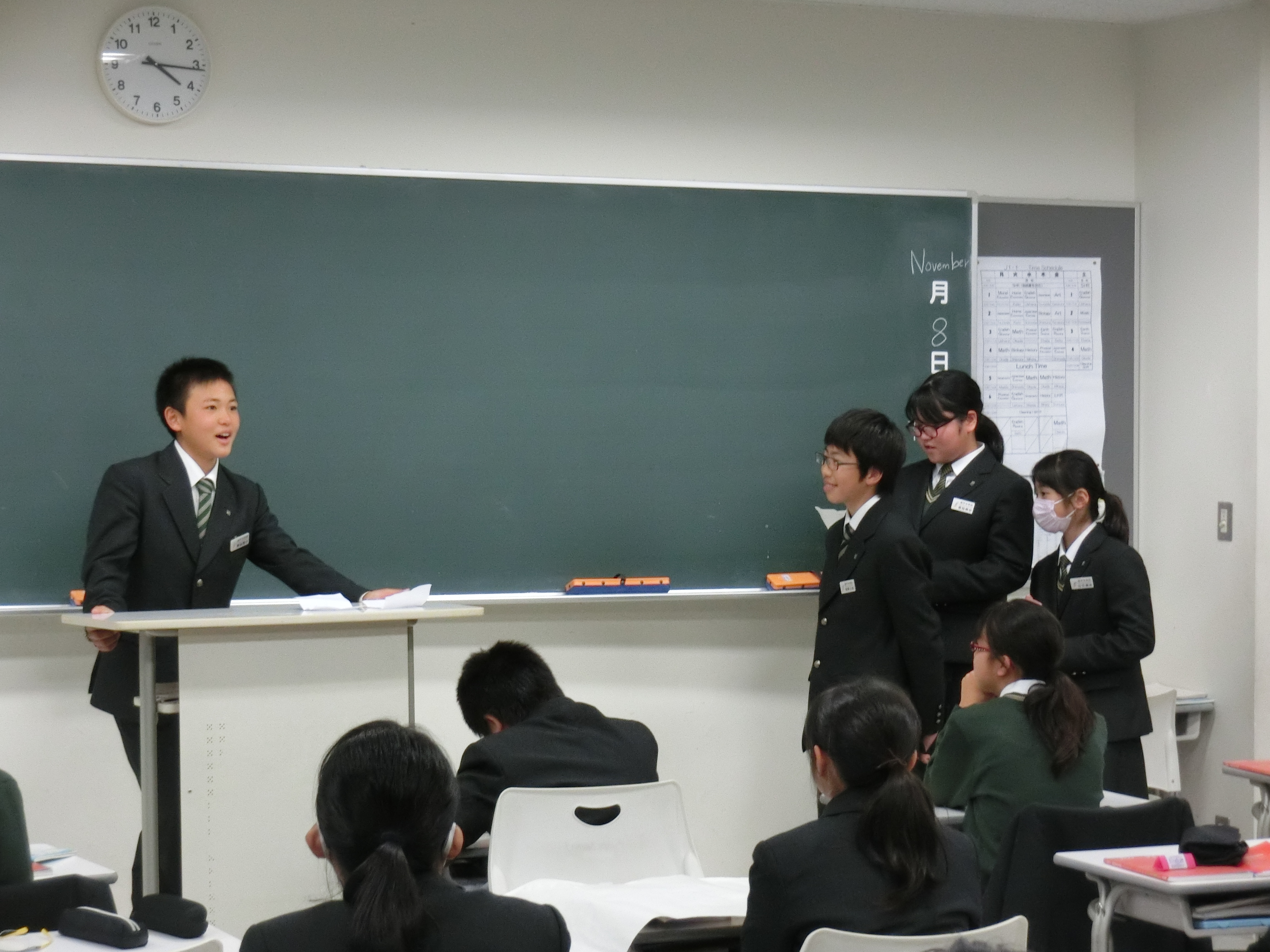 中学1年生の英語では、”Our Native Teachers”というテーマで、ネイティブの先生にインタビューをし、レポートを作って発表する授業を行いました。グループの中で質問したいことを決め、それぞれインタビューに行きました。レポートも上手にまとめられており、発表では、劇を行ったり、コントやクイズ形式等さまざまな工夫がされ、とてもユニークなものとなっていました。次回は地理と英語のコラボレーションの発表となります。徐々に上達しているプレゼンに乞うご期待です。