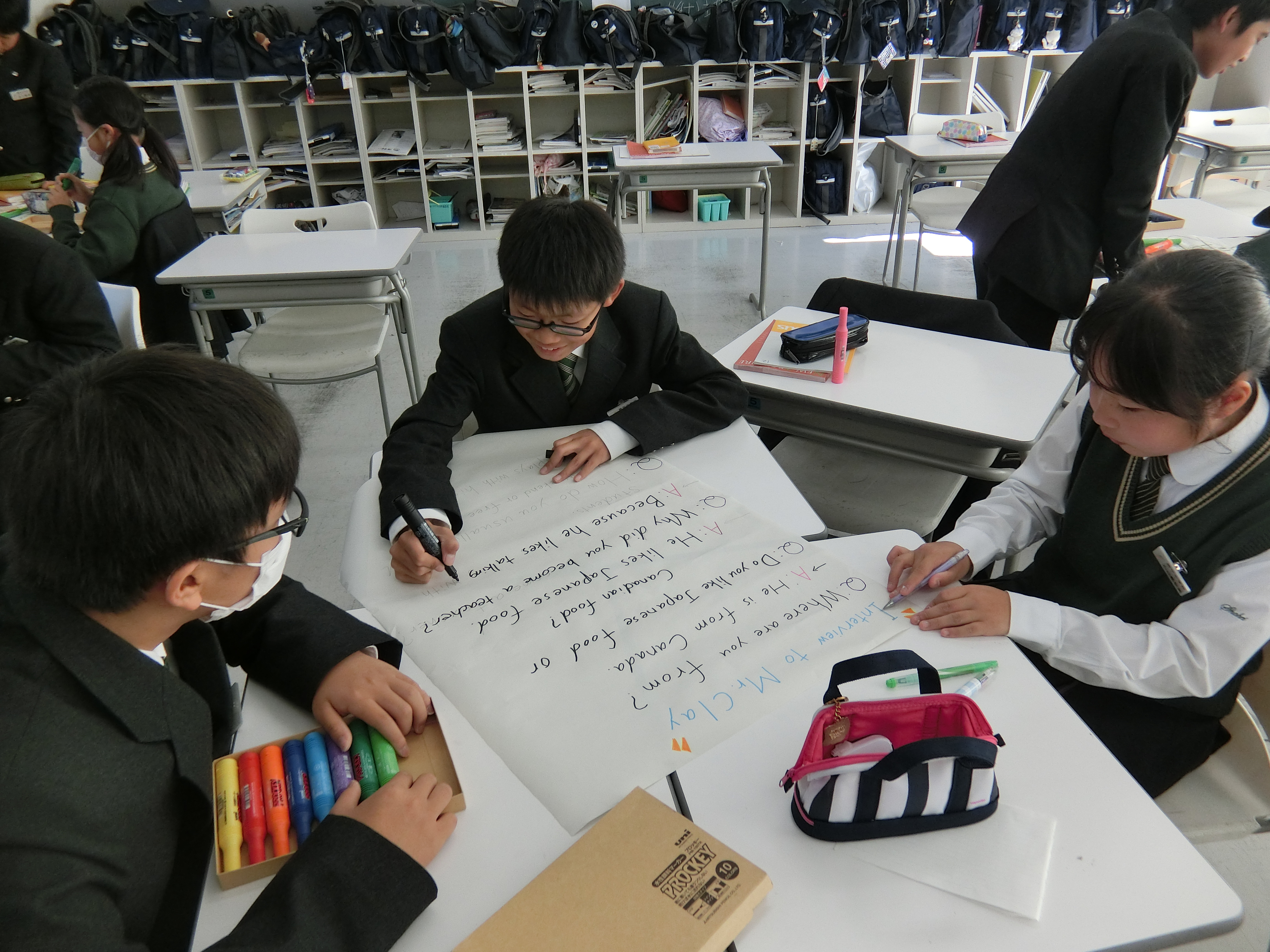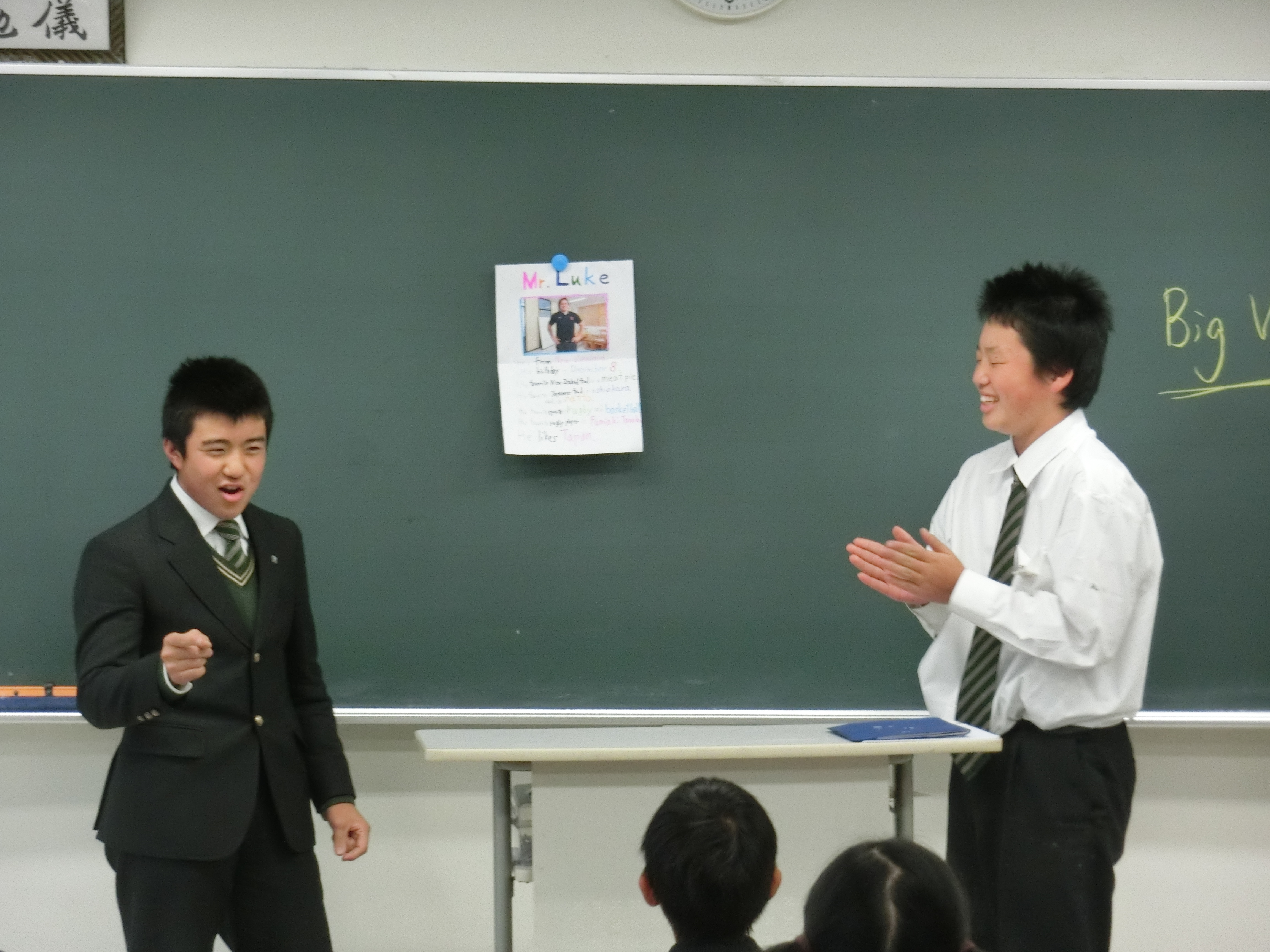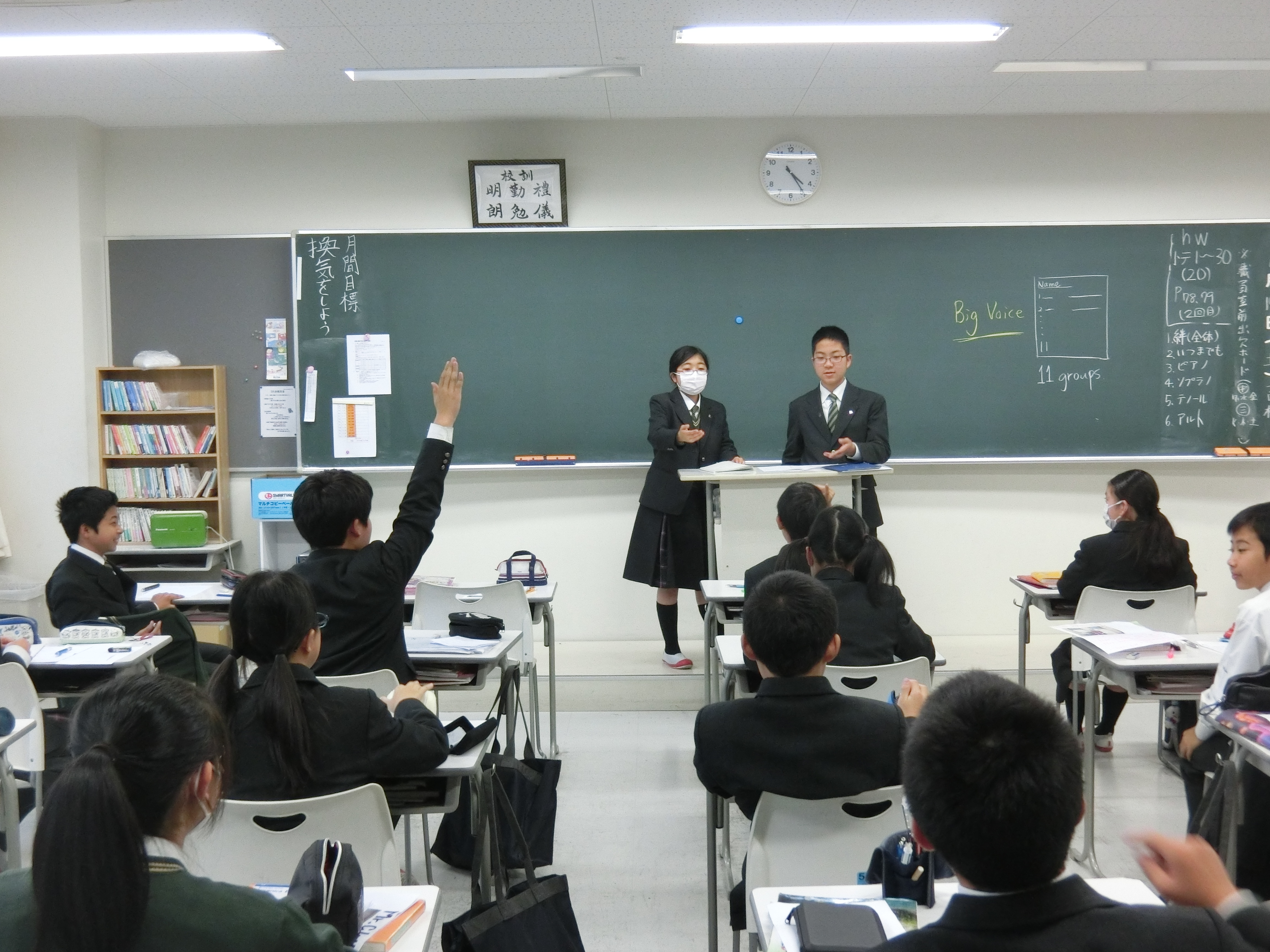 中学1年生の英語では、”Our Native Teachers”というテーマで、ネイティブの先生にインタビューをし、レポートを作って発表する授業を行いました。グループの中で質問したいことを決め、それぞれインタビューに行きました。レポートも上手にまとめられており、発表では、劇を行ったり、コントやクイズ形式等さまざまな工夫がされ、とてもユニークなものとなっていました。次回は地理と英語のコラボレーションの発表となります。徐々に上達しているプレゼンに乞うご期待です。