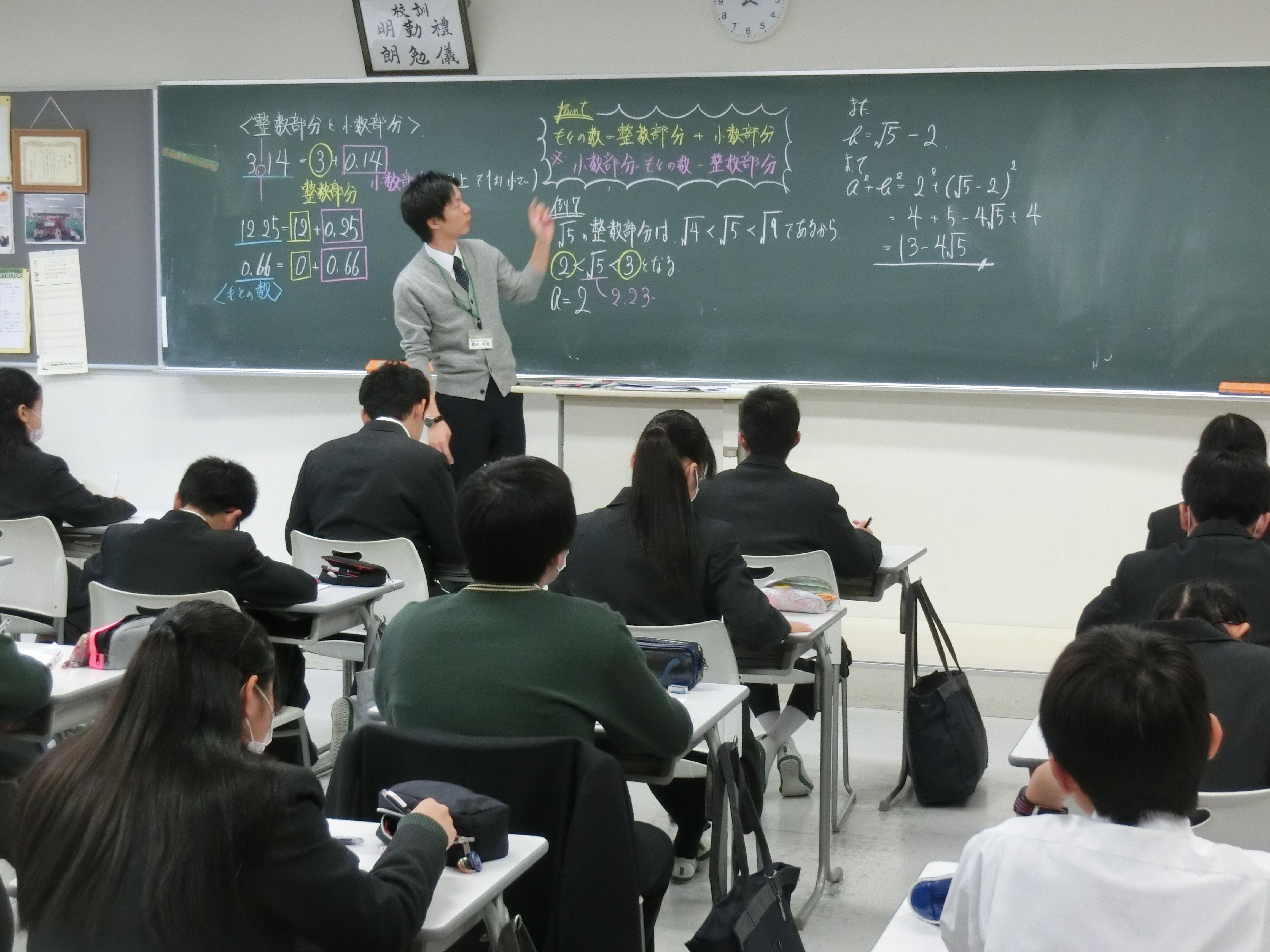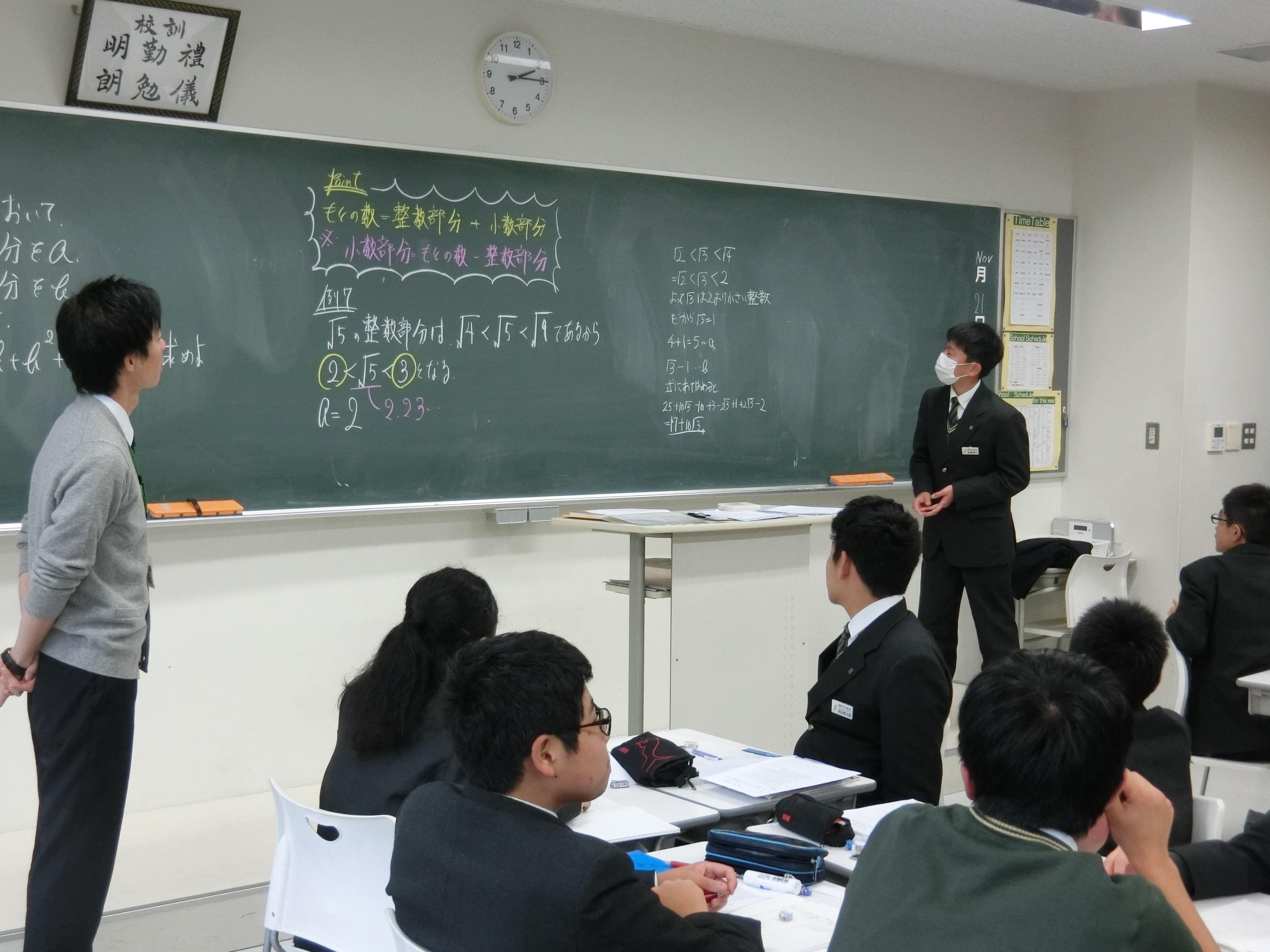 本日、2-1にて数学科の奥田先生によるIBの研究授業が行われました。高校でもアクティブラーニングが導入されるということで、中高から多くの先生が見学にいらしてくださいました。代数の「平方根」の範囲で、整数部分をa,小数部分をbとし、グループで意見交換をしながら問題解決をするアクティビティを行いました。生徒たちは多くの先生に見られて緊張した様子もありましたが、一生懸命活動していました。