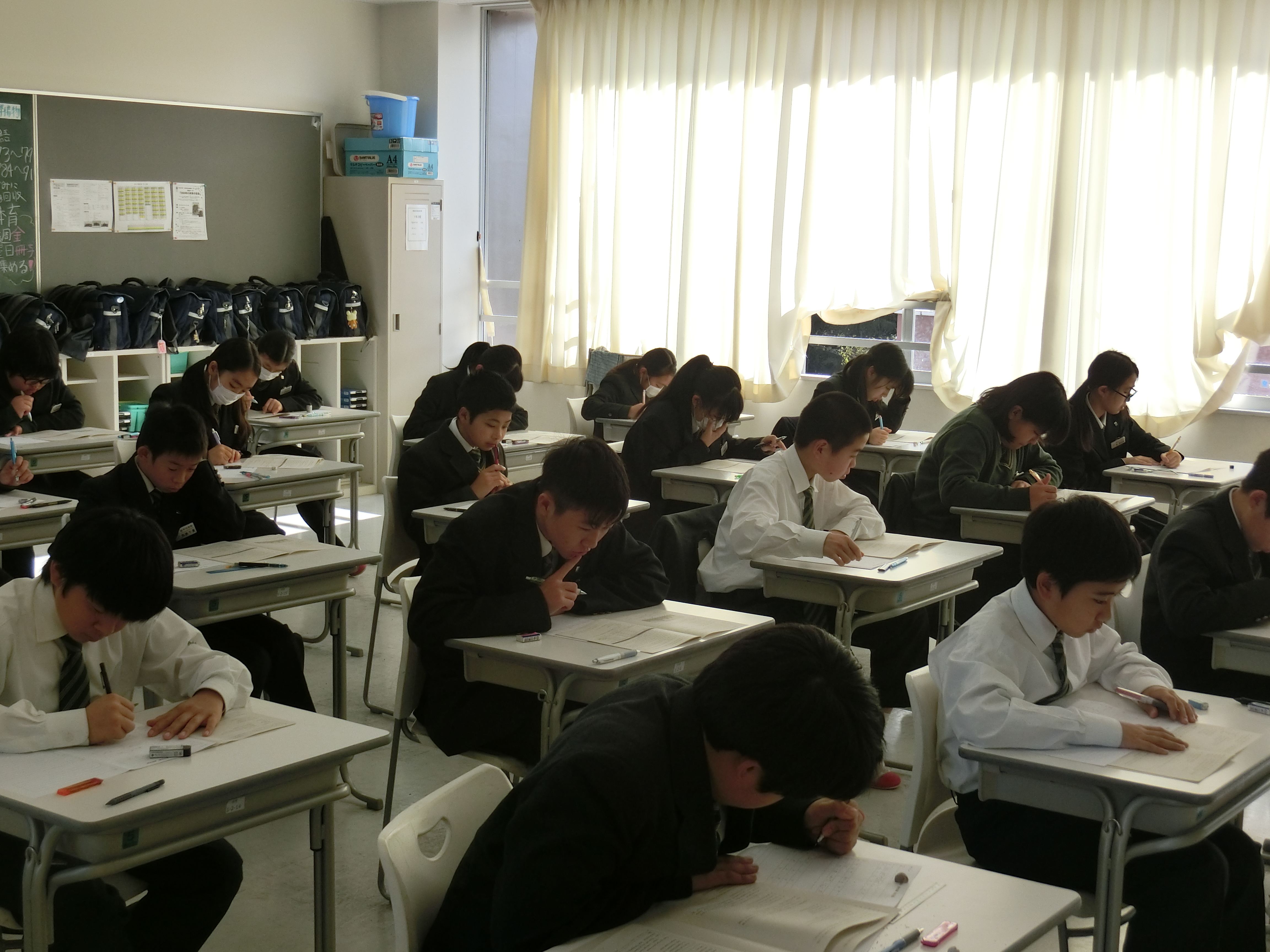 本日は期末考査第1日目でした。週末は計画的に学習できたでしょうか。本日は理科(地学・生物・化学)、保健、技術・家庭、英語Rが行われました。朝から先生に質問している生徒が多く見られましたが結果はどうでしょうか。今日も時間をうまく使って勉強しましょう。