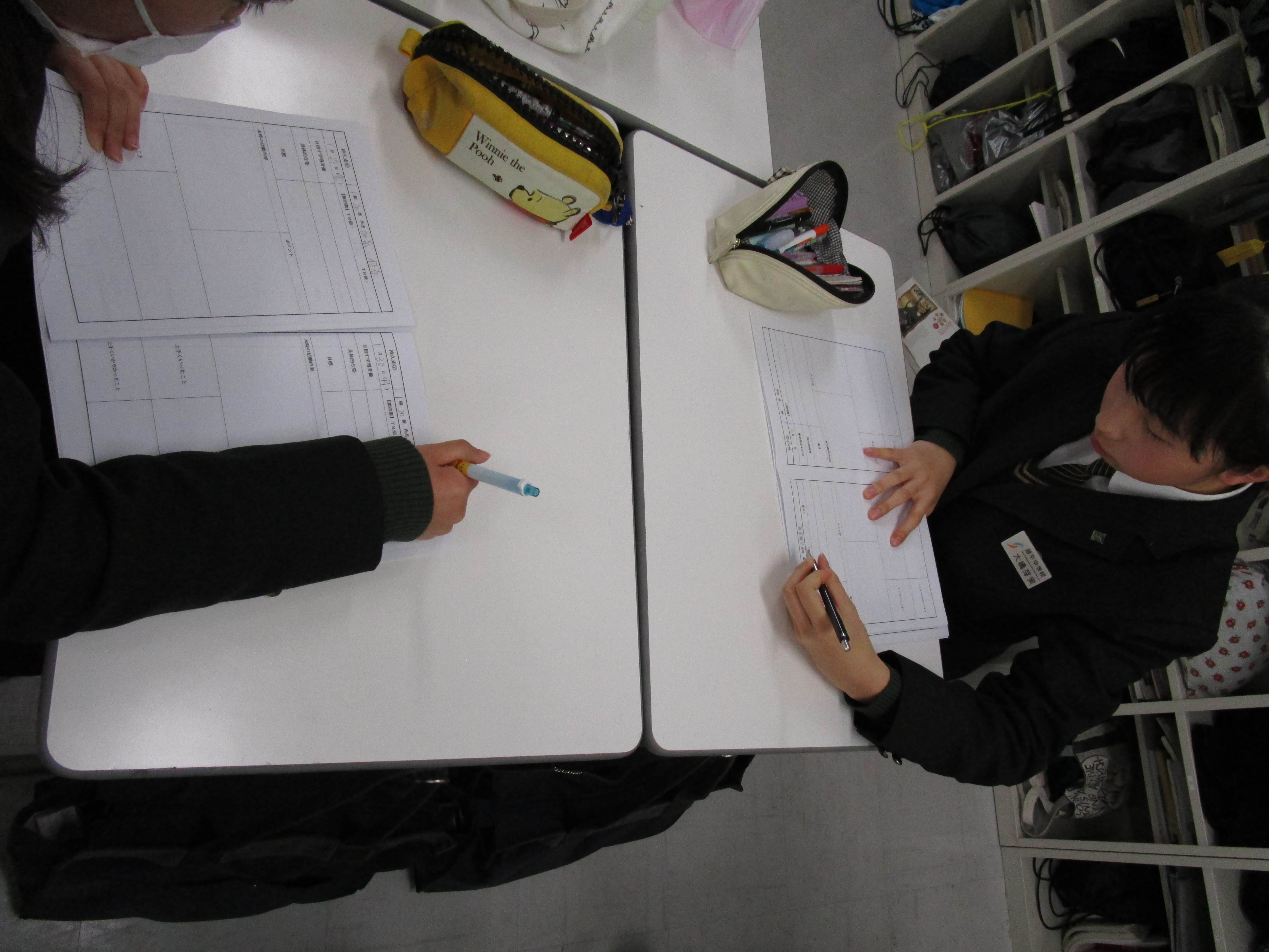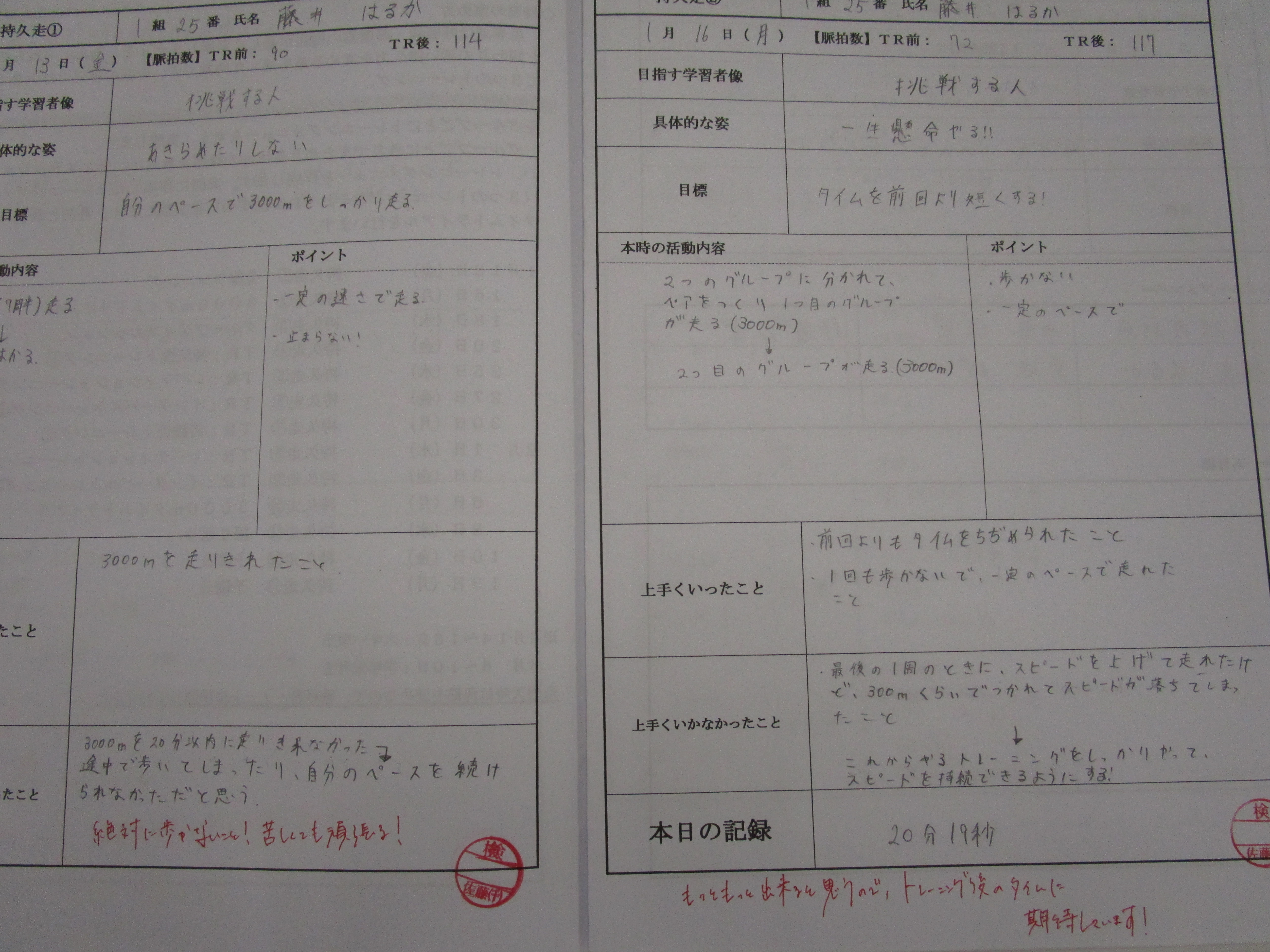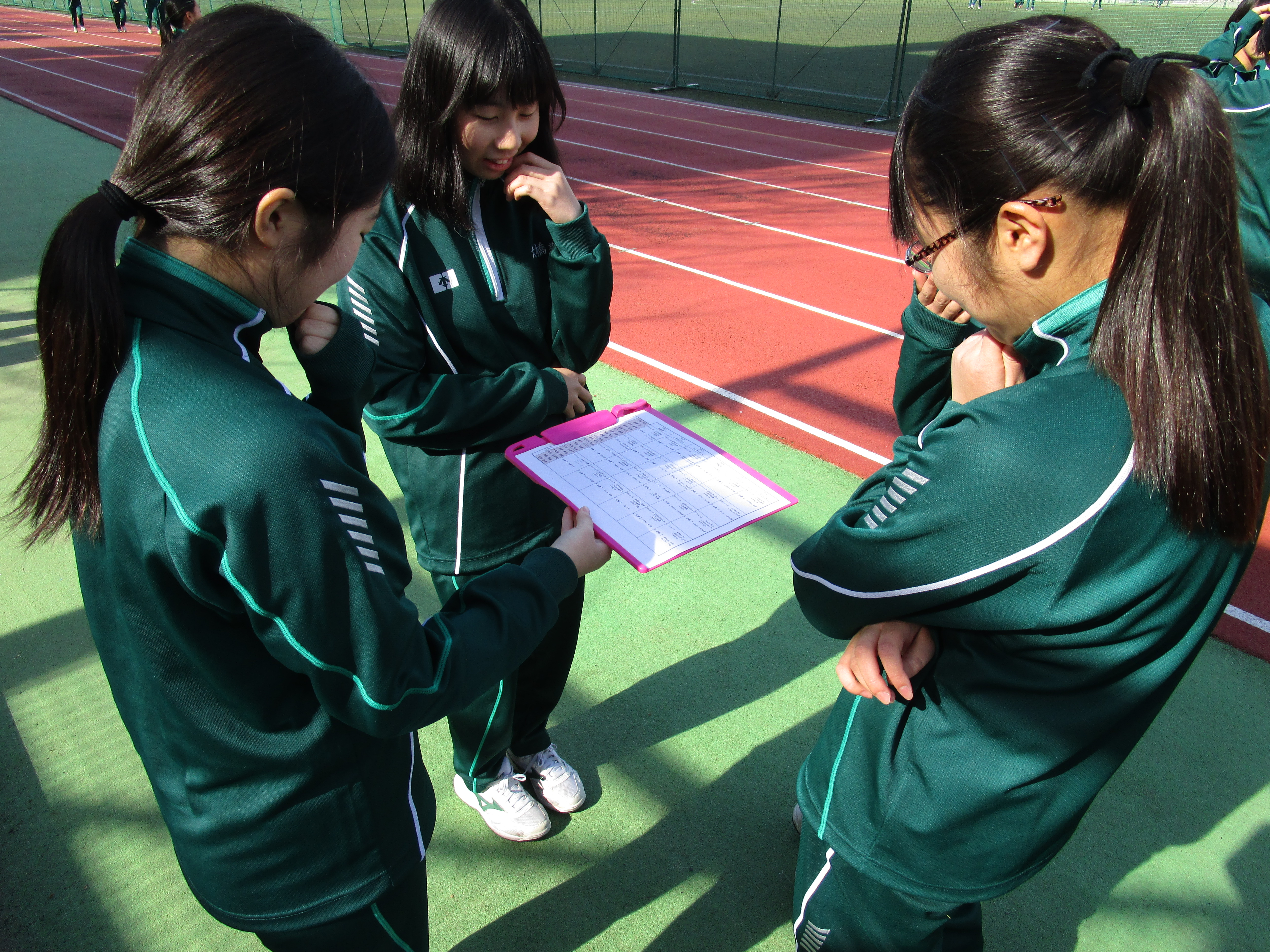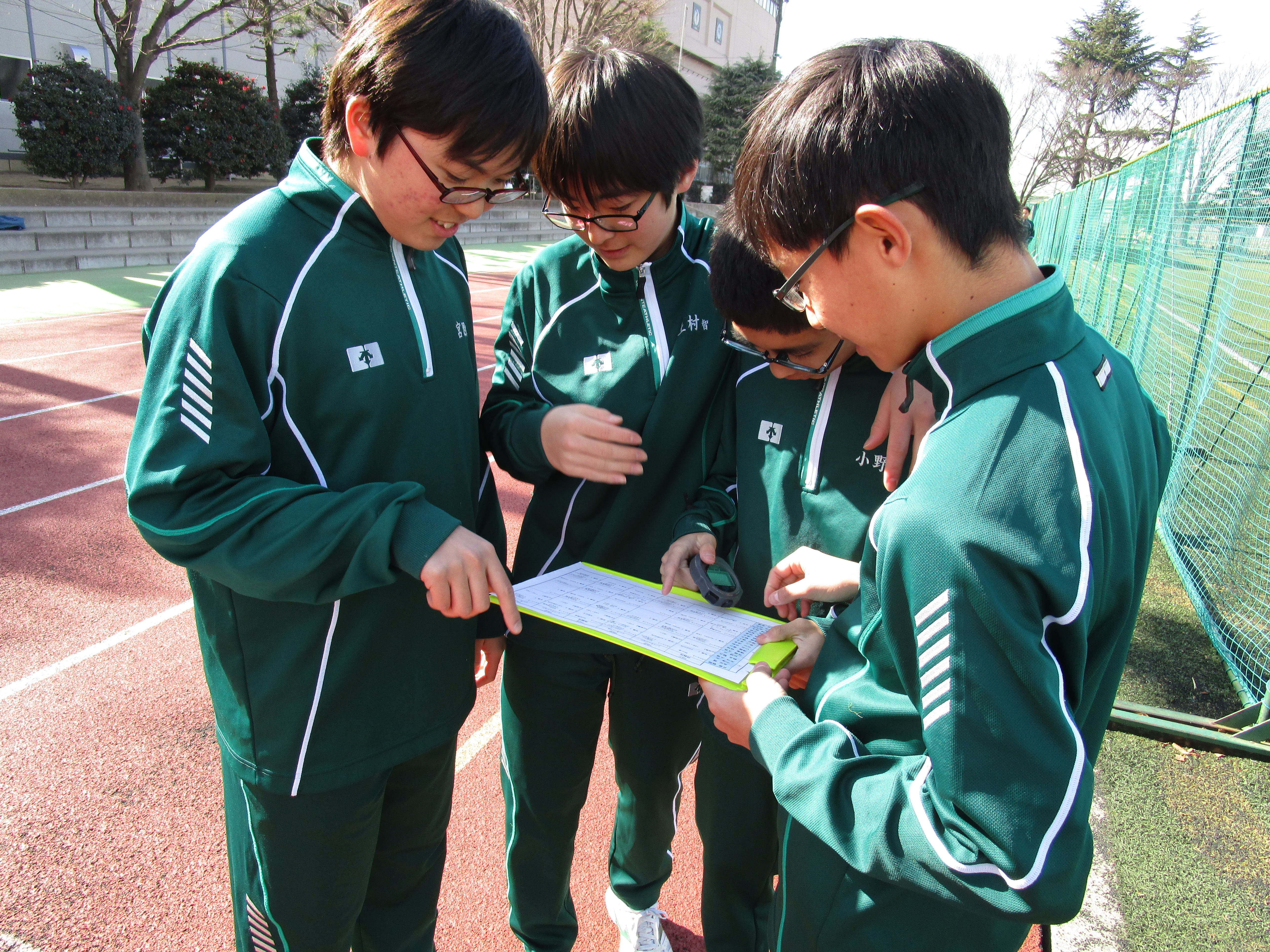 新しい単元前にはその競技のことや効果的なトレーニング方法を調べ学習する、体育の授業に筆記用具やプリントを持参する、授業の後には冊子にその日のトレーニングを記しレポートを提出する、それが昌平中学校の体育です。調べたり、振り返ったりしているので自分達でトレーニングの方法を決めて取り組んでいます。走る前、中間、走った後に脈拍もしっかり自分ではかります。持久走では「レペテーション」「インターバル」「持続的」の3種類のトレーニングがあり、順番にトレーニングしていきます。自分達の班がより力をつけるための目標値の設定を班で話し合い決めます。それをもとにその日のトレーニングをストップウォッチを首に下げて開始します。「自分の力を知る」ということは非常に大切で、それが「自分の目標を立てられる」「自分の力を上げられる」ことに直結することを生徒達は体感しています。体育のあと、昼休みにさっそくレポート冊子の記入をしています。