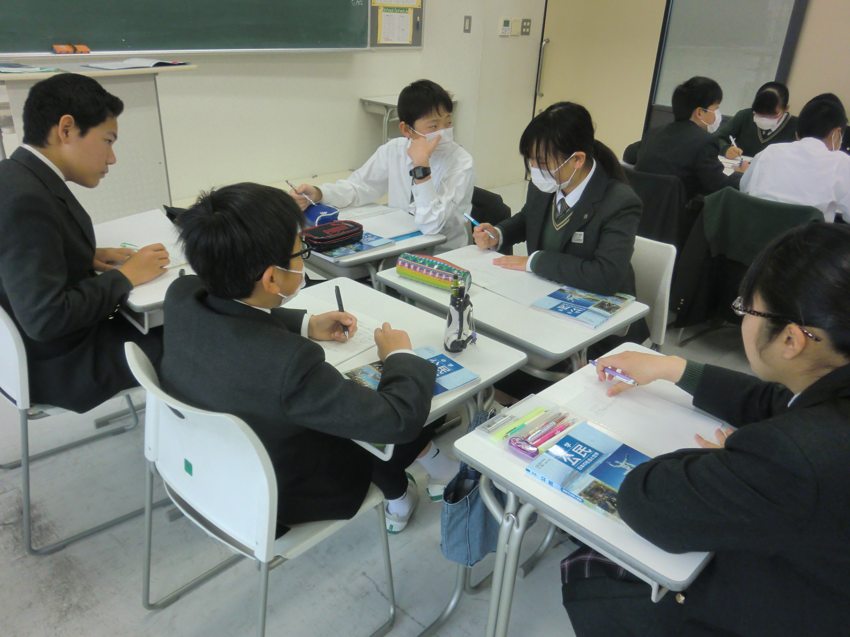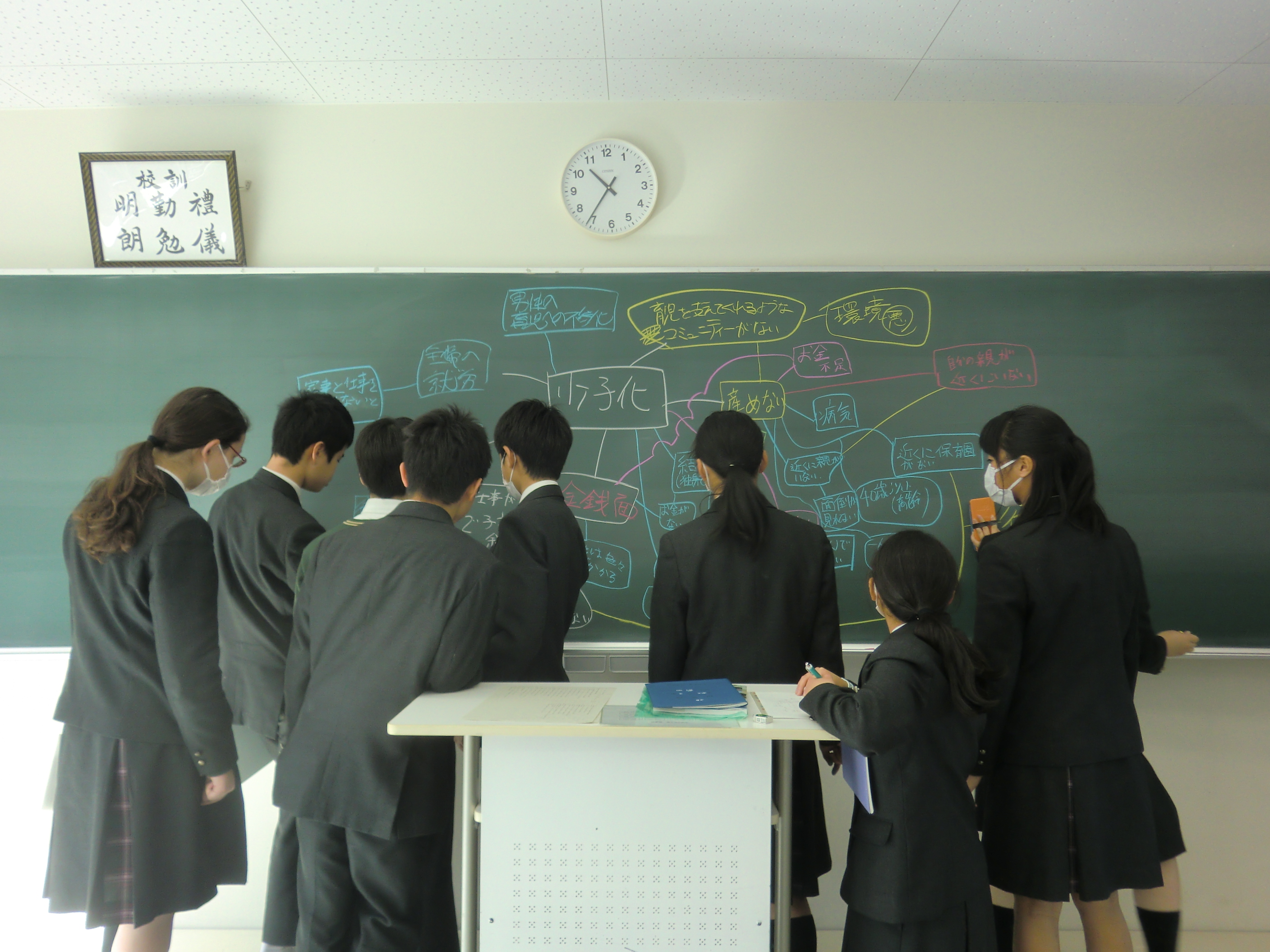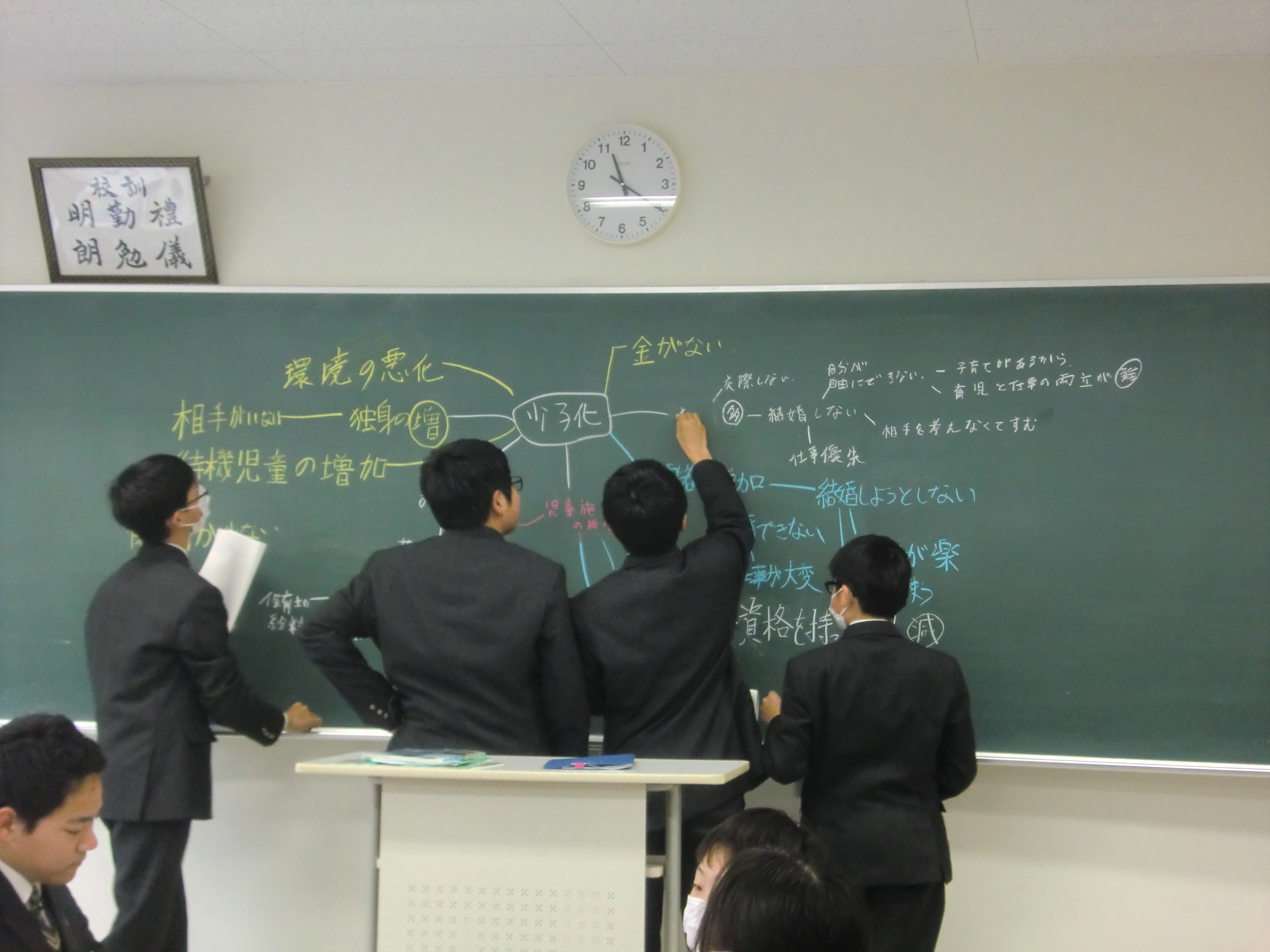 中学2年生では公民の学習が始まりました。現在は少子高齢化問題について考えています。社会科は、覚える必要のある知識はあります。しかし単に丸暗記しても意味はありませんし、すぐに忘れてしまいます。思考した上で理解していくことが大切です。少子高齢化も単に覚えるのではなく、なぜ少子高齢化が進んでいるのか、それによってどのような問題が生まれているかを考えました。一人一人が個人で考えても限界があります。グループで話し合い、文字にすることで深く考えることが出来ました。
