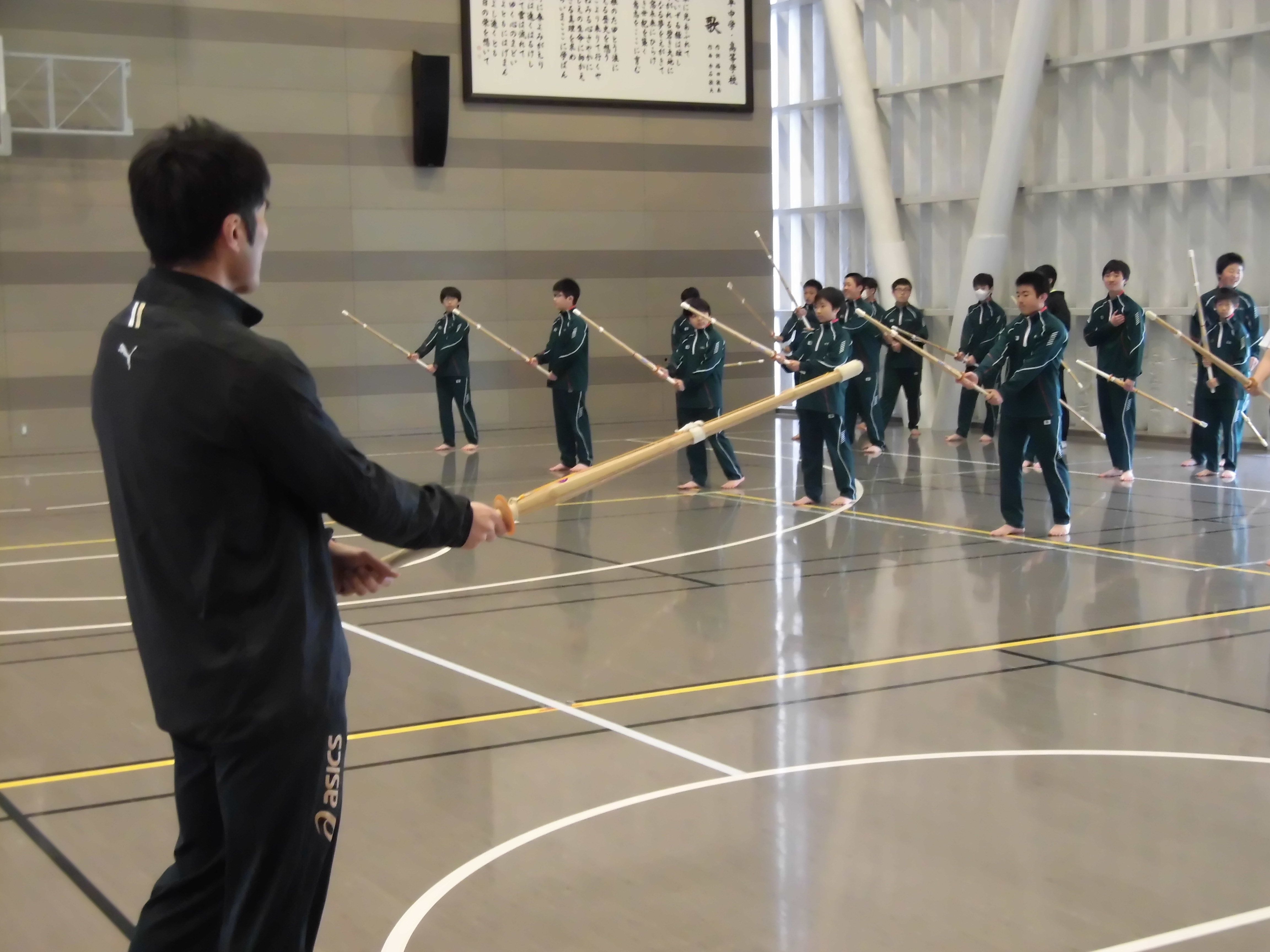 1年生は体育の時間に剣道を行っています。ほとんどの生徒が初めて竹刀に触れました。竹刀の重さ、長さをうまく扱えない生徒もいませが、楽しそうに素振りをしている様子が見受けられました。来週からは試験1週間前となり部活動もお休みとなります。体育の時間に思う存分身体を動かし、リフレッシュしてほしいなと思います。また、土日がお休みになりますので、学年末に向けて家庭学習にも更に力を入れていきましょう。