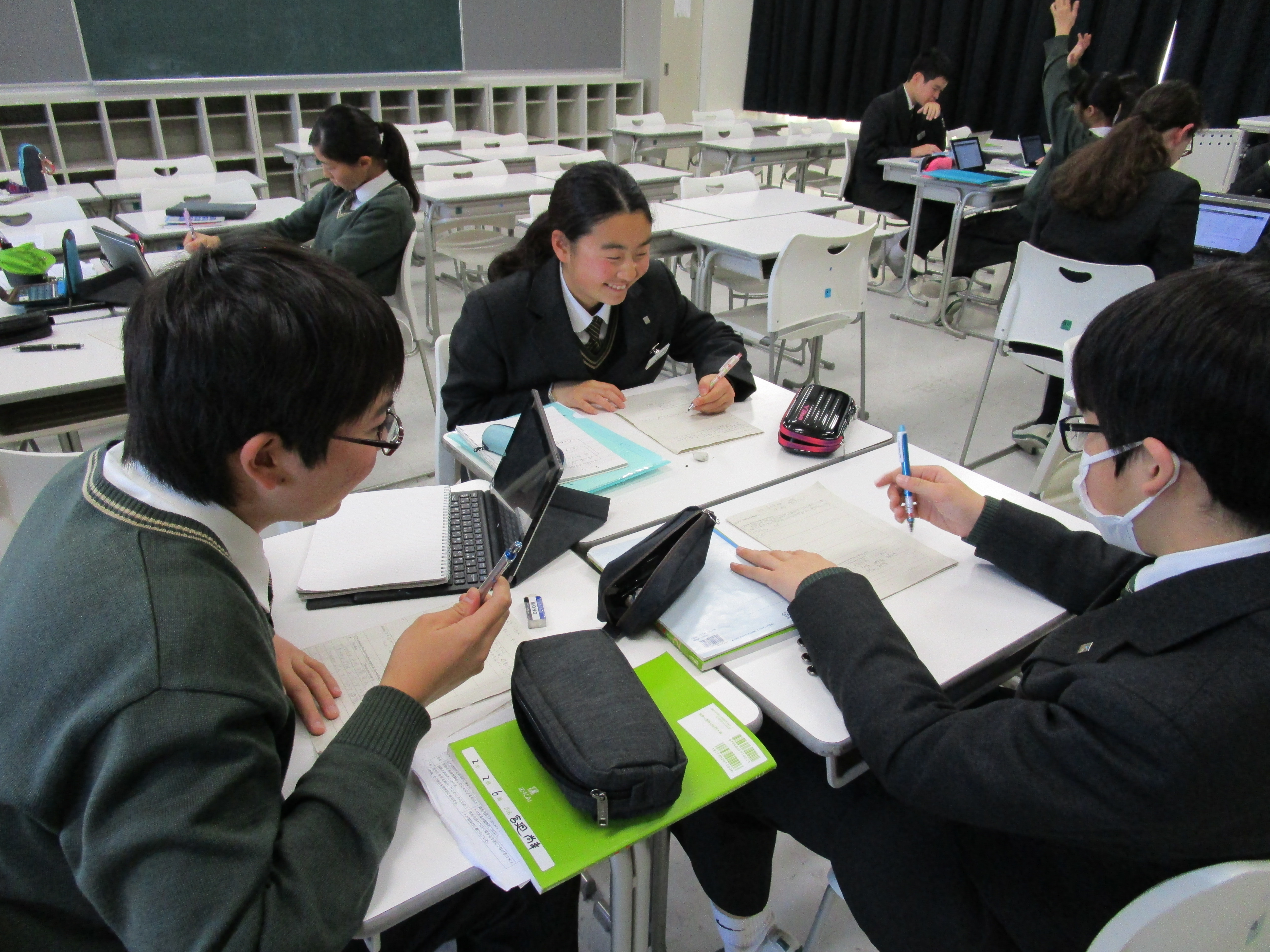 昌平中学校では朝読書の時間が毎日あります。自分の好きな本を用意し、時間になると私語をやめ、それぞれが読書に没頭します。読書から得られることははかり知れません。教科書や授業とは違った教養を自分の頭の中で育てていると言えます。2年生の英語では、今年度のIB授業の締めくくりとして「物語」を作っています。英語という教科の中でのみ学ぶのではなく、朝読書を教科につなげ、教科を生活につなげています。まずグループで「作家名」を決めました。夏目スミス(夏目漱石と結婚したスミスという作家、という想定)などのユニークな作家名もあります。ジャンルもSF、コメディ、歴史、ミステリー等さまざまです。グループにはリーダー、アドバイザー、チェッカーという役割がそれぞれにあり、創作活動を効率よく進めています。常に受け手の存在を意識することが大切で、この活動では読者をひきつける「展開」を考えながら創っています。エンディングを隠し、中間発表を行ない、他の作家からエンディングの展開にアドバイスをもらい仕上げる予定です。今から出来上がりが楽しみです。写真を見ると出版社の編集会議のようですね。白熱しています。