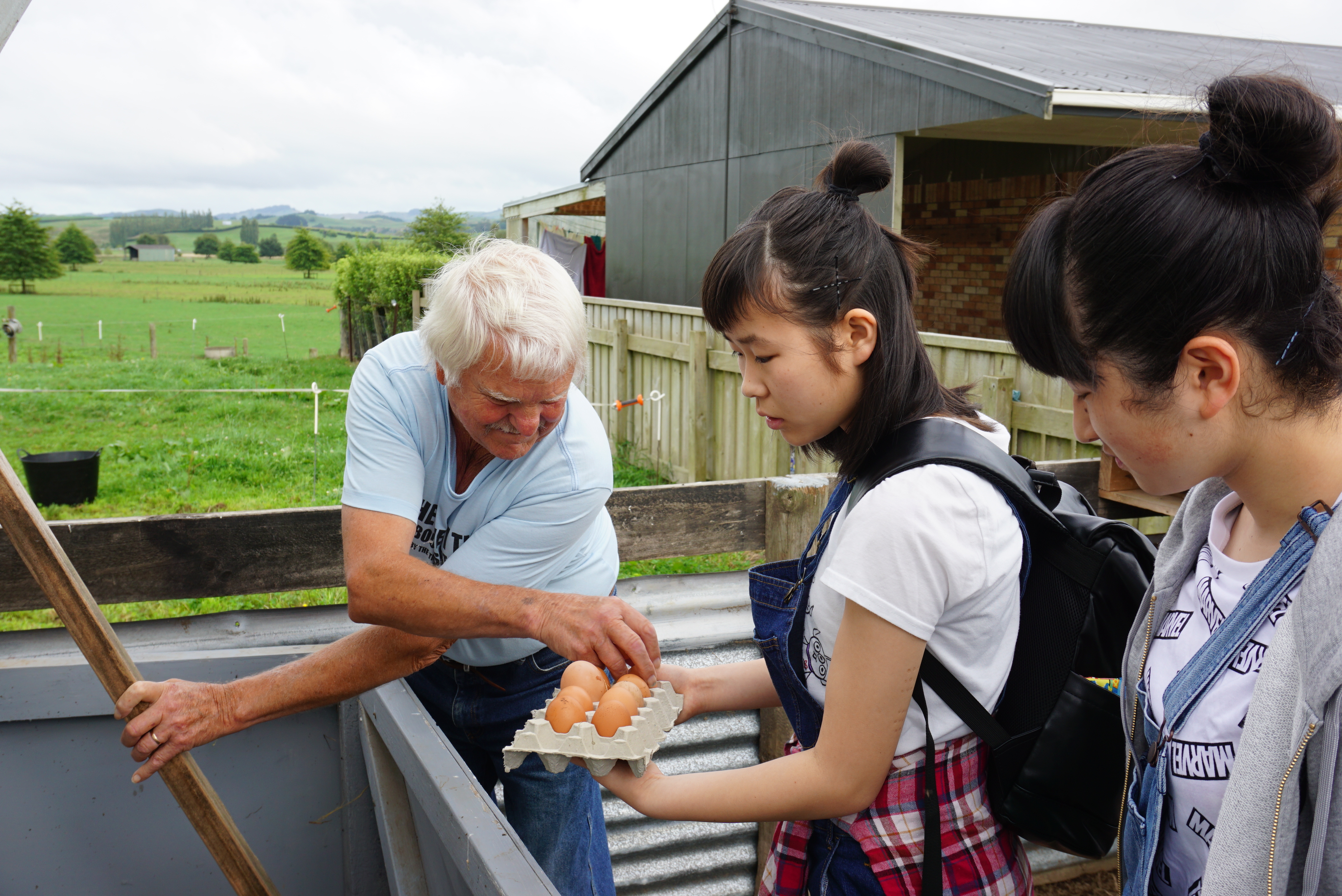 午前中は今日もファームステイ先のお宅に訪問し生徒と対面しました。一件目は男子チームがお世話になっているお宅で、自分で捕まえてきた野ウサギを食べている犬がいたり、飼っている馬と触れ合ったりと都会では味わえないファーム暮らしを満喫している様子でした。二件目は女子のチームで、すっかり農場ファッションになって、ホストファザーとちょうど卵の収穫に行くところでした。搾乳を見て回ったり、ビーチに行ったりもしているようです。コミュニケーションが上手だとほめられていました。