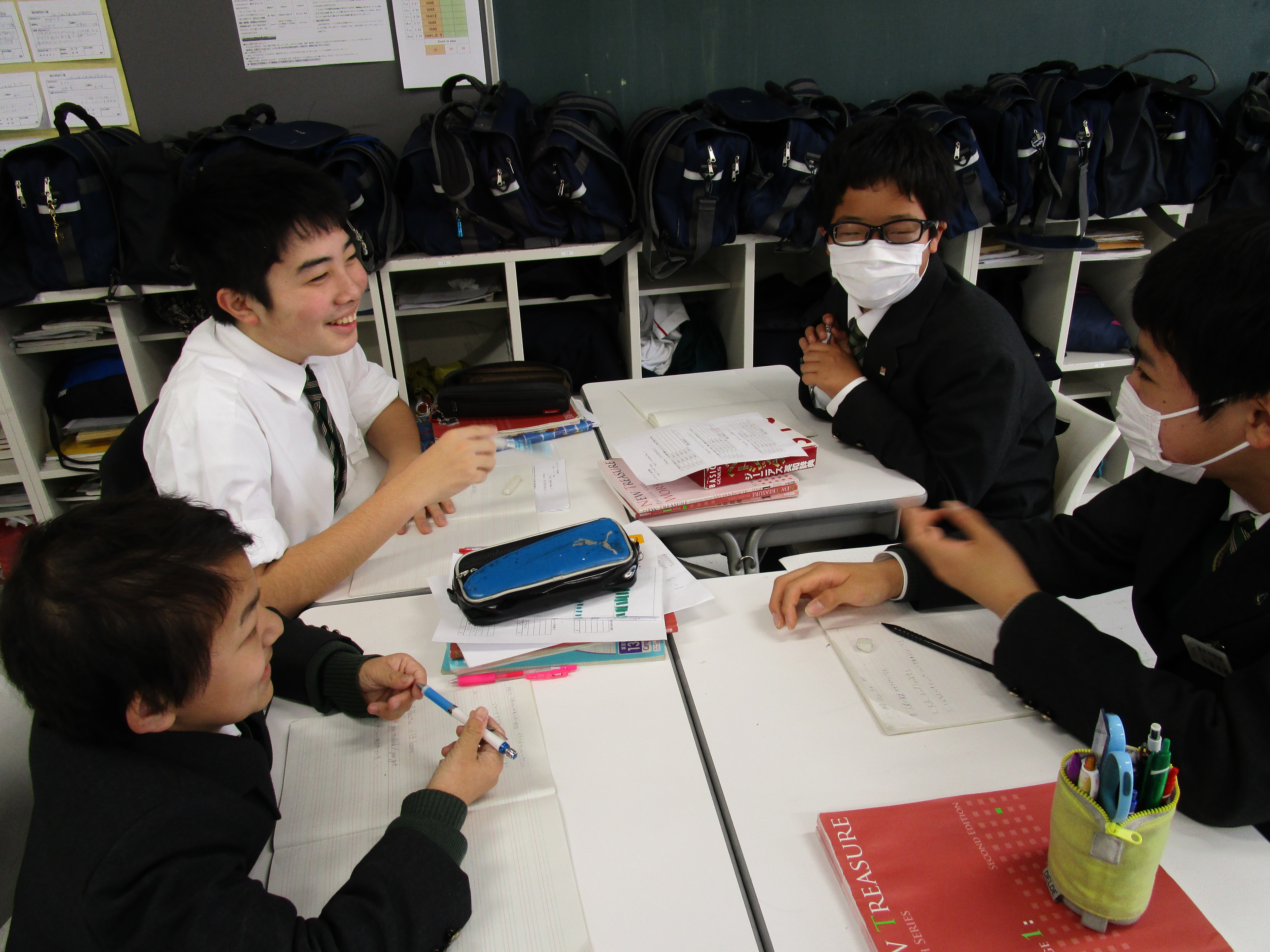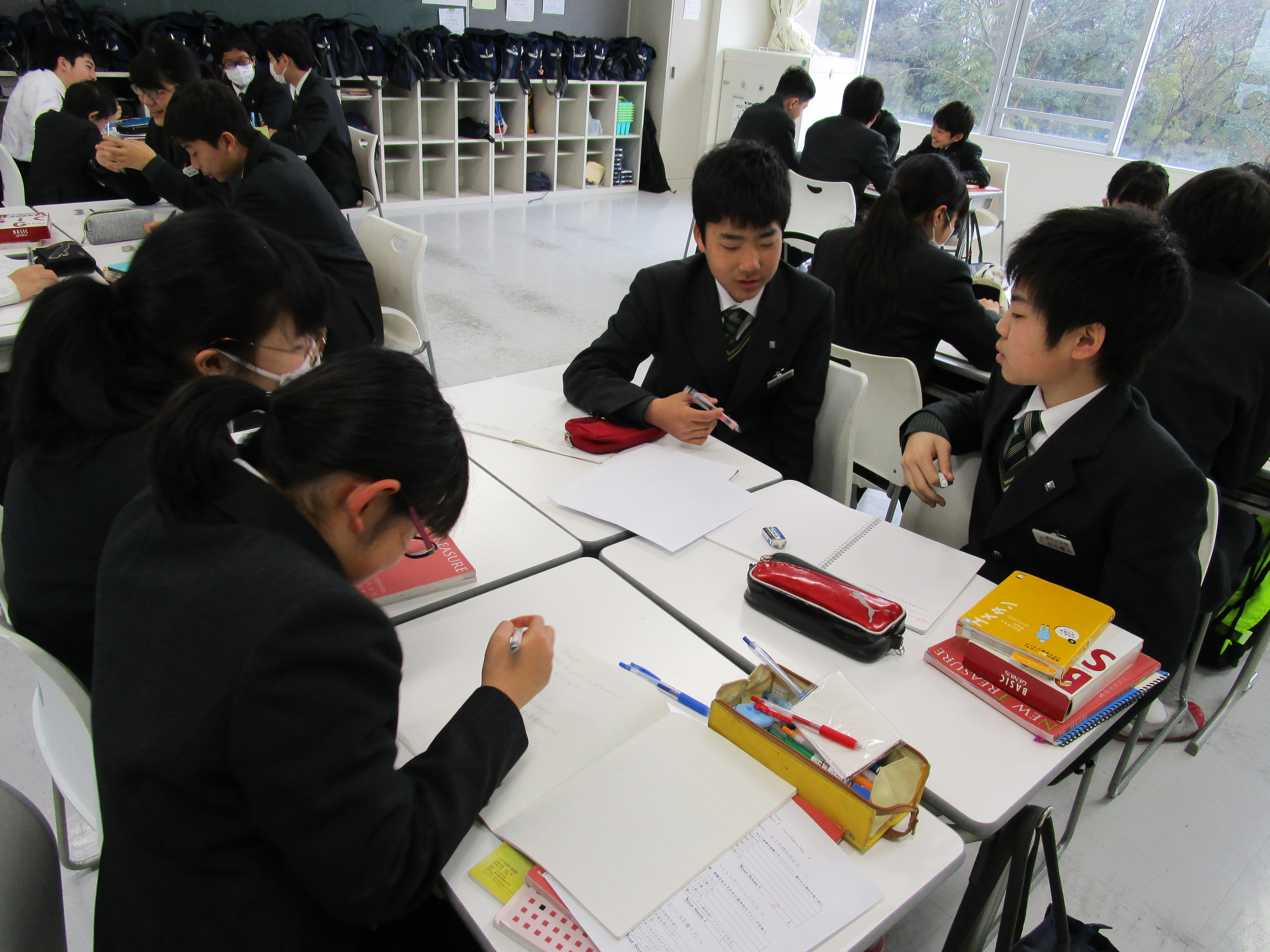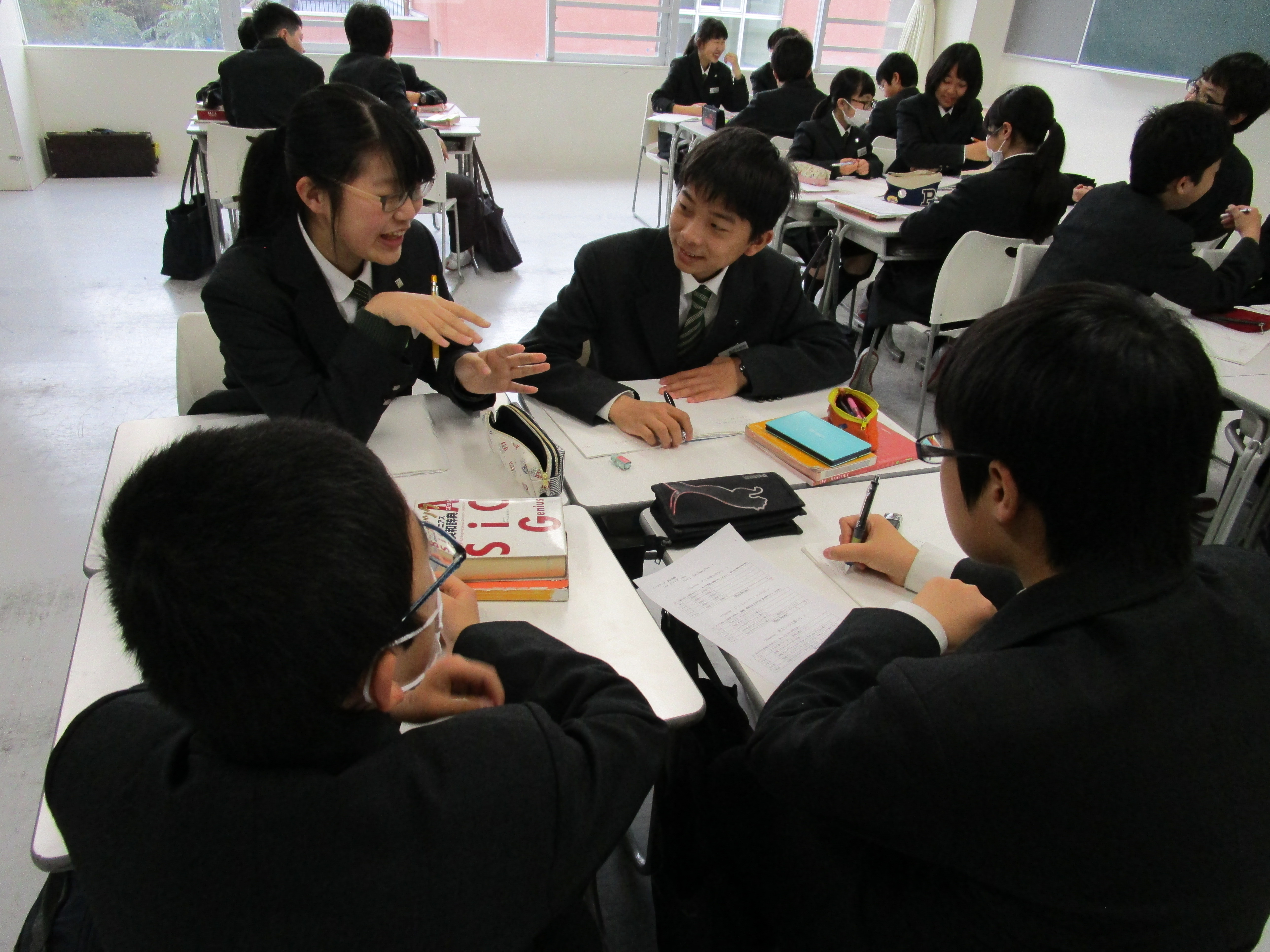 昌平中学校に入学して初めてIBの授業を受けた一年生の今年度最後となるIB英語の授業が行なわれました。今までの授業と全く違う形式で様々なことを学んできたこの1年間を振り返り、「1.身についた力」「2.足りなかった力」「3.二年生になってつけたい力」について、グループで話し合いました。お互いに自分の三つの力を友達に話すことで改めて自分を客観的に評価し、話し合いからは友達からの助言も出ました。その時点ですでに力はついているといえます。自分も友達もお互いに高め合う方法をIB授業を通して自然に身につけたようです。IB教育は学力を育てることだけが目的ではありません。授業を通じて人との関係を考え、社会との関係を考え、そして学ぶ手法を自ら考え身につけます。二年生になってさらに人間力をつけていくたくましい姿を楽しみにしています。
