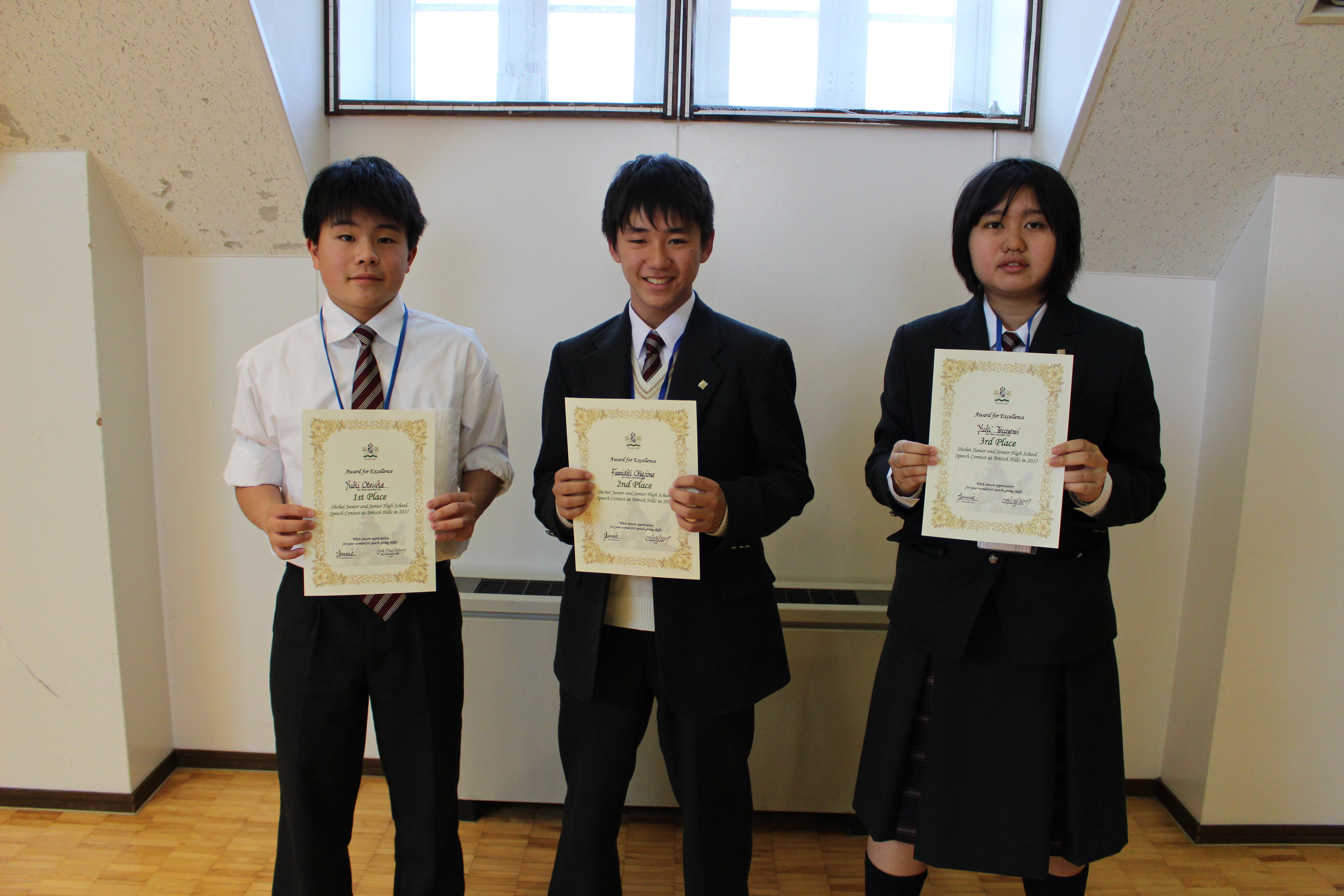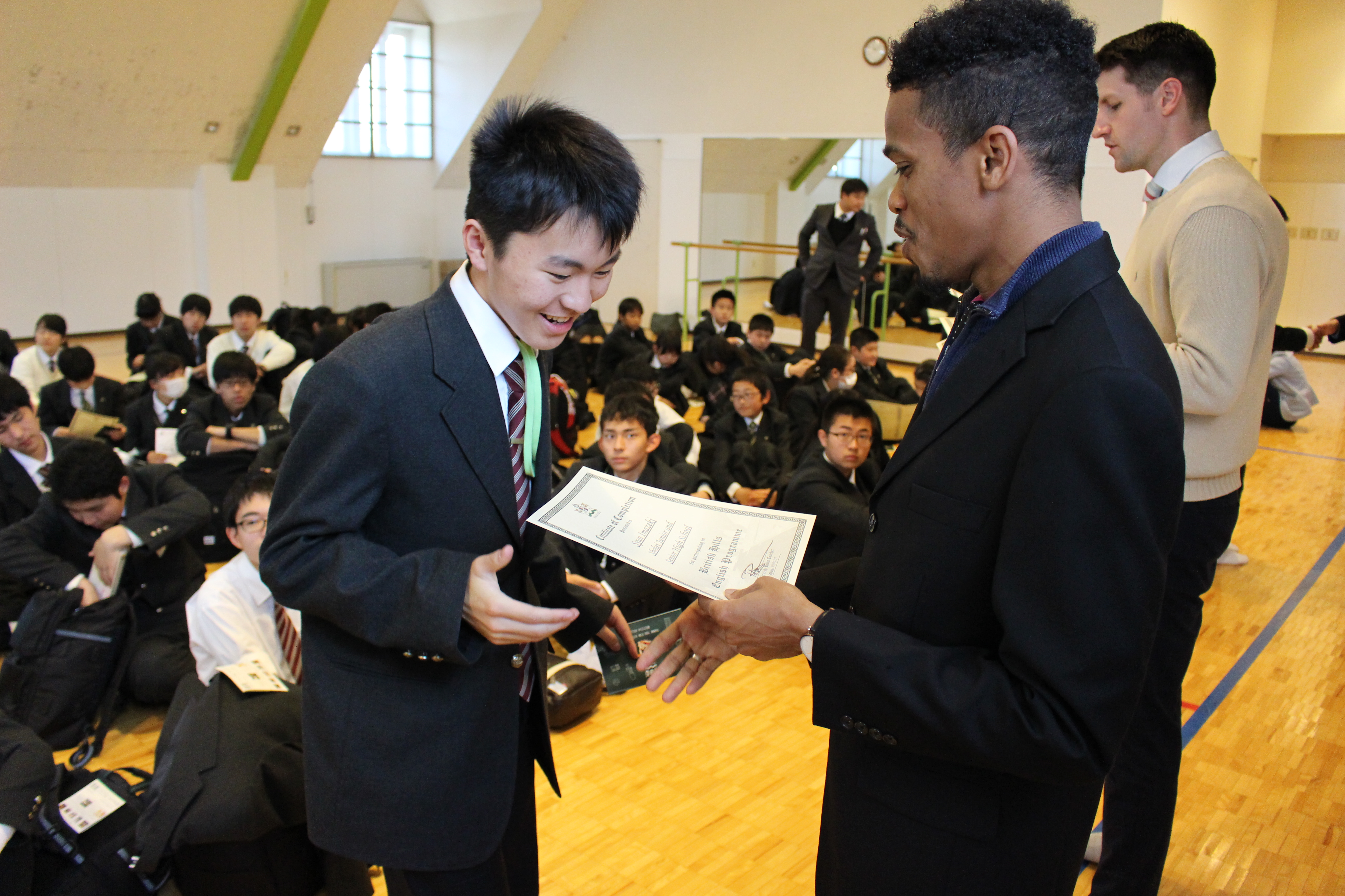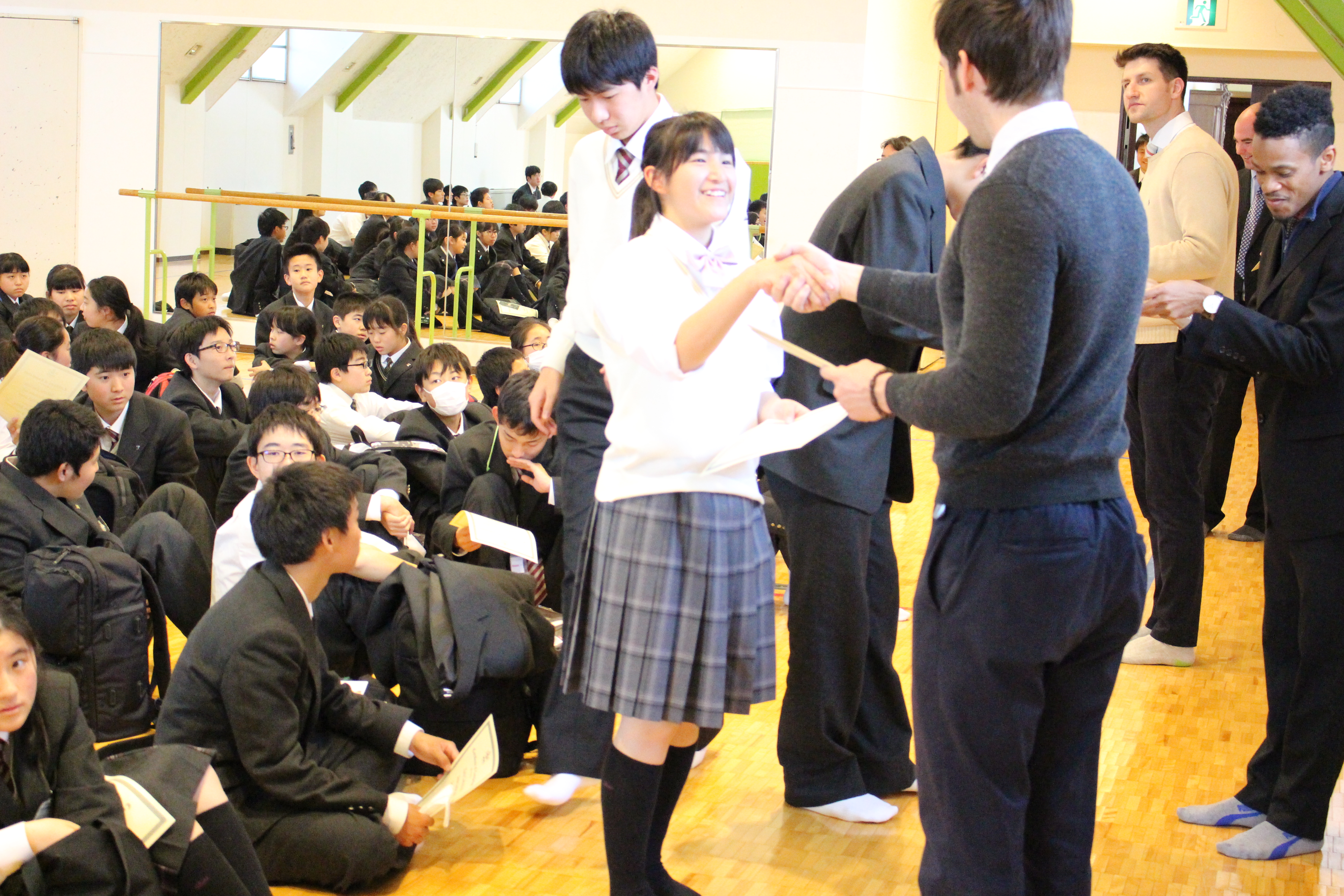 ブリティッシュヒルズ語学研修は最終日を迎え、最後のレッスンとクロージングセレモニー(修了式)で幕を閉じました。2泊3日は参加生徒たちにとって本当にあっという間だったようで、口々に「帰りたくない」という声が聞かれました。最後のレッスンではグループ5~7で自分たちで作った英文を使ったスピーチが行われ、各グループの3位までが表彰されました。人に自分の考えを伝え、理解してもらうということは英語のみならず、日本語においてもとても大切なスキルです。修了式では一人ずつ先生方から修了証を受け取り、レッスンの感想などを聞かれていました。今回の参加を通じて、英語を学ぶことの意義だけでなく、本当の意味でコミュニケーションをとれるということの大切さを感じてくれたらと思います。この語学研修をどう自分に生かしていくかが本当の学びです。この語学研修で得たことをこれからの学校生活に生かしてほしいと思います。