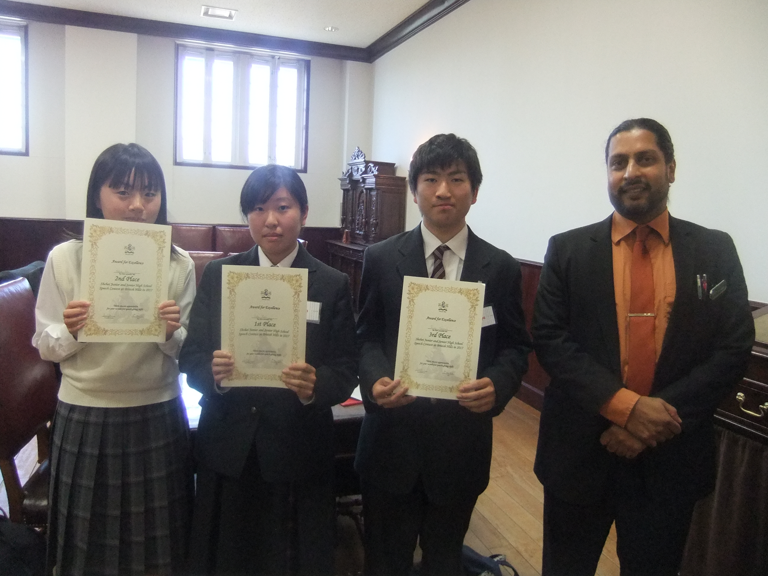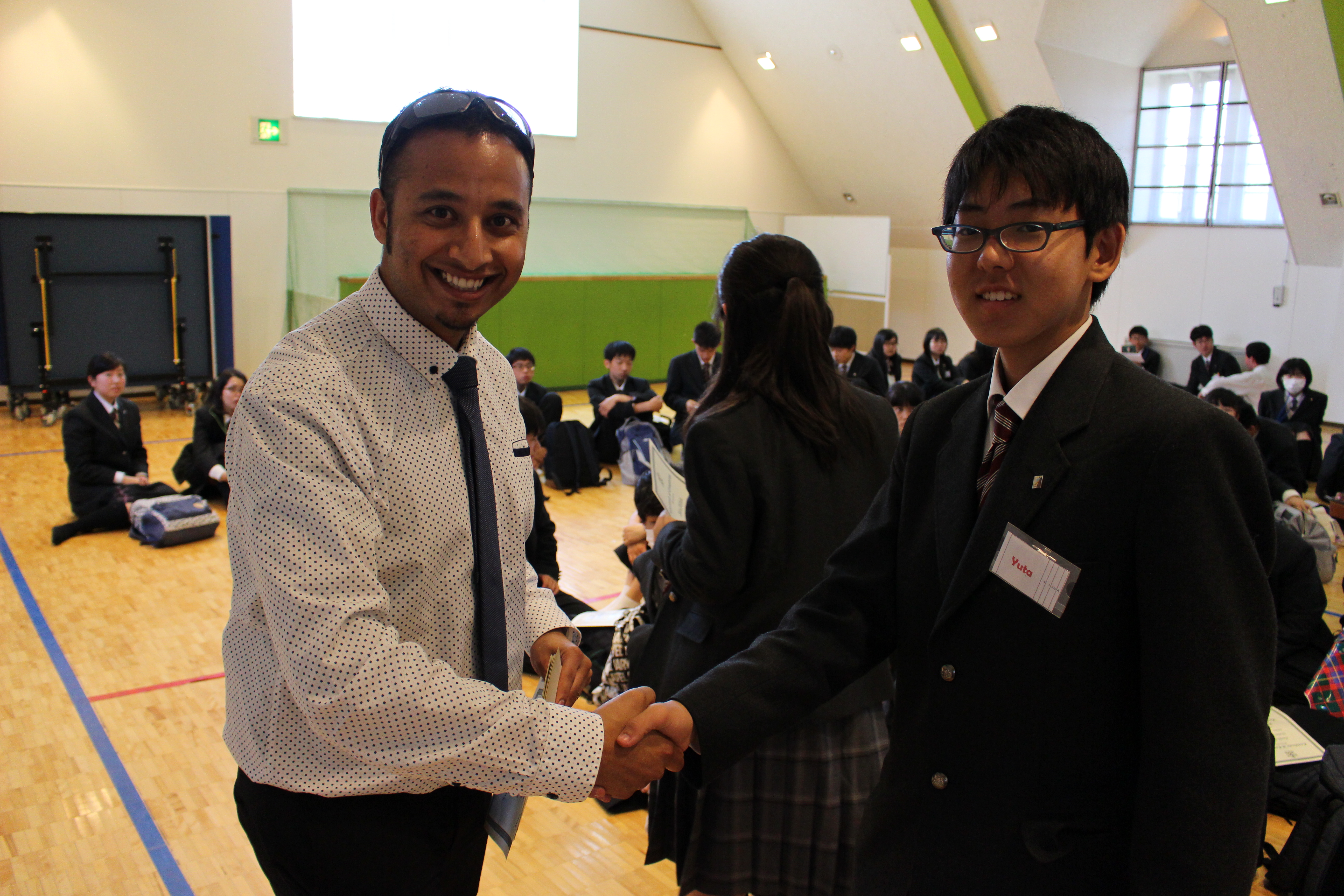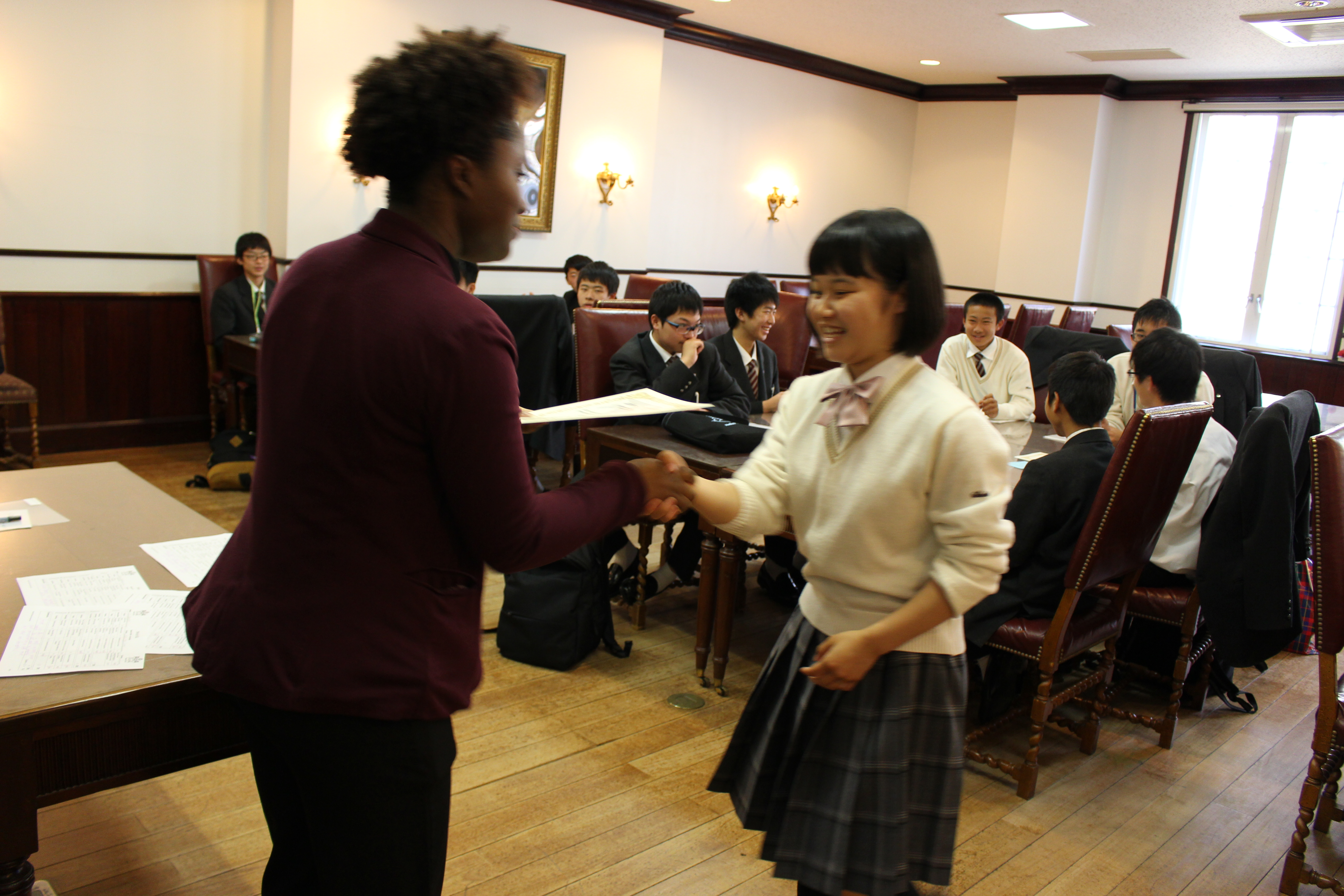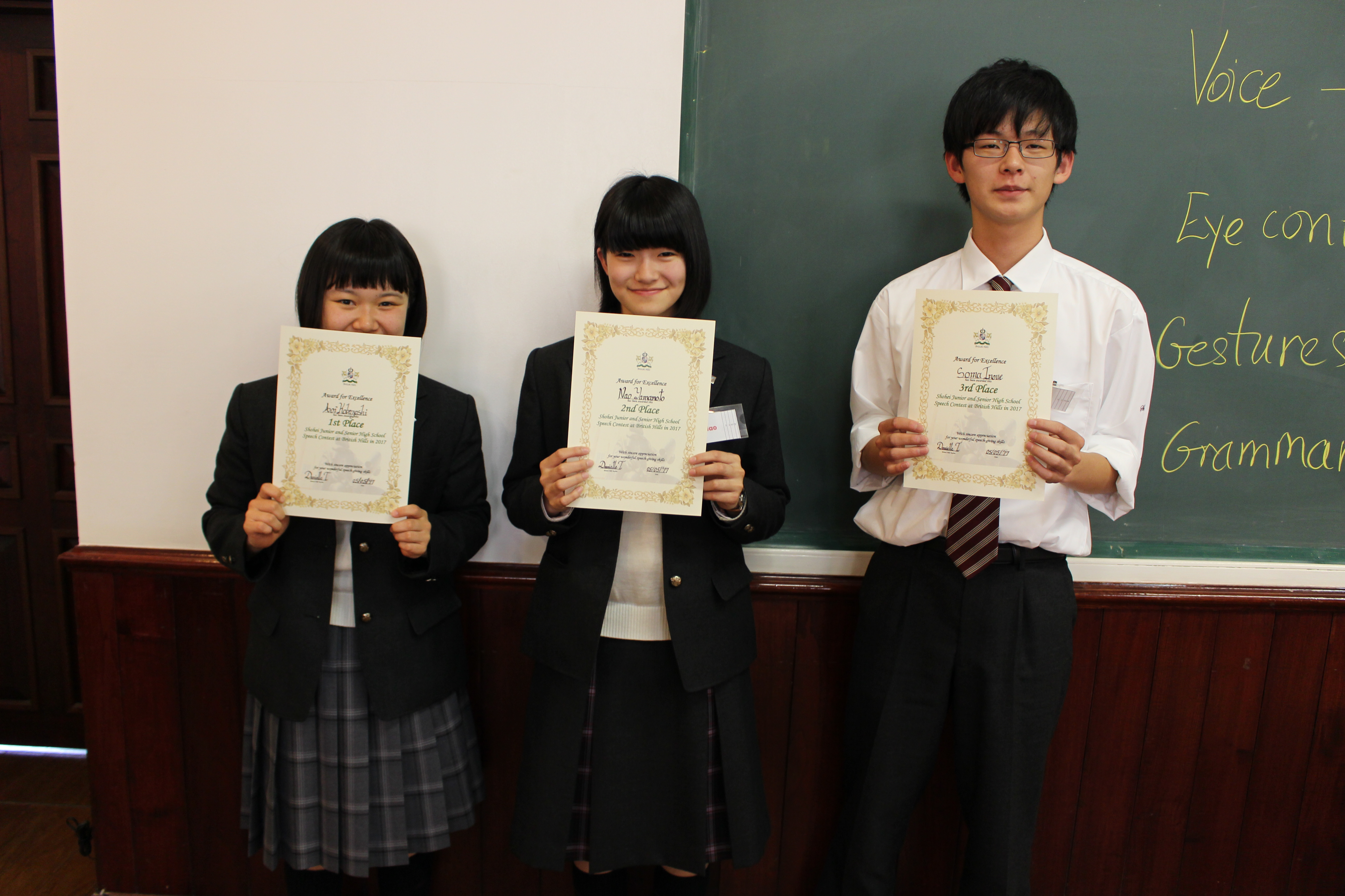 ブリティッシュヒルズ語学研修は最終日を迎え、最後のレッスンとクロージングセレモニー(修了式)で幕を閉じました。2泊3日は参加生徒たちにとって本当にあっという間だったようで、口々に「帰りたくない」という声が聞かれました。最後のレッスンではグループ5~7で自分たちで作った英文を使ったスピーチが行われ、各グループの3位までが表彰されました。人に自分の考えを伝え、理解してもらうということは英語のみならず、日本語においてもとても大切なスキルです。修了式では一人ずつ先生方から修了証を受け取り、レッスンの感想などを聞かれていました。今回の参加を通じて、英語を学ぶことの意義だけでなく、本当の意味でコミュニケーションをとれるということの大切さを感じてくれたらと思います。この語学研修をどう自分に生かしていくかが本当の学びです。この語学研修で得たことをこれからの学校生活に生かしてほしいと思います。