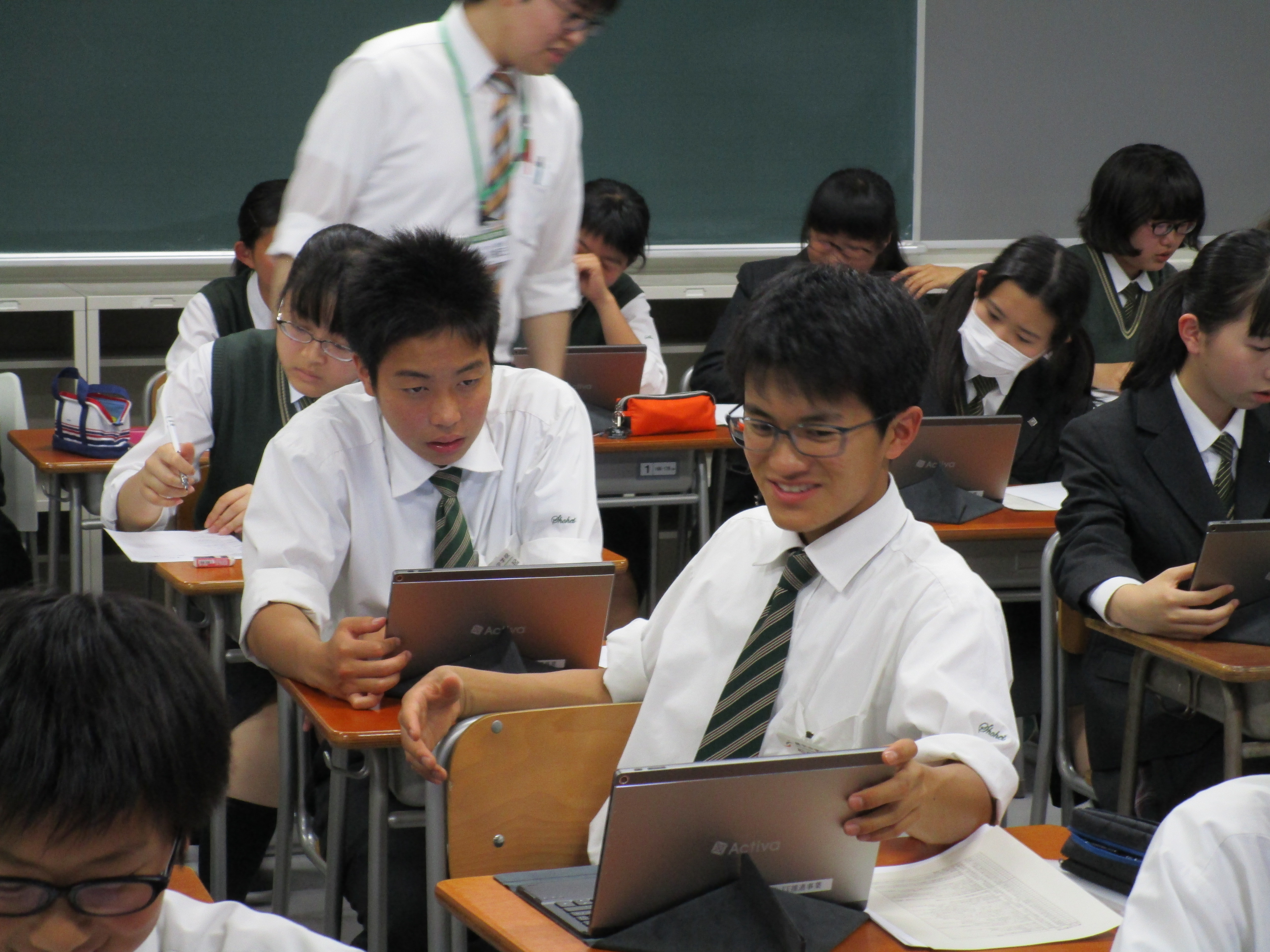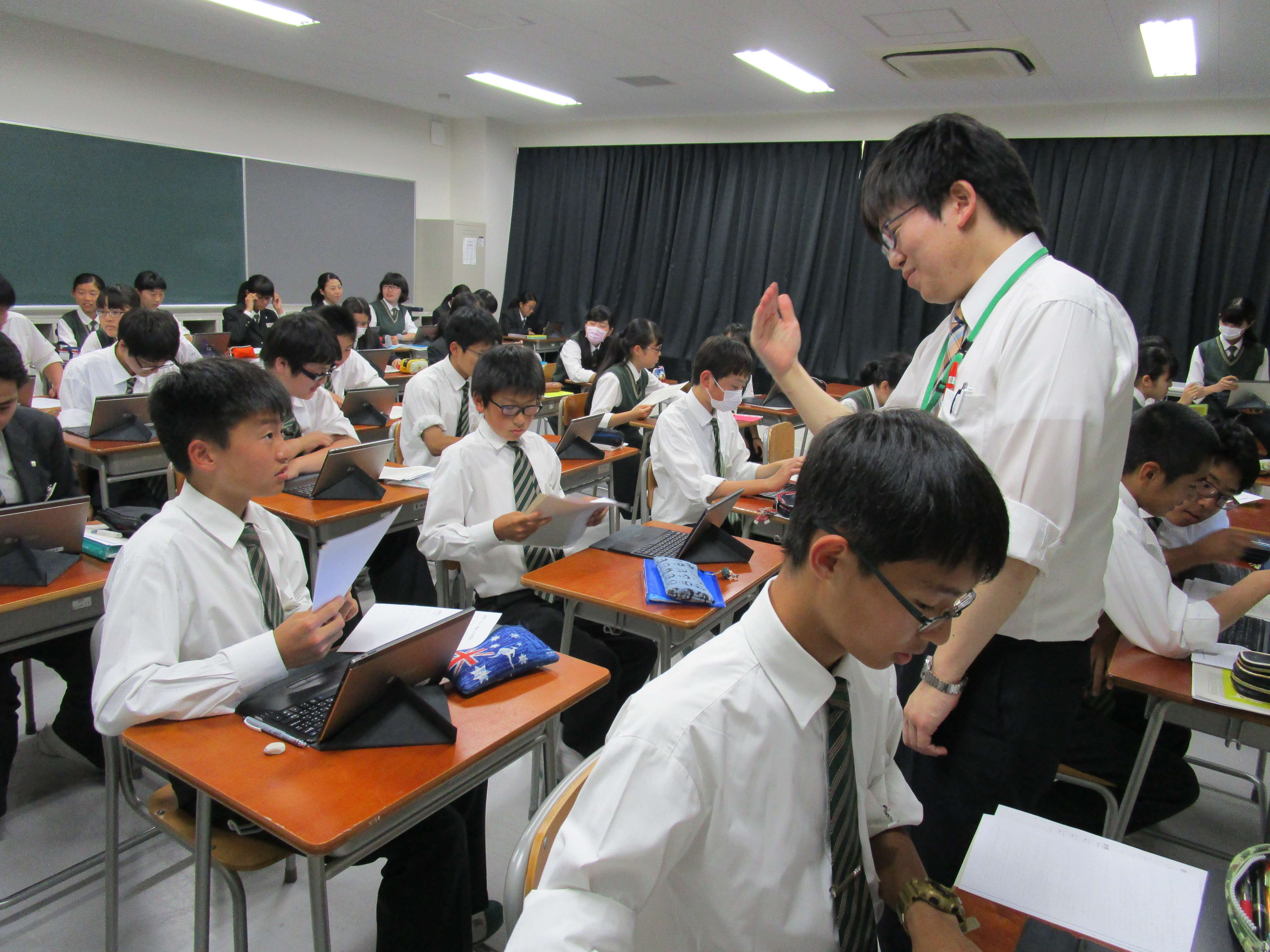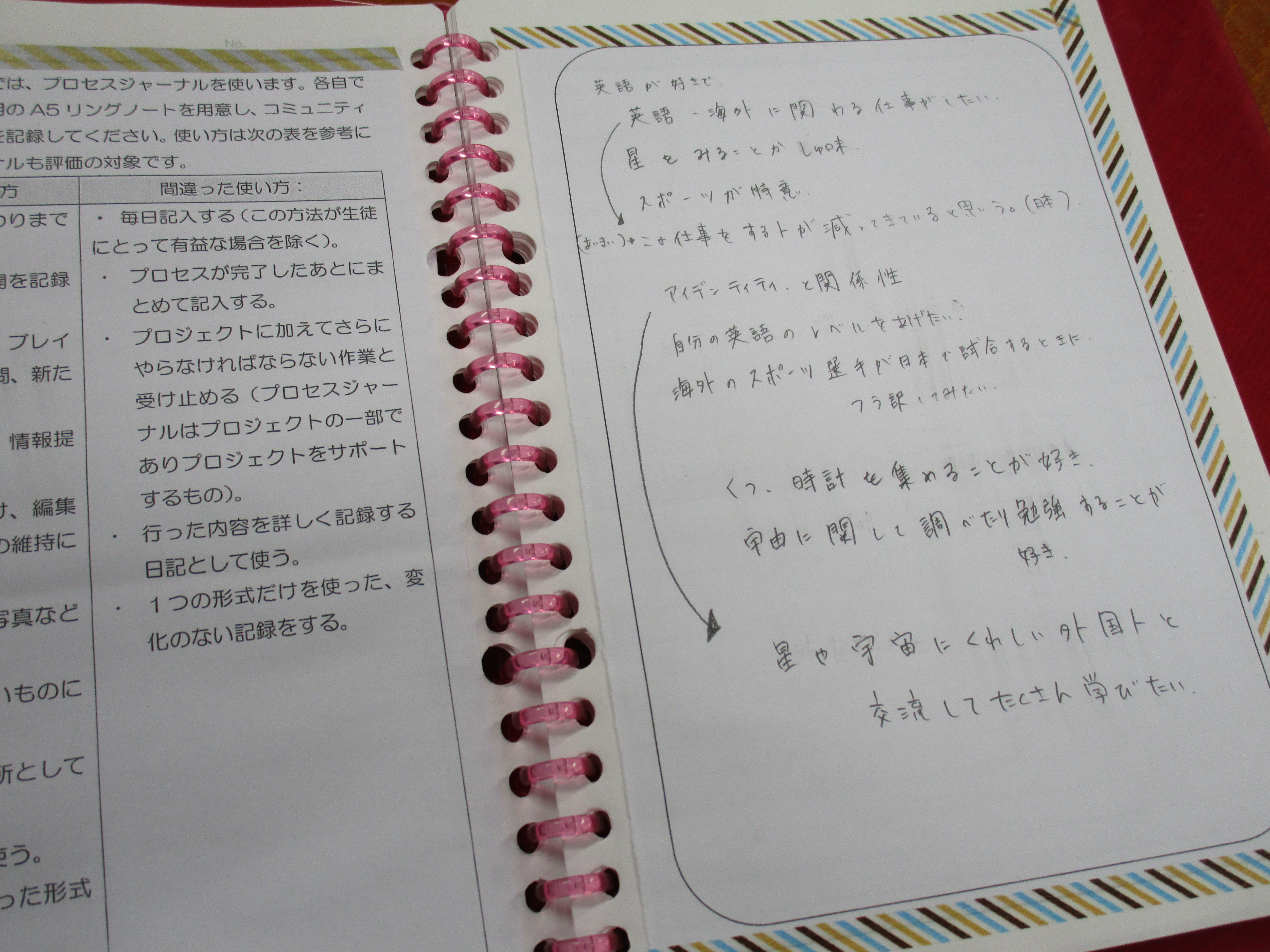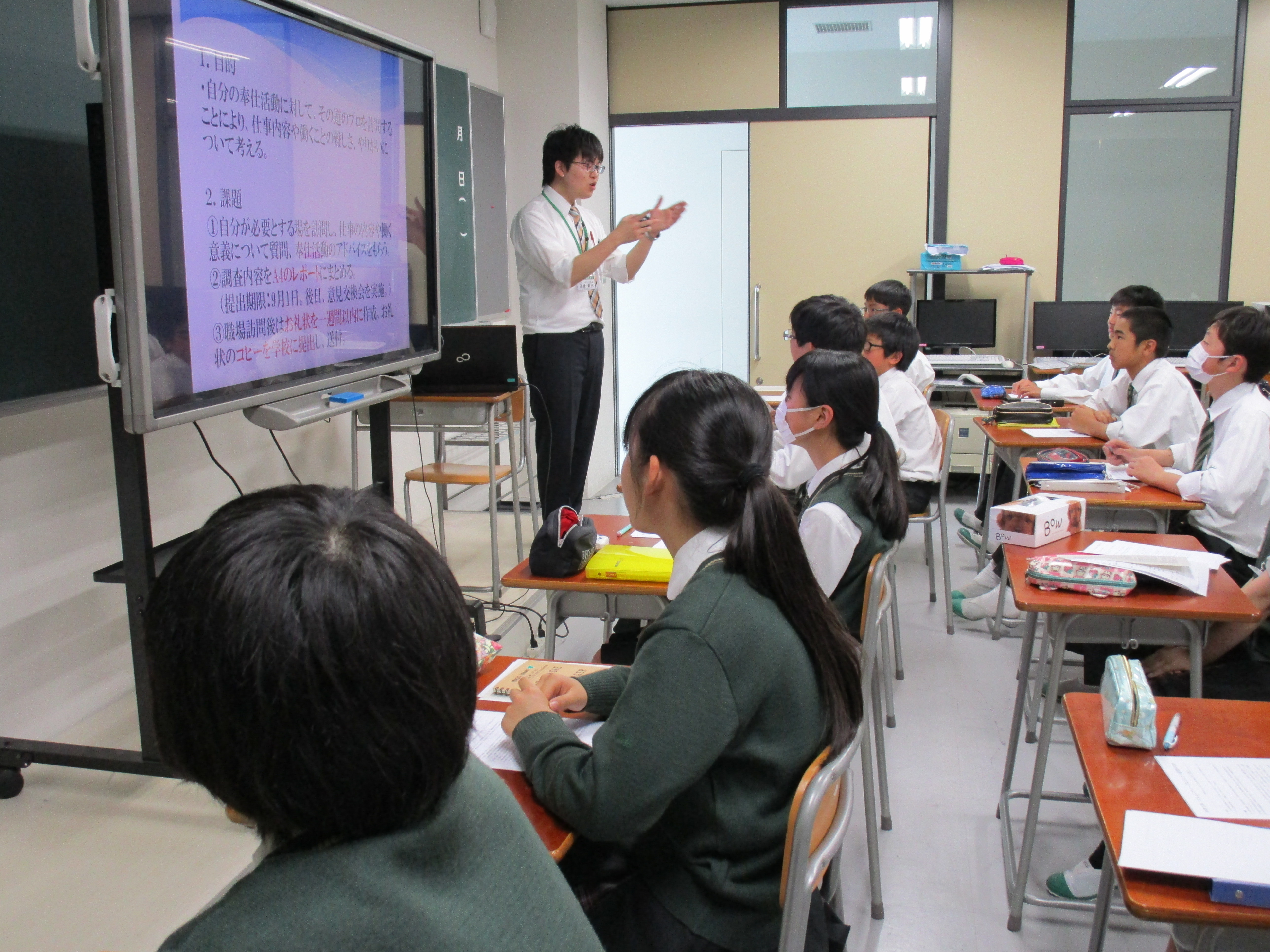 IB(国際バカロレア)の中等教育課程は中学3年生で修了します。最後の1年間で3年生は奉仕活動を自分達で考え実施します。自分の興味や将来につながる分野について友達と話し合い、アドバイスし合います。その話し合いをもとにその分野において社会に役に立つことを考えて奉仕活動の実施につなげていきます。プロセスジャーナルというノートを用意し、活動の計画、話し合ったこと、もらったアドバイスなどすべて記録に残しています。夏休みには自分の奉仕活動についてさらに考えを深めるために、その分野のプロを探し訪問します。先生からビジネスマナーなどの話を聞きましたが、電話でのアポイントメントやお礼状など、大人には常識なことも生徒達にとって初めて知ることも多かったようです。すべて自分達で考え動いていきます。まさに社会へ足を踏み出す第1歩です。
