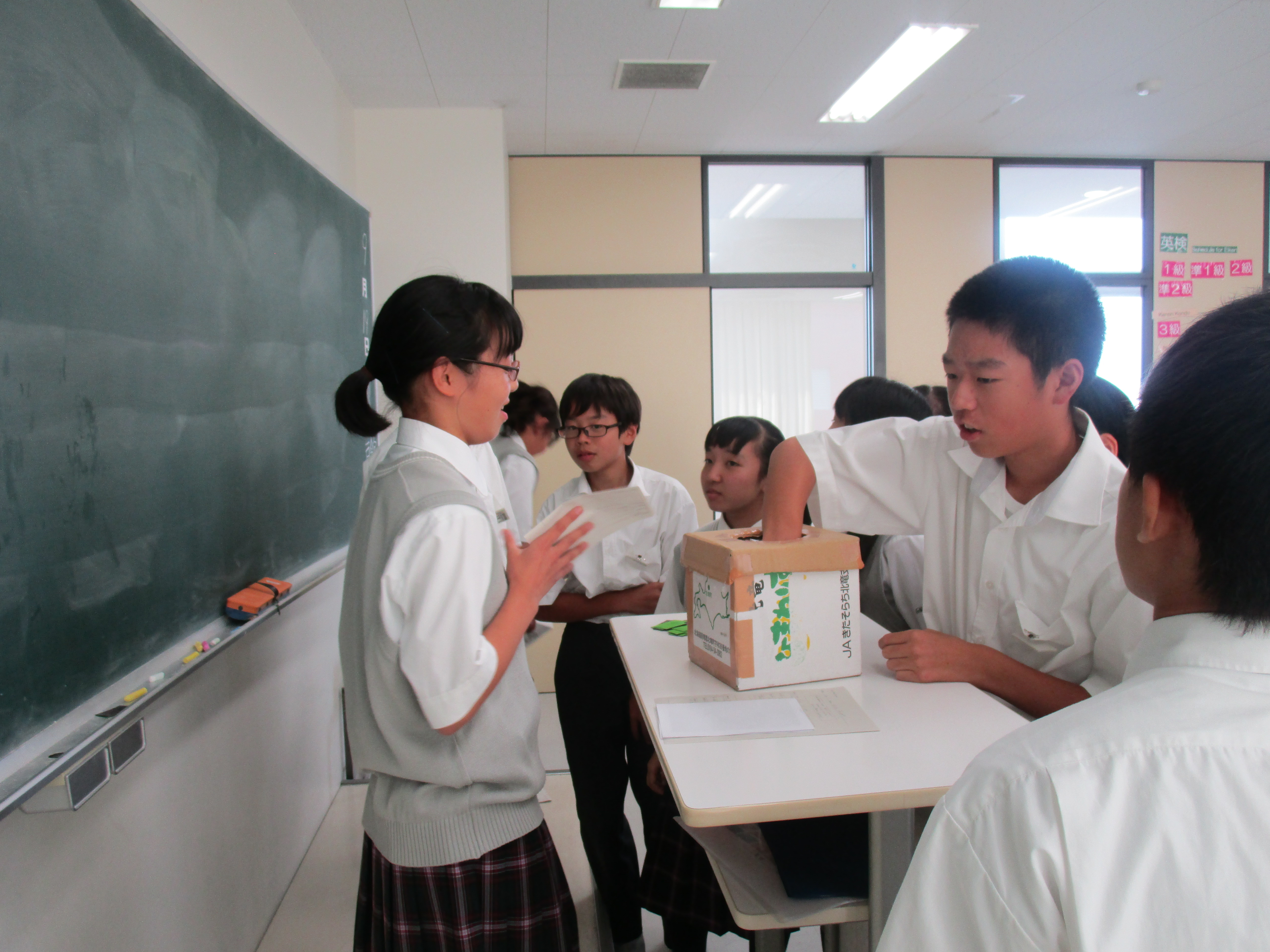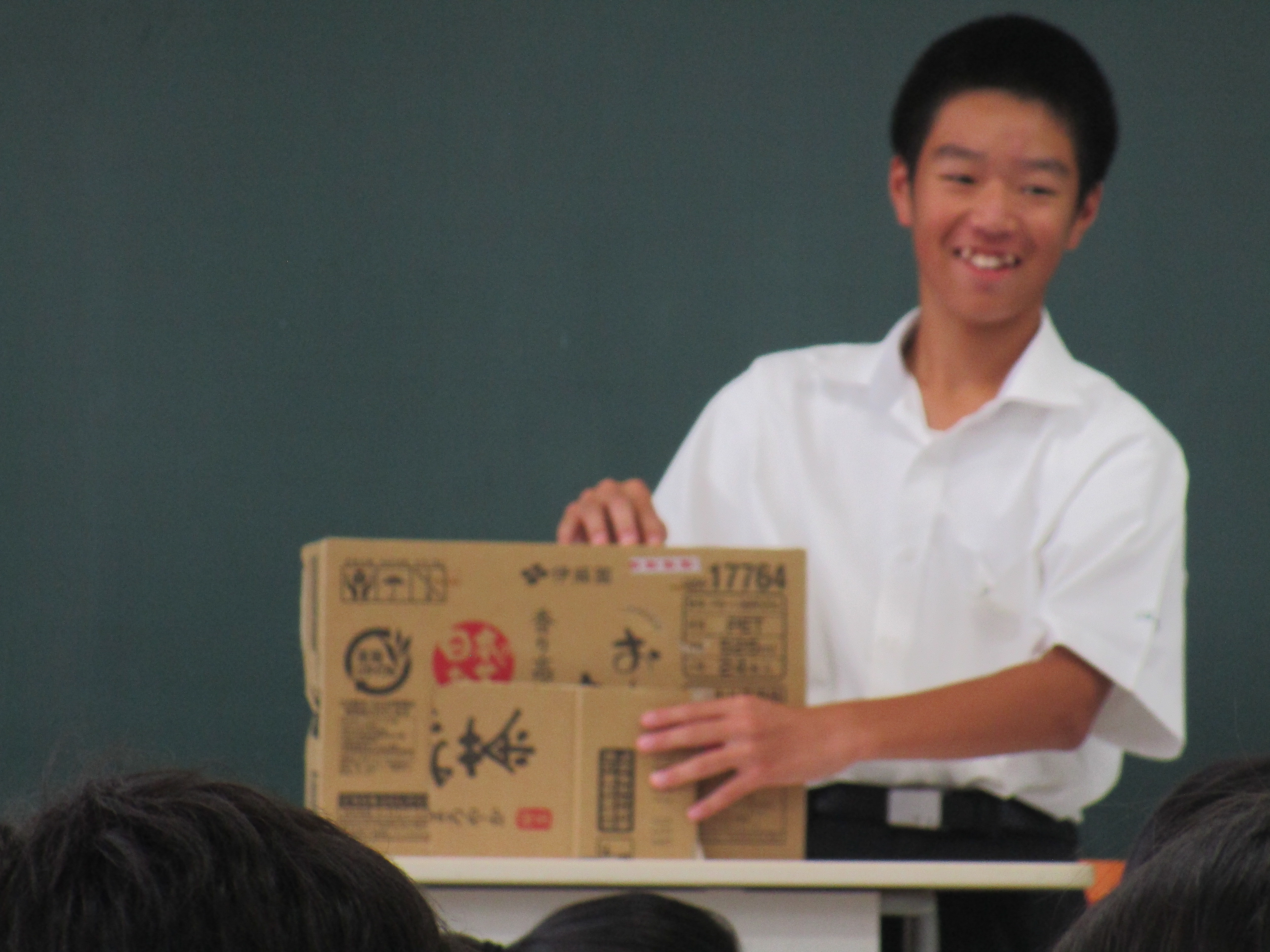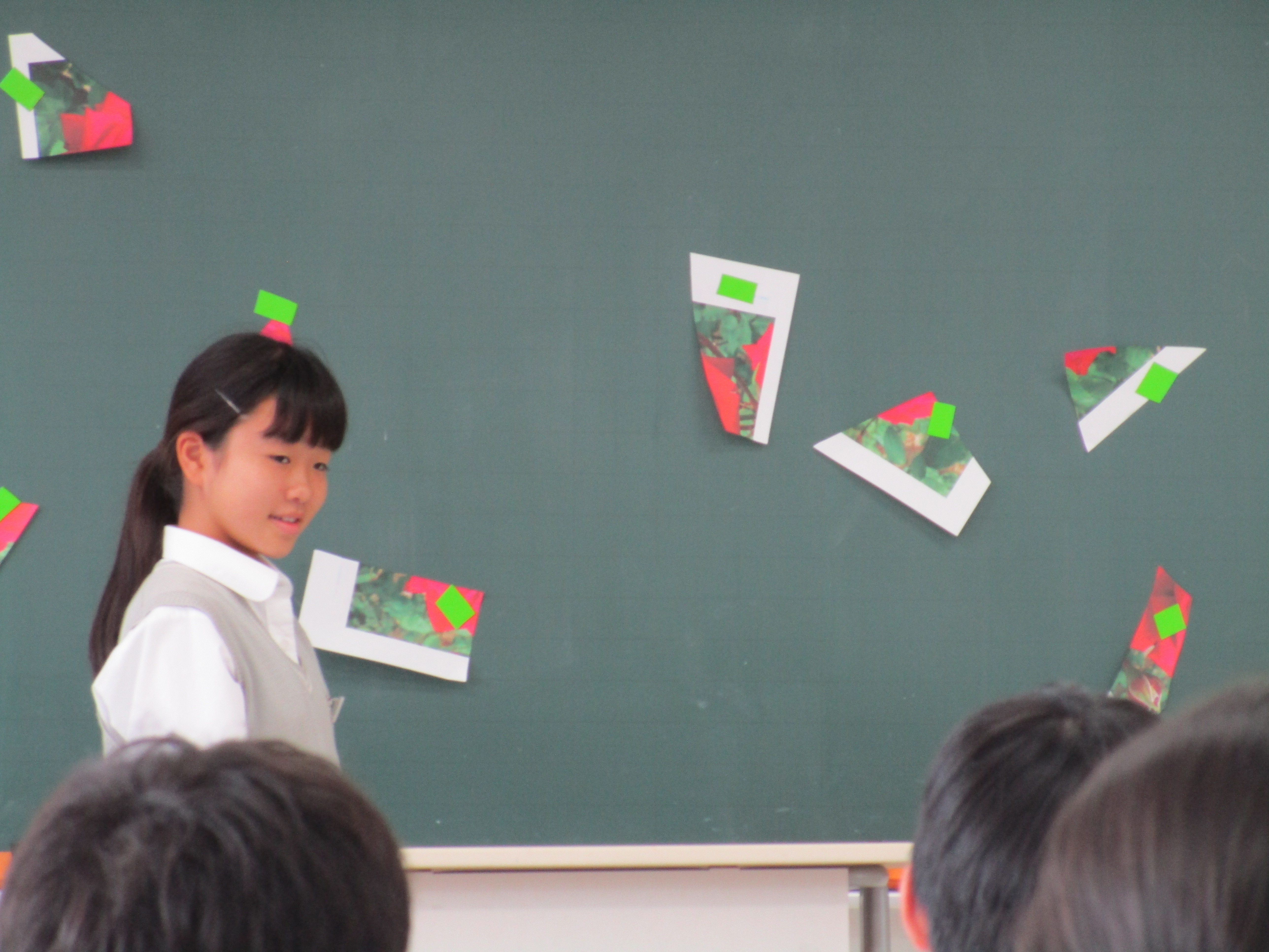 1年生は学習したwhatやwhoを使ってクイズを考え、グループごとに出しました。英語を使ってクイズとヒントを出したり、道具を用意してヒントに利用したりしました。なかなかの難問も多く、正答率は60%程度でした。グループでの「リーダー」「チェッカー」「アドバイザー」それぞれの役割に沿って練習を進め、よいプレゼンテーションになりました。