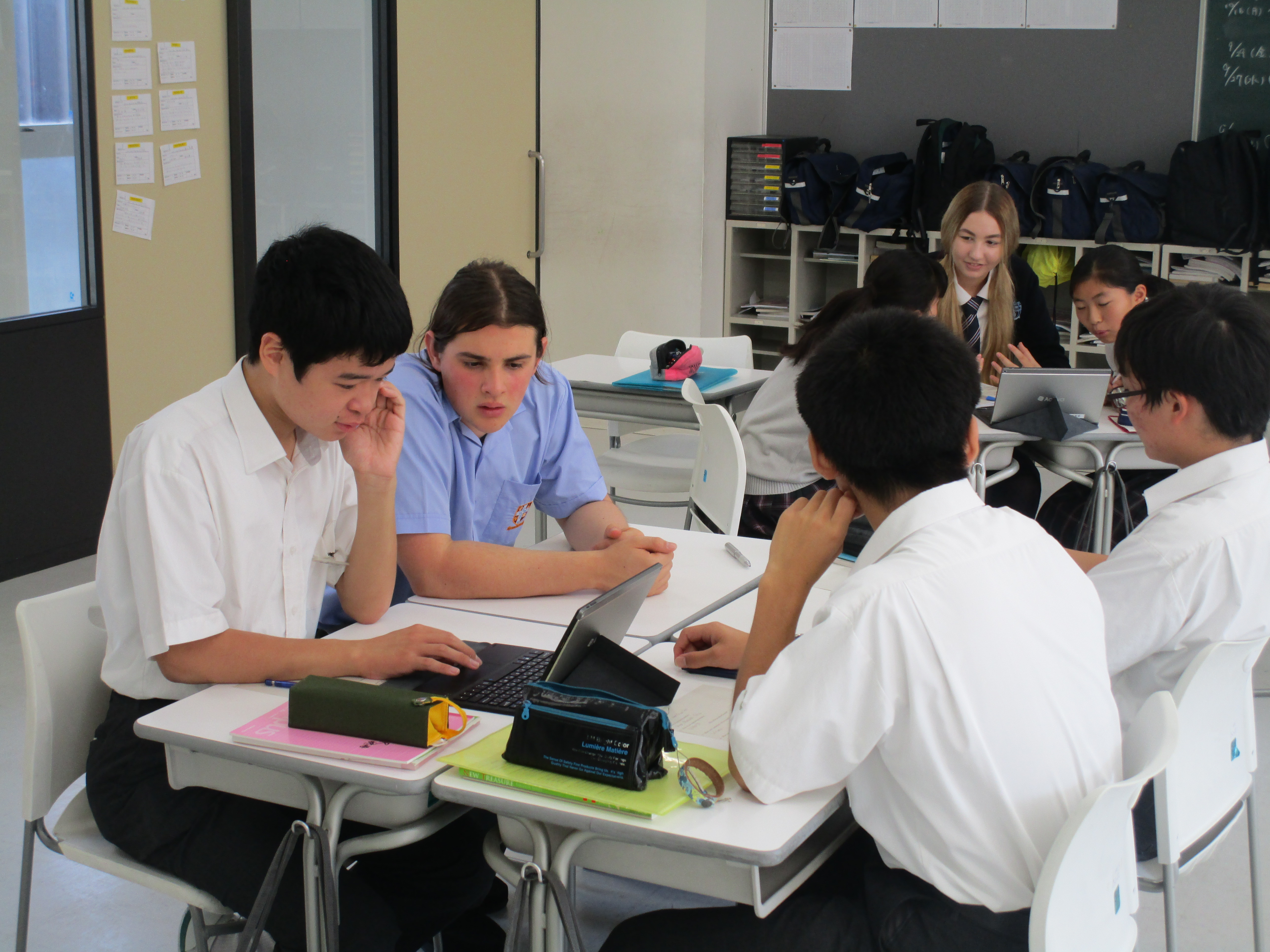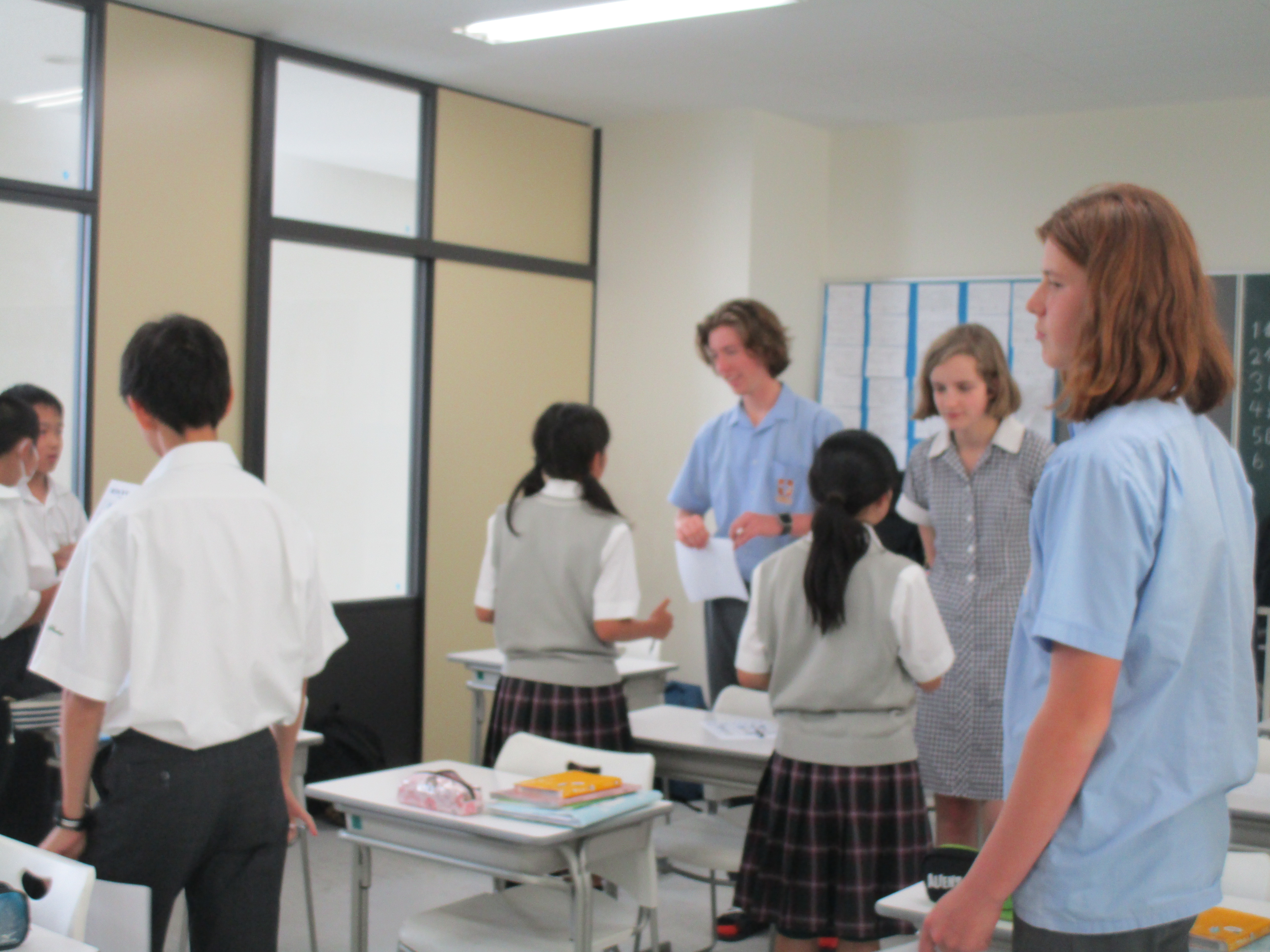 本日は登校初日でした。クラスに入ったり、いろいろな授業を体験しました。一緒にプレゼンテーションについて話し合ったり、中学1年生の会話練習に参加してくれたり、華道も体験しました。エニシダ、リンドウ、小菊を生け、素敵な作品が出来ました。