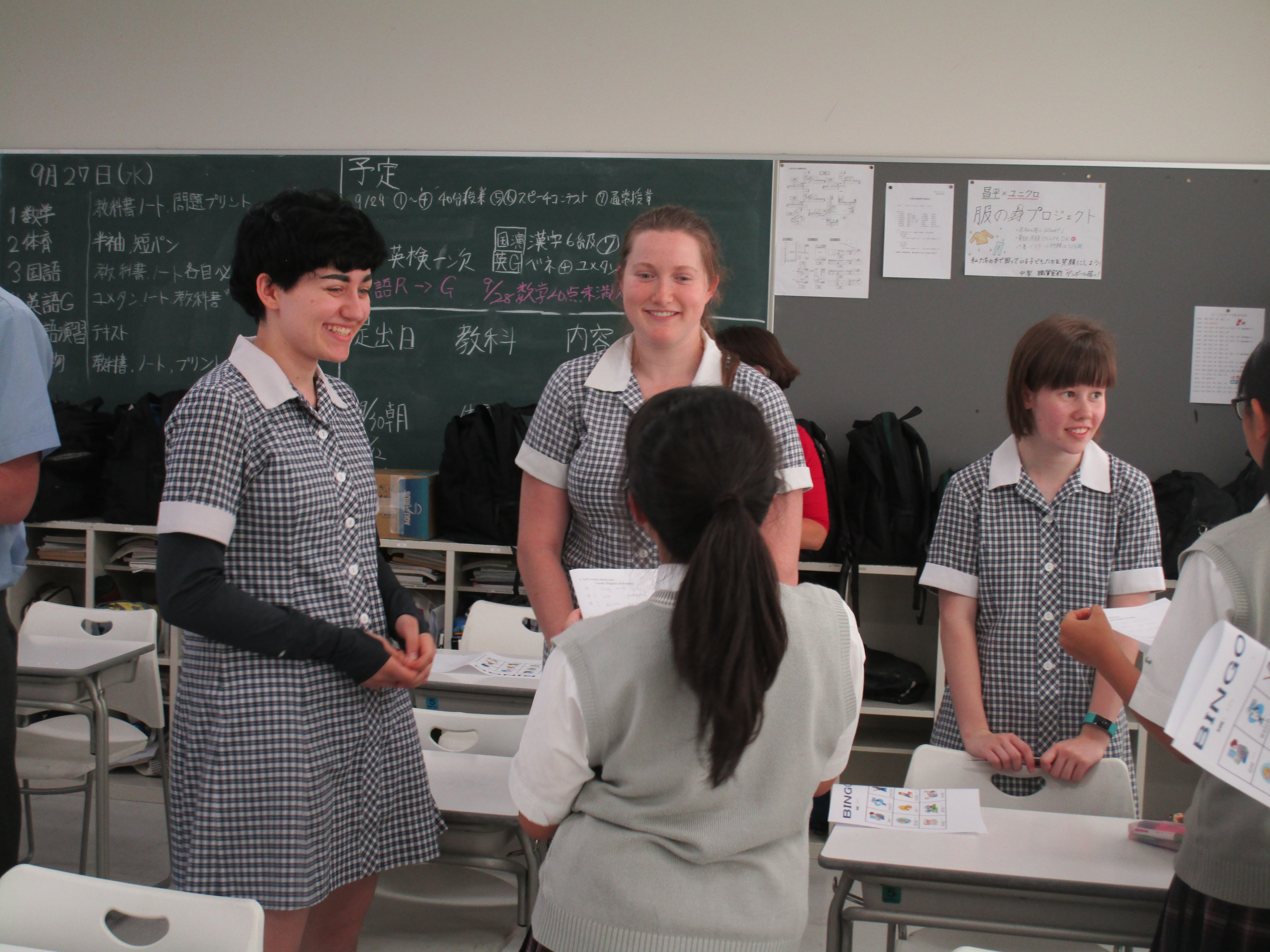 その後、華道の手伝いに来た中学3年生との笑い声あふれる交流もあり、楽しいひとときを過ごすことができました。本場の英語に触れ、積極的に交流しましょう。